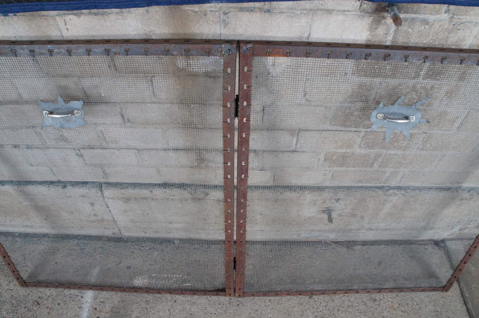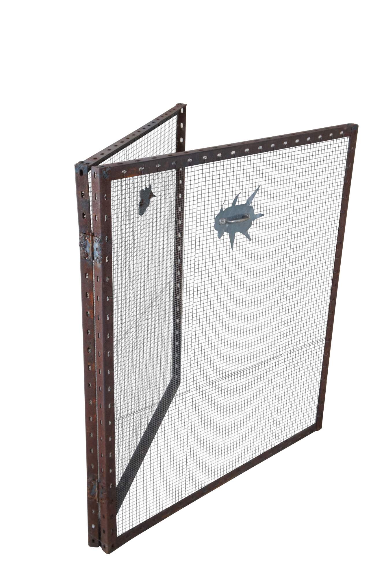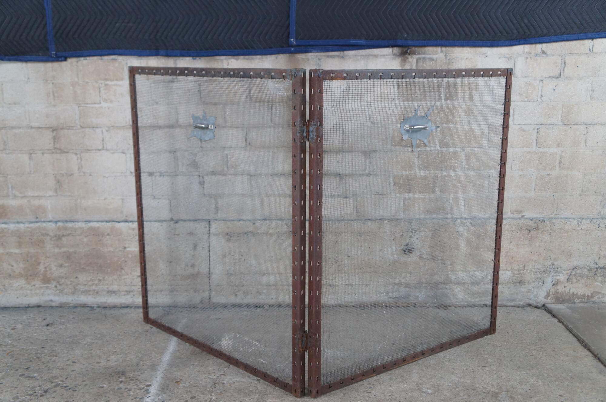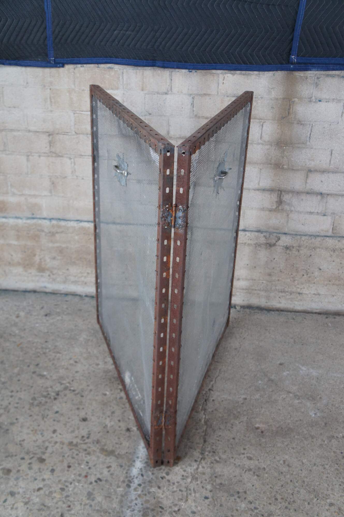 A large handmade folding fire screen. Made from iron with pierced frame and mesh center. Features handles towards the center.