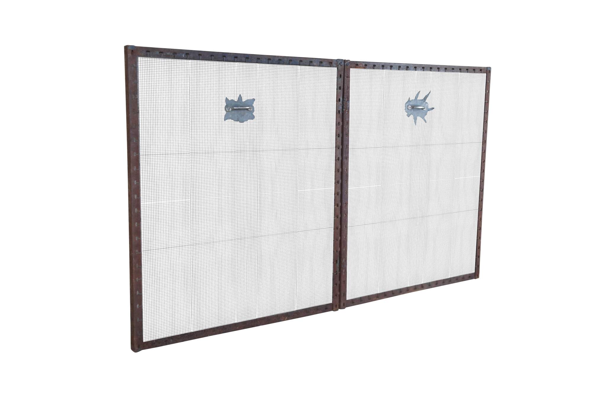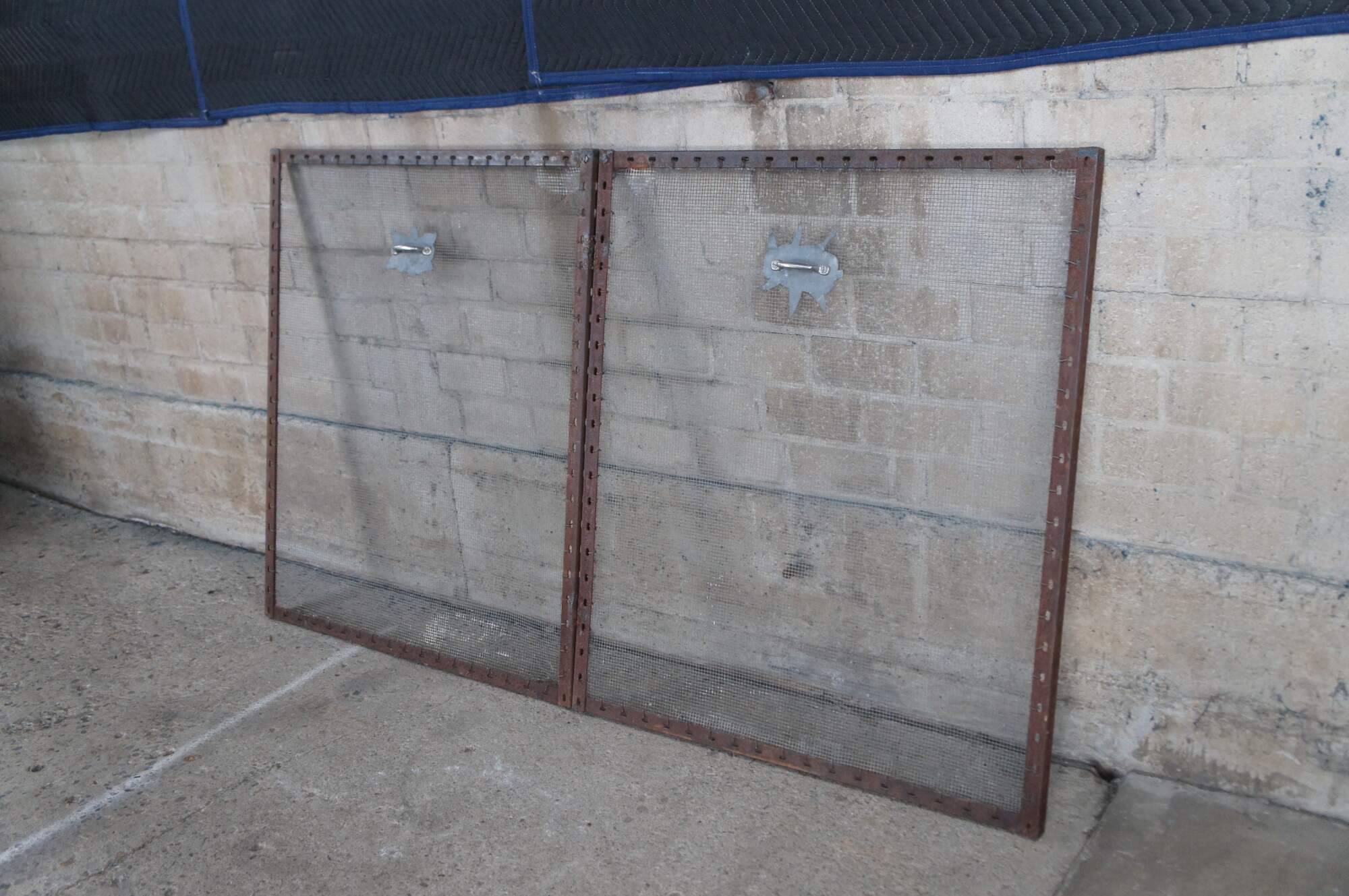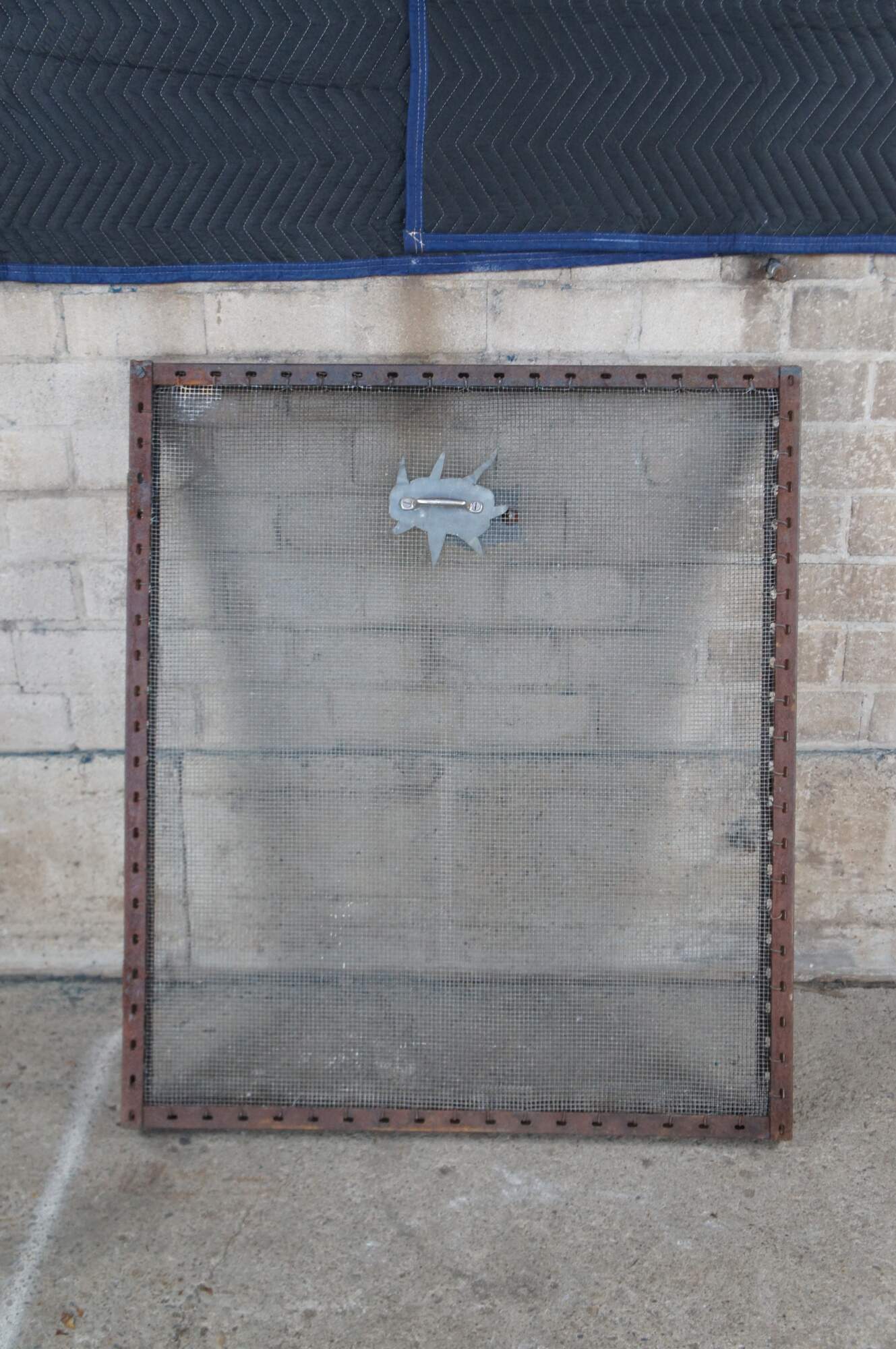 A large handmade folding fire screen. Made from iron with pierced frame and mesh center. Features handles towards the center.