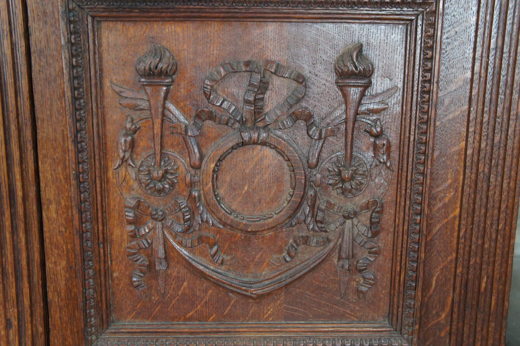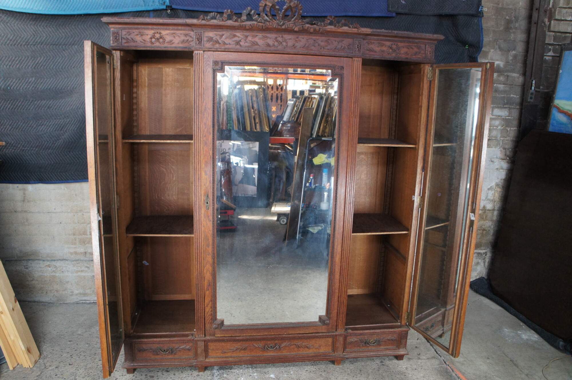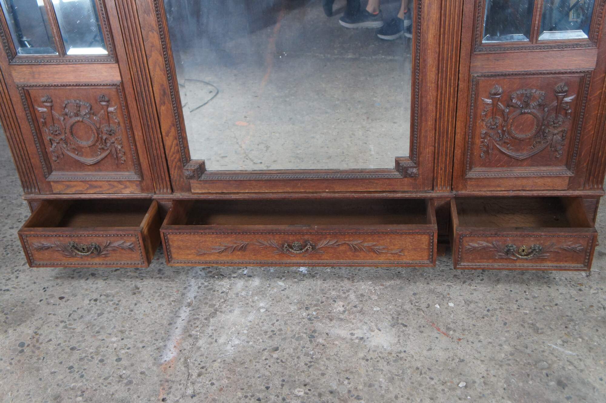 Exquisite antique 19th century French Louis XVI Knockdown Armoire. Made from solid oak / quartersawn oak with meticulous carving throughout. Features a three door mirrored front with large rectangular stepped center flanked by lattice design, all in beveled glass. The elegant front showcases fluted columns, French medallions and a neoclassical scene showcasing ribbons, torchieres, scrolling foliate and swag. Upper apron has ribbons flanked by an intertwined vine motif beneath a flowing serpentine pierced and carved ribbon and bow motif. This elaborate and large scale carving is rarely found in pieces from this period. The base opens to three hand dovetailed drawers for additional storage and the frame is supported by square tapered feet. Interior opens to mirrored doors and shelves along the outside. The large center is perfect for hanging garments. A remarkable cabinet that will make the perfect addition to any space.
