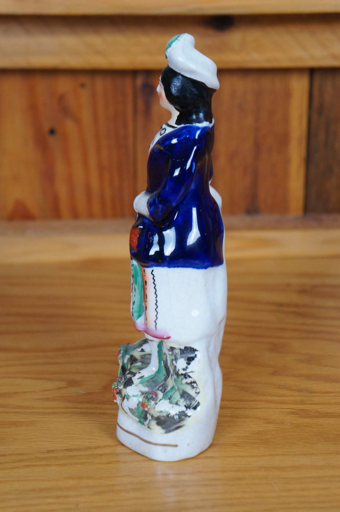 Antique 19th century Staffordshire porcelain flatback figurine depicting a Scottish highlander shepherd woman in a feathered hat, cobalt blue jacket and green and orange riding skirt / bloomers, against a mossy floral moitf.