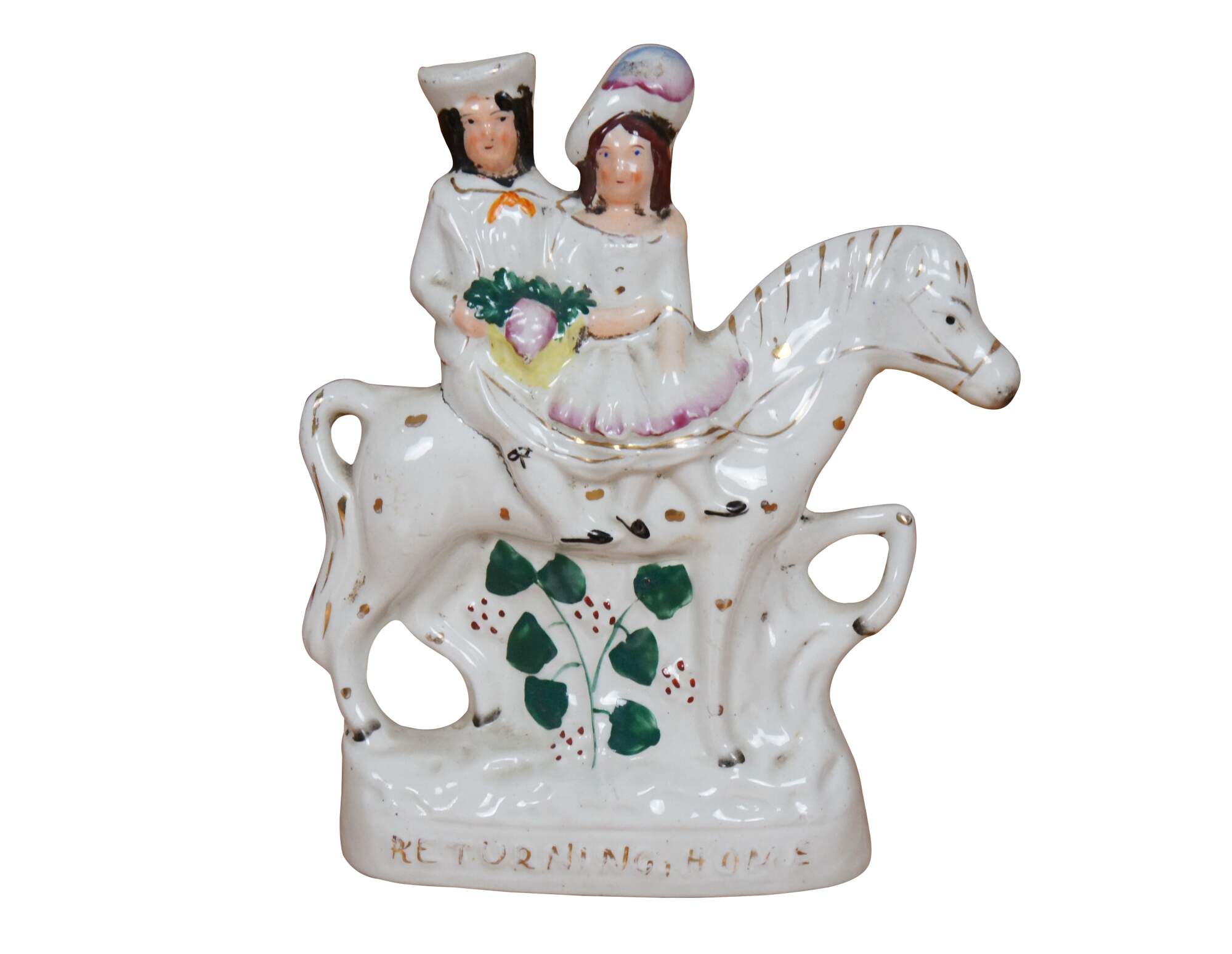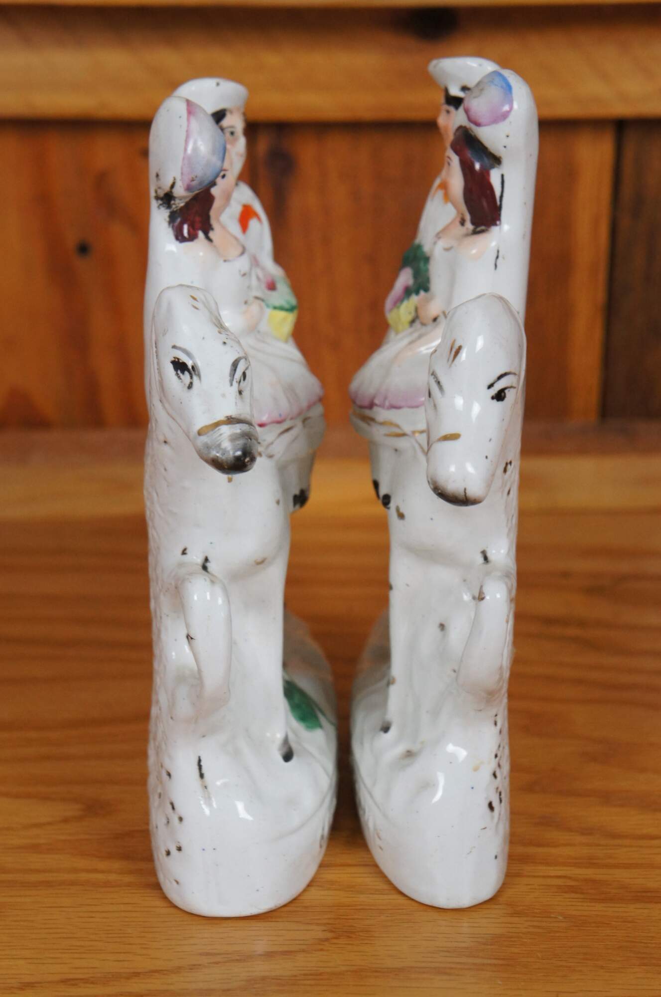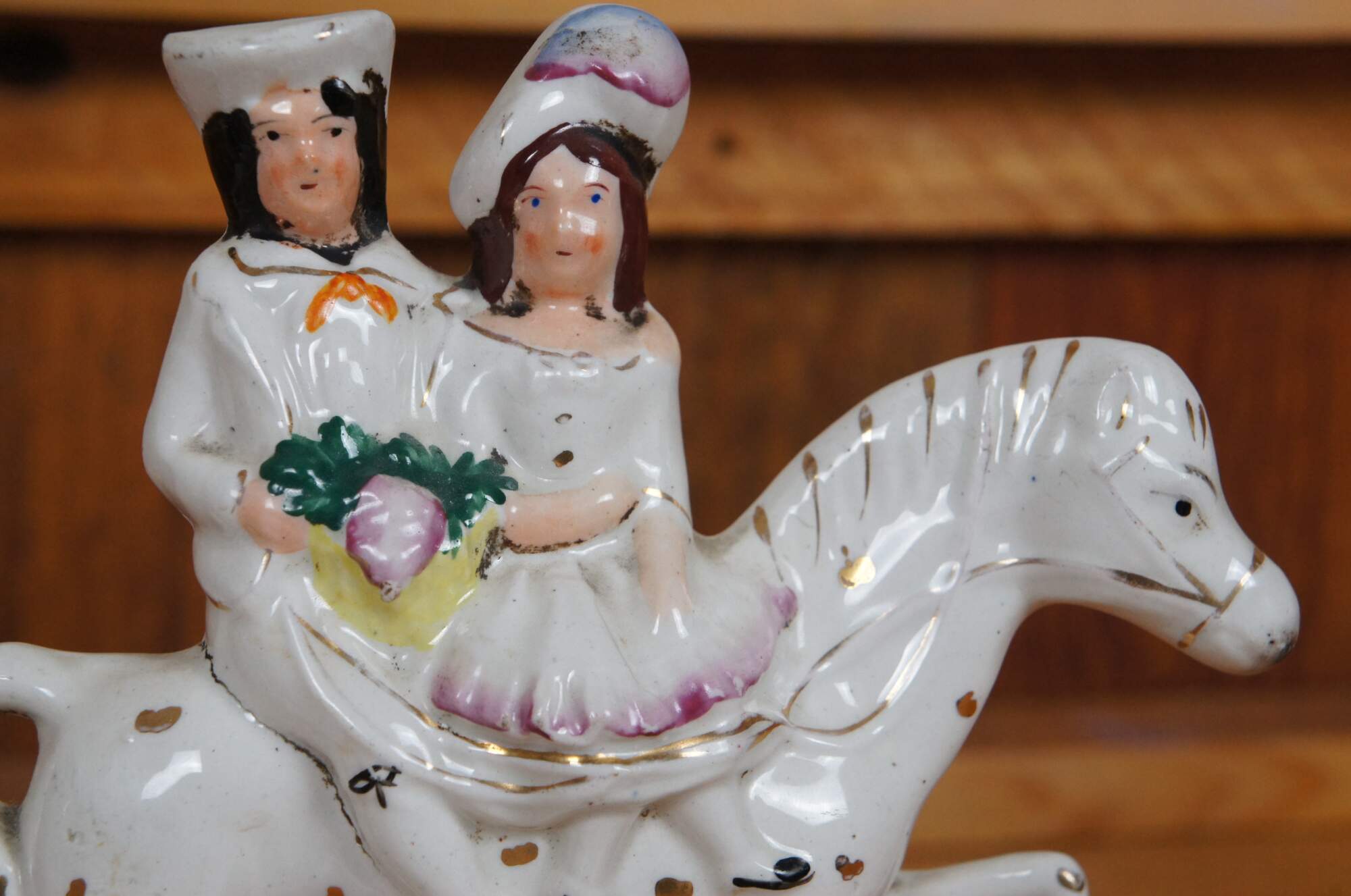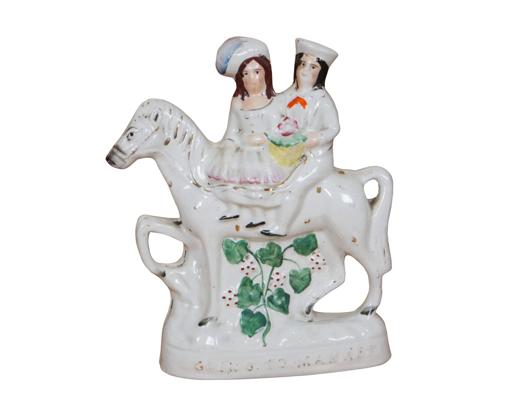 Pair of antique 19th century Staffordshire porcelain flatback equestrian mantel figurines titled "Going to Market" and "Returning Home." They depict a pair of male and female figures on a white horse holding a basket with a flower / turnip in it.