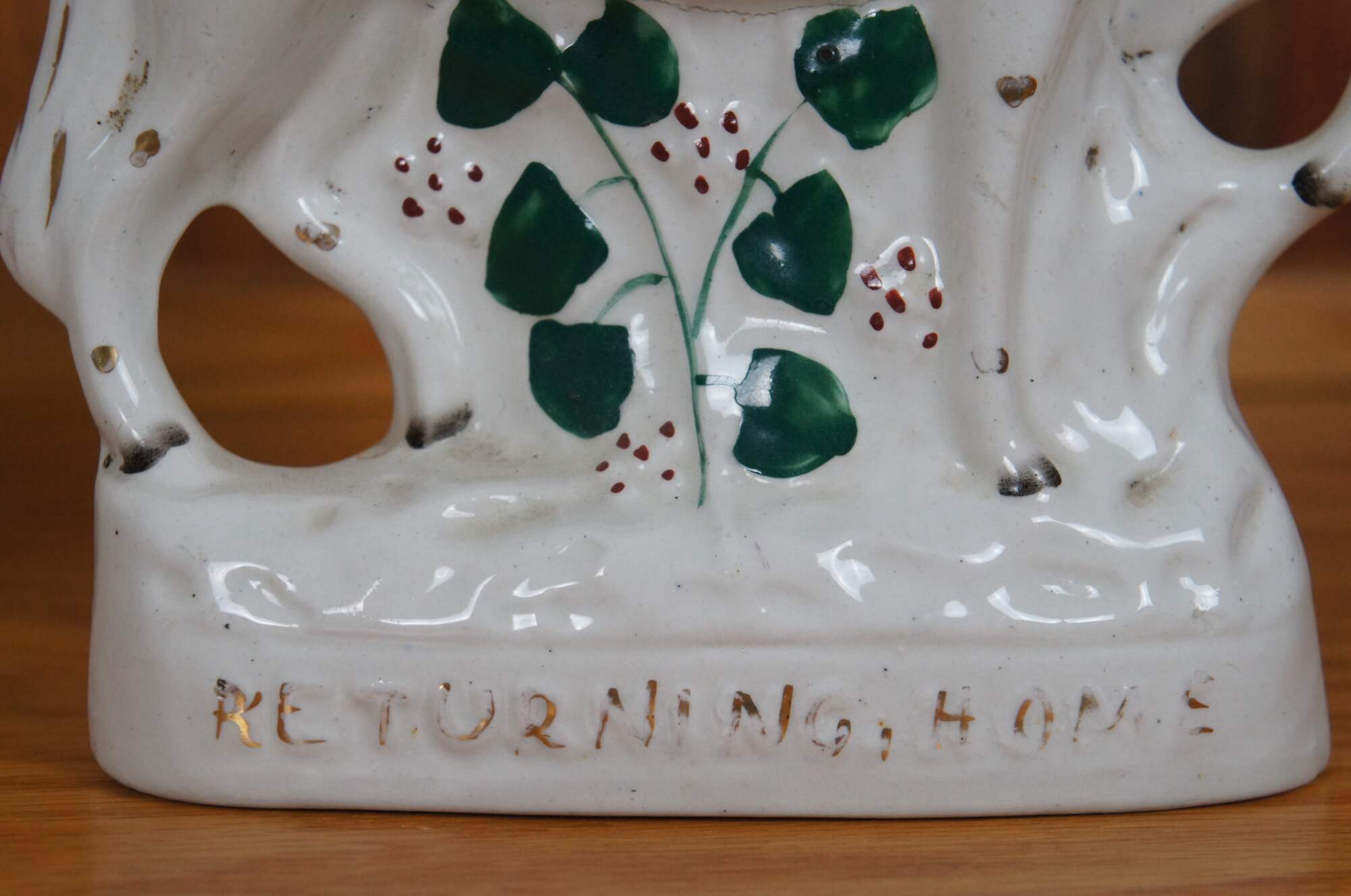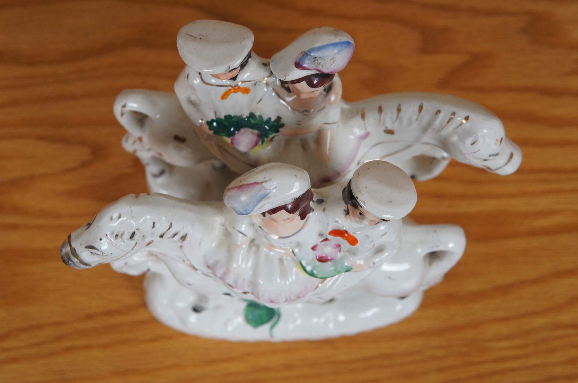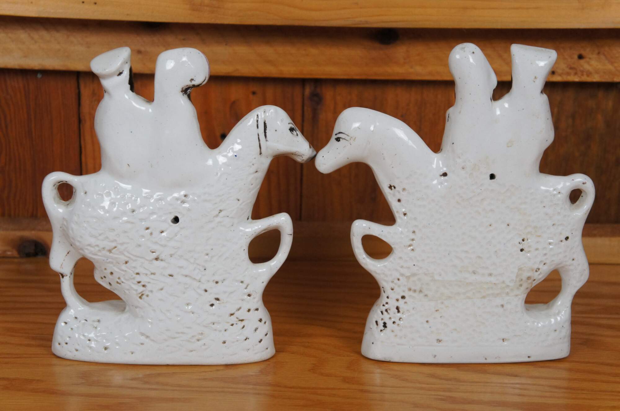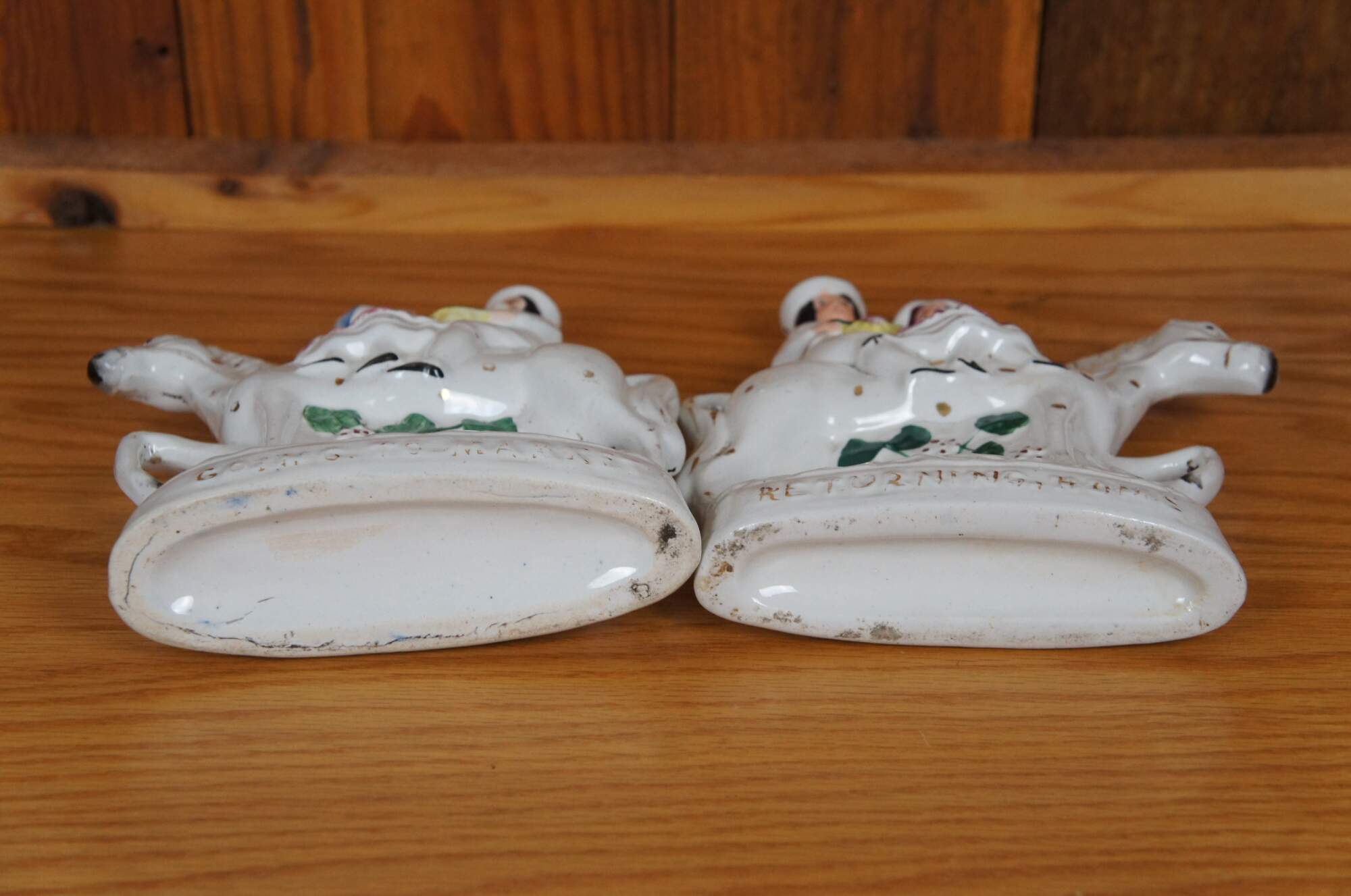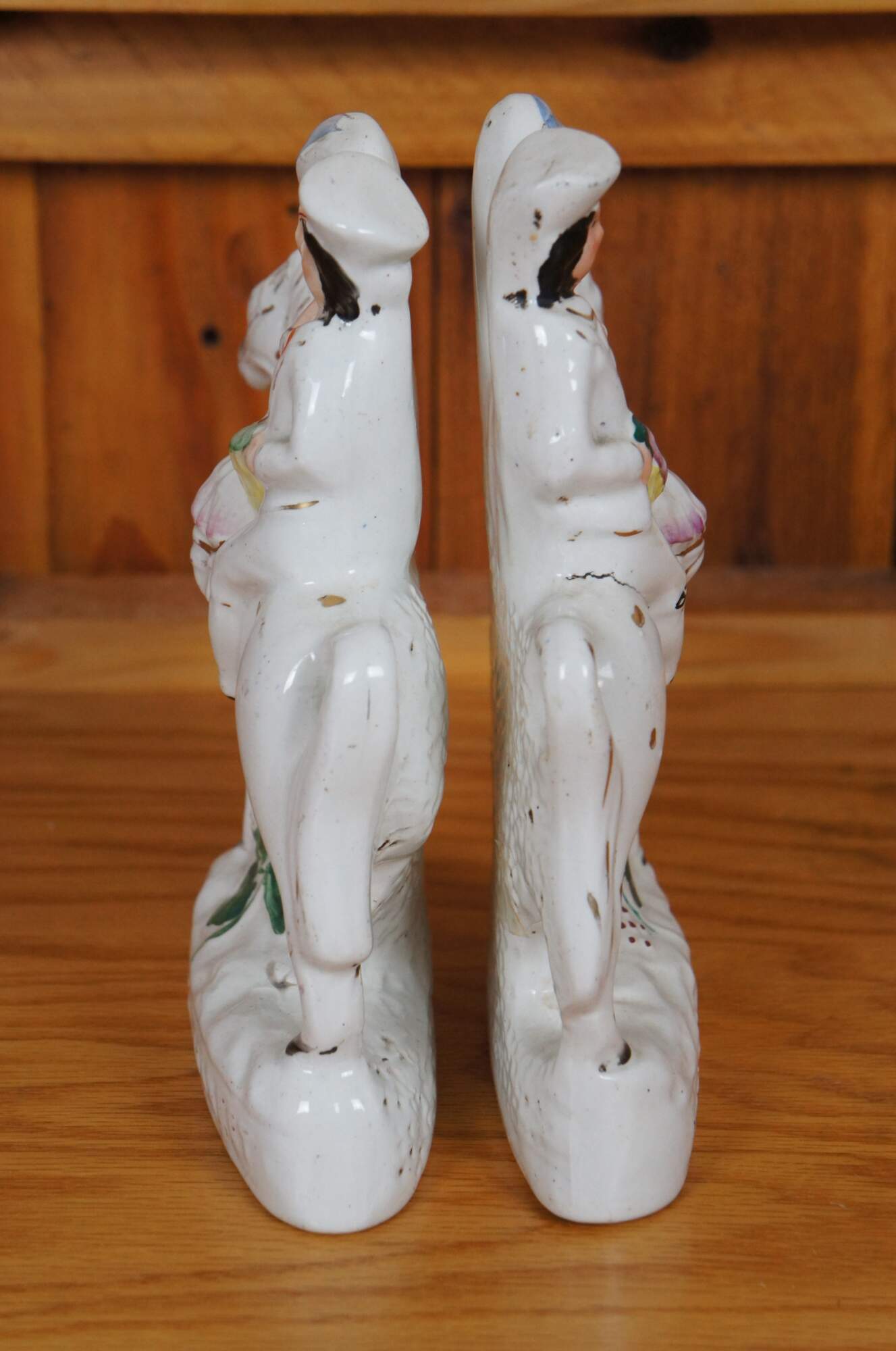 Pair of antique 19th century Staffordshire porcelain flatback equestrian mantel figurines titled "Going to Market" and "Returning Home." They depict a pair of male and female figures on a white horse holding a basket with a flower / turnip in it.