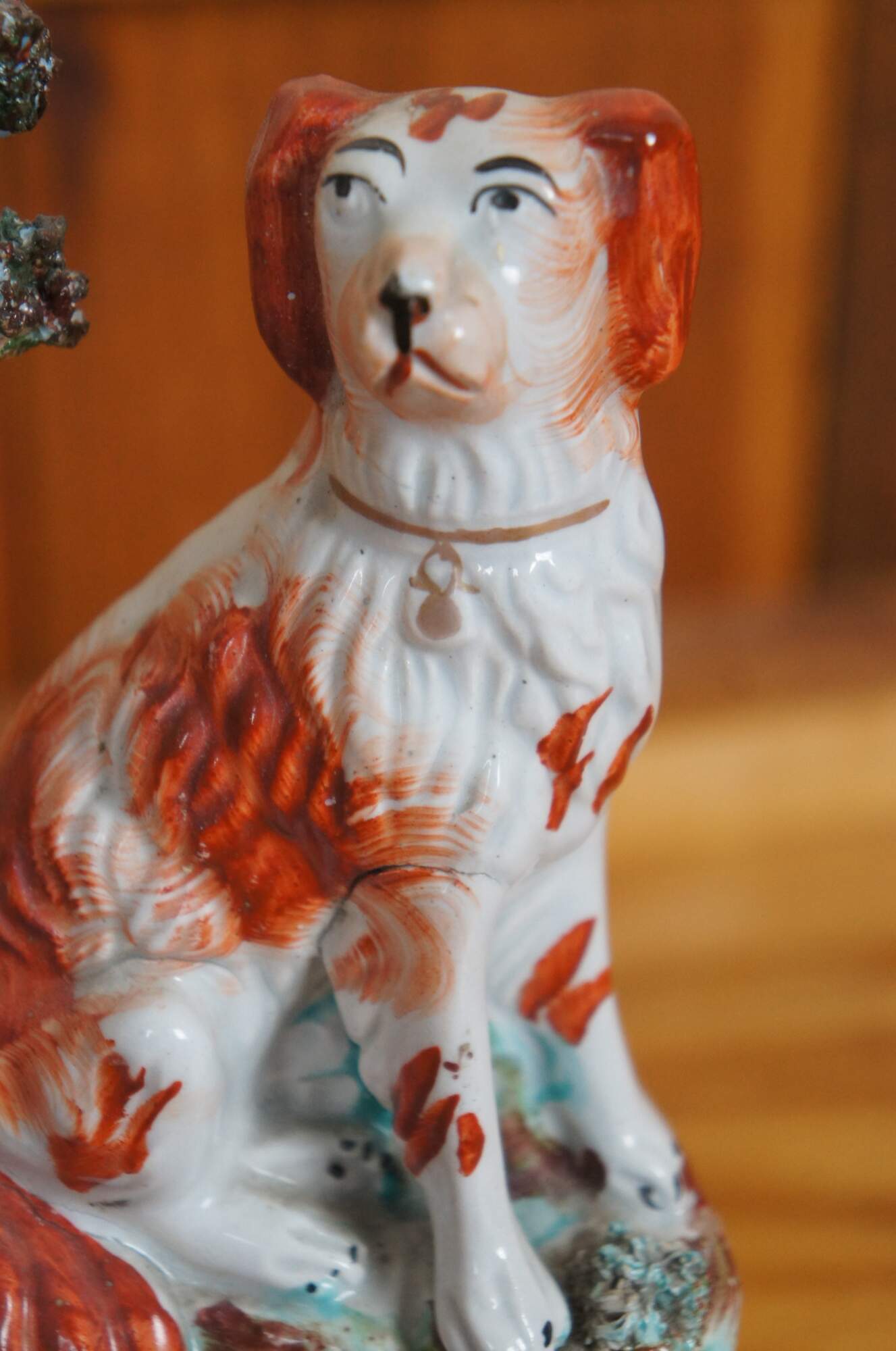 Antique 19th century Staffordshire porcelain flatback figurine titled "Dog Tray," depicting a young girl sleeping at the foot of a tree with her hoop and stick, guarded by an attentive red and white King Charles spaniel. Tray refers to the name of a faithful dog featured in the poem "The Harper," written in 1836 by Thomas Campbell.