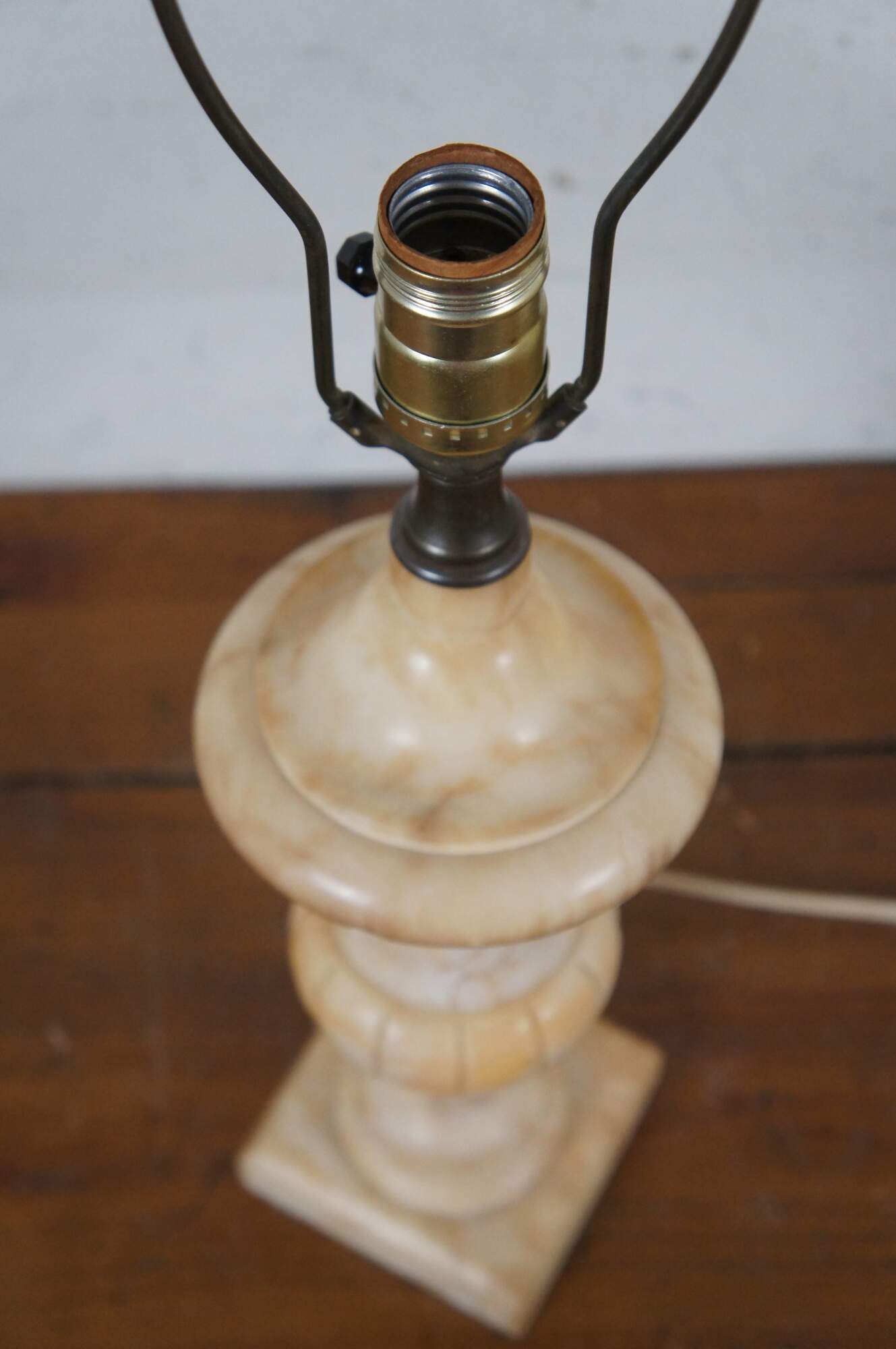 Antique beige and cream marble / alabaster / stone table lamp, carved in the shape of a Neoclassical vase. Includes harp, pleated fabric shade, and cream colored Bakelite finial.