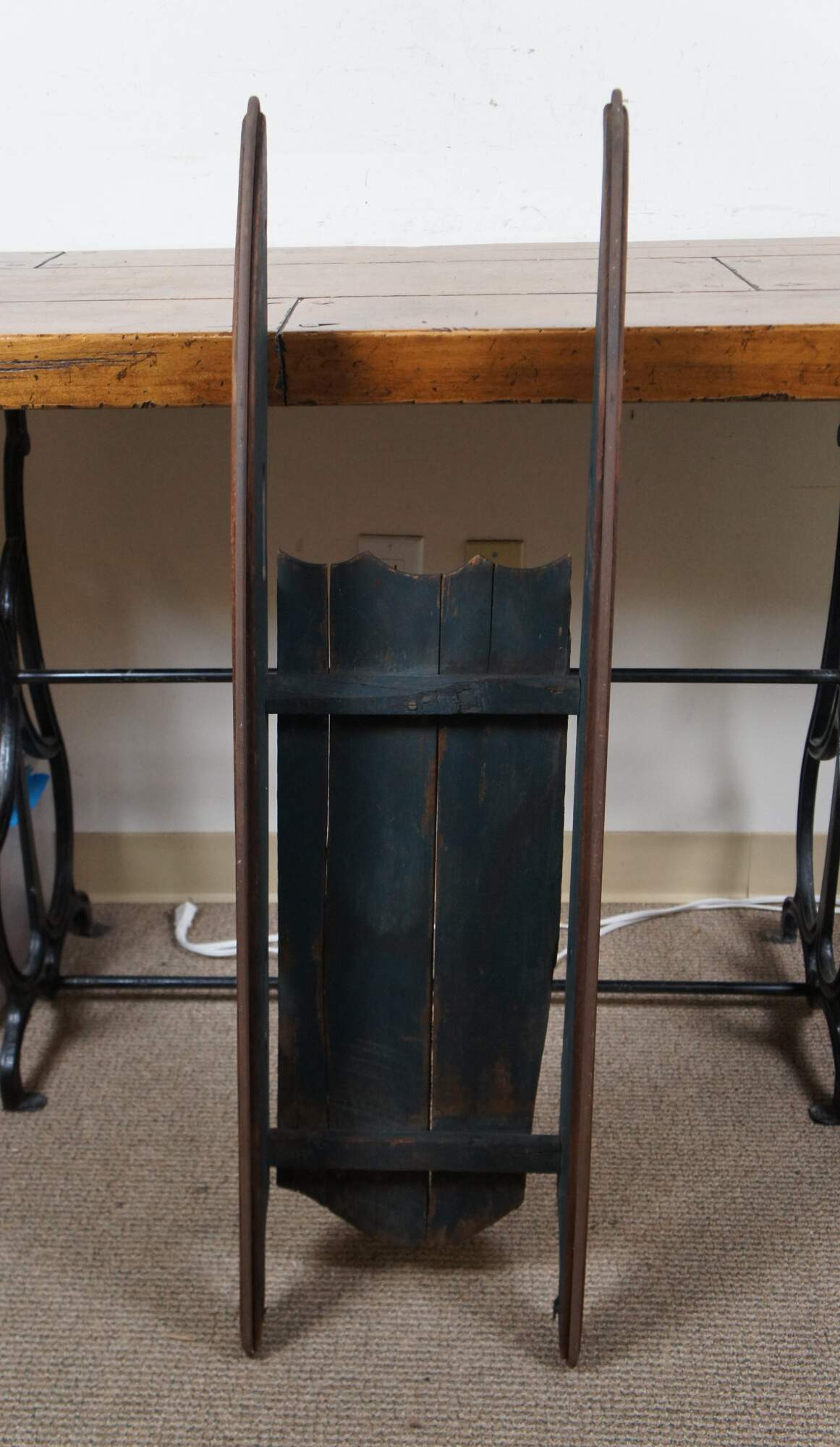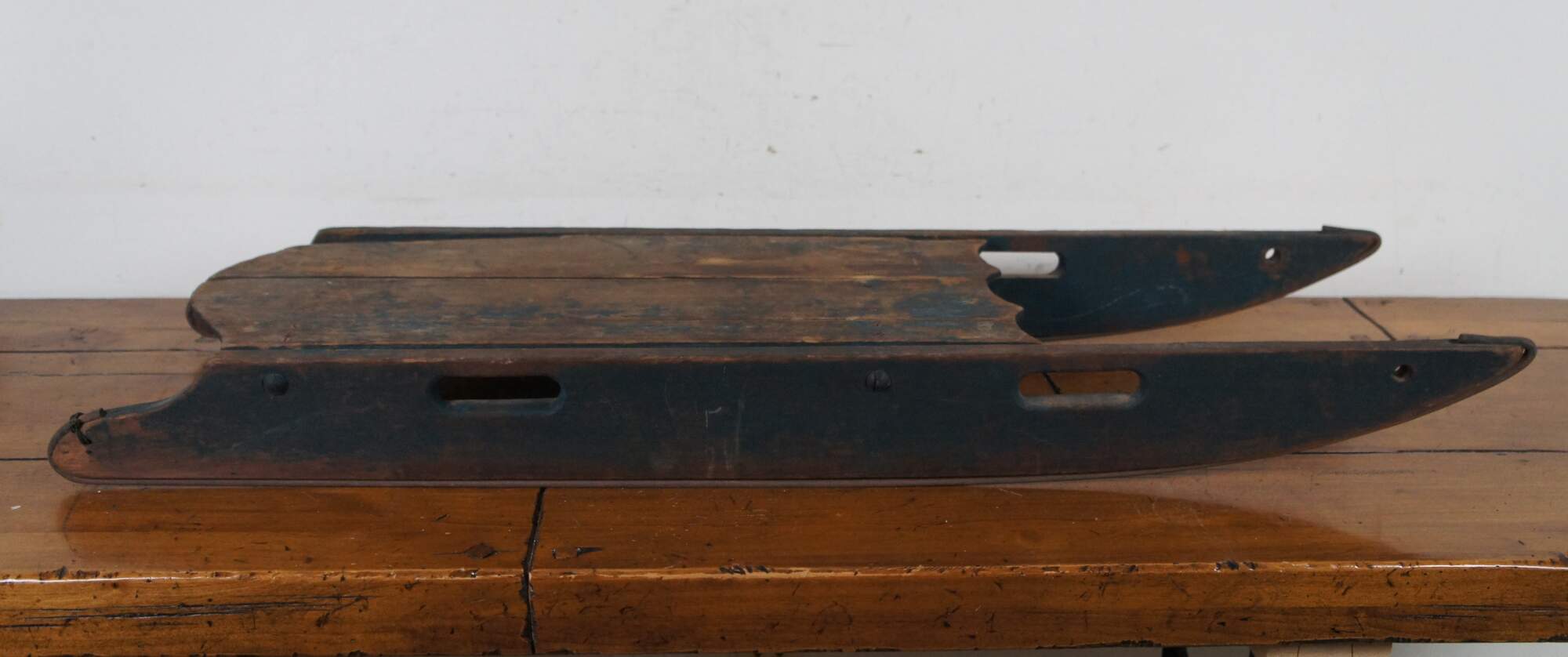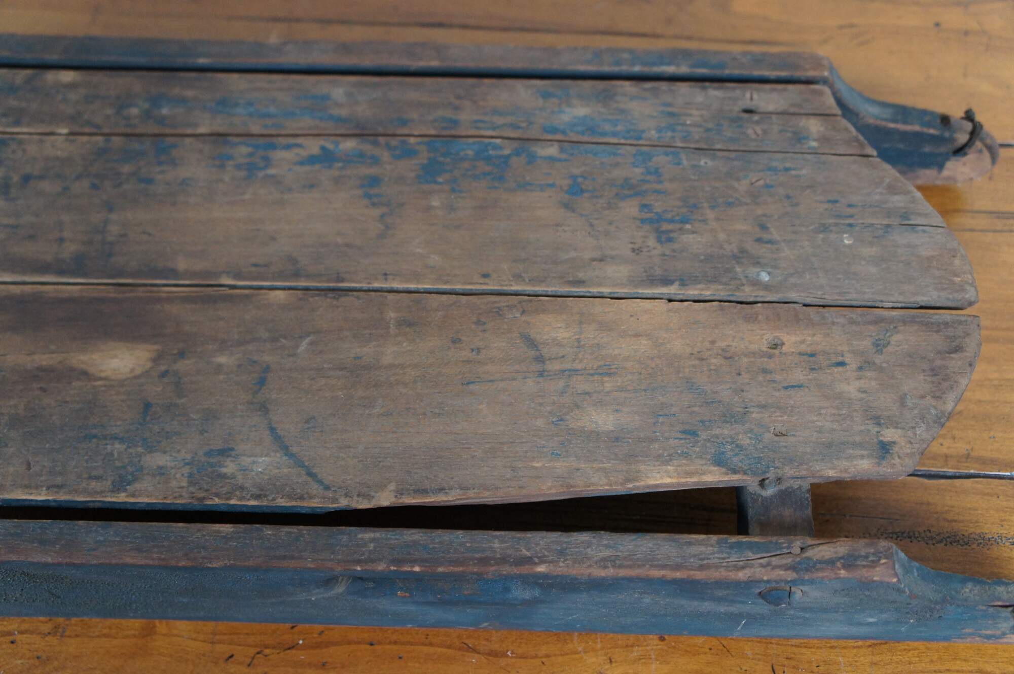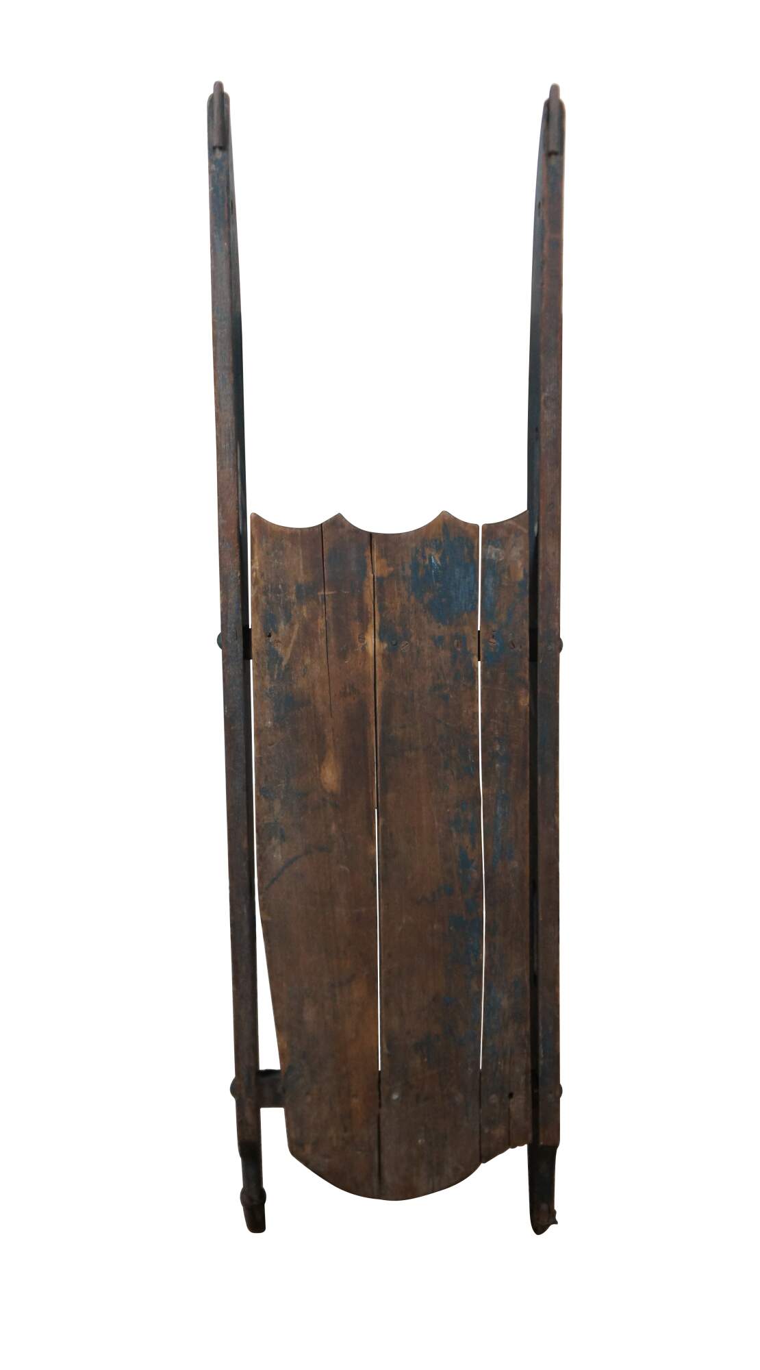 Antique late 19th to early 20th century wooden childrens Christmas winter sled with worn dark green paint, cut out handles, and iron runners.