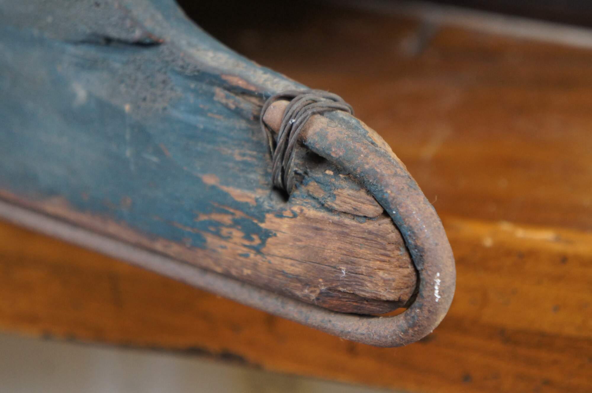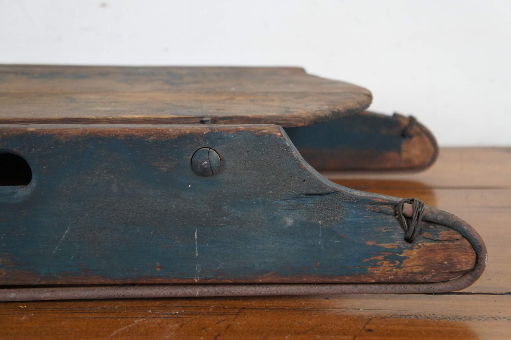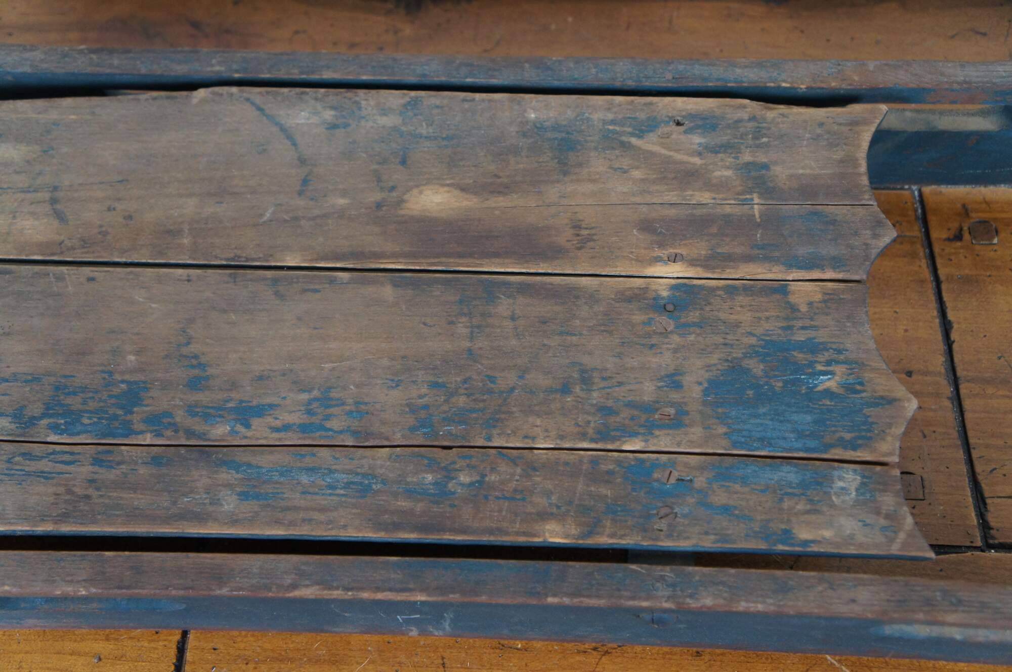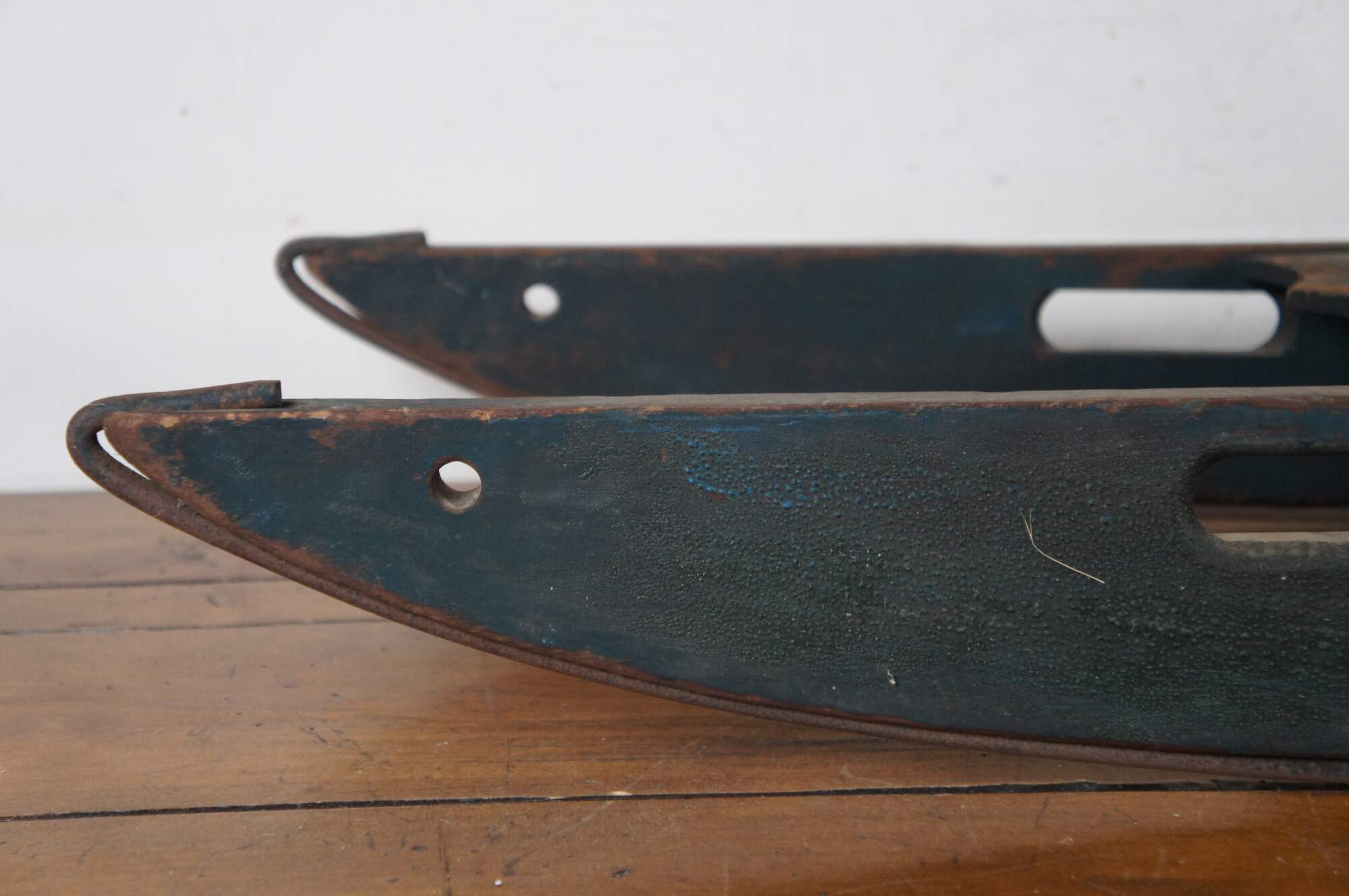 Antique late 19th to early 20th century wooden childrens Christmas winter sled with worn dark green paint, cut out handles, and iron runners.