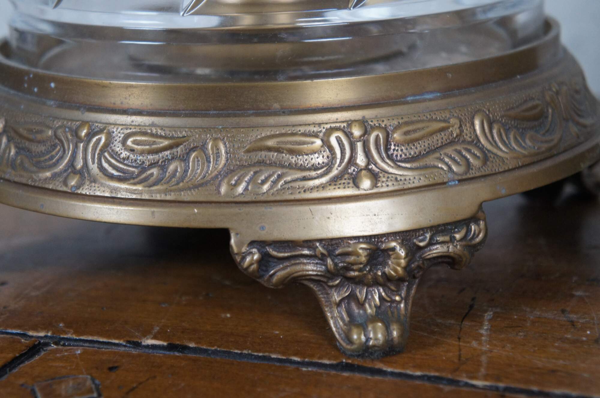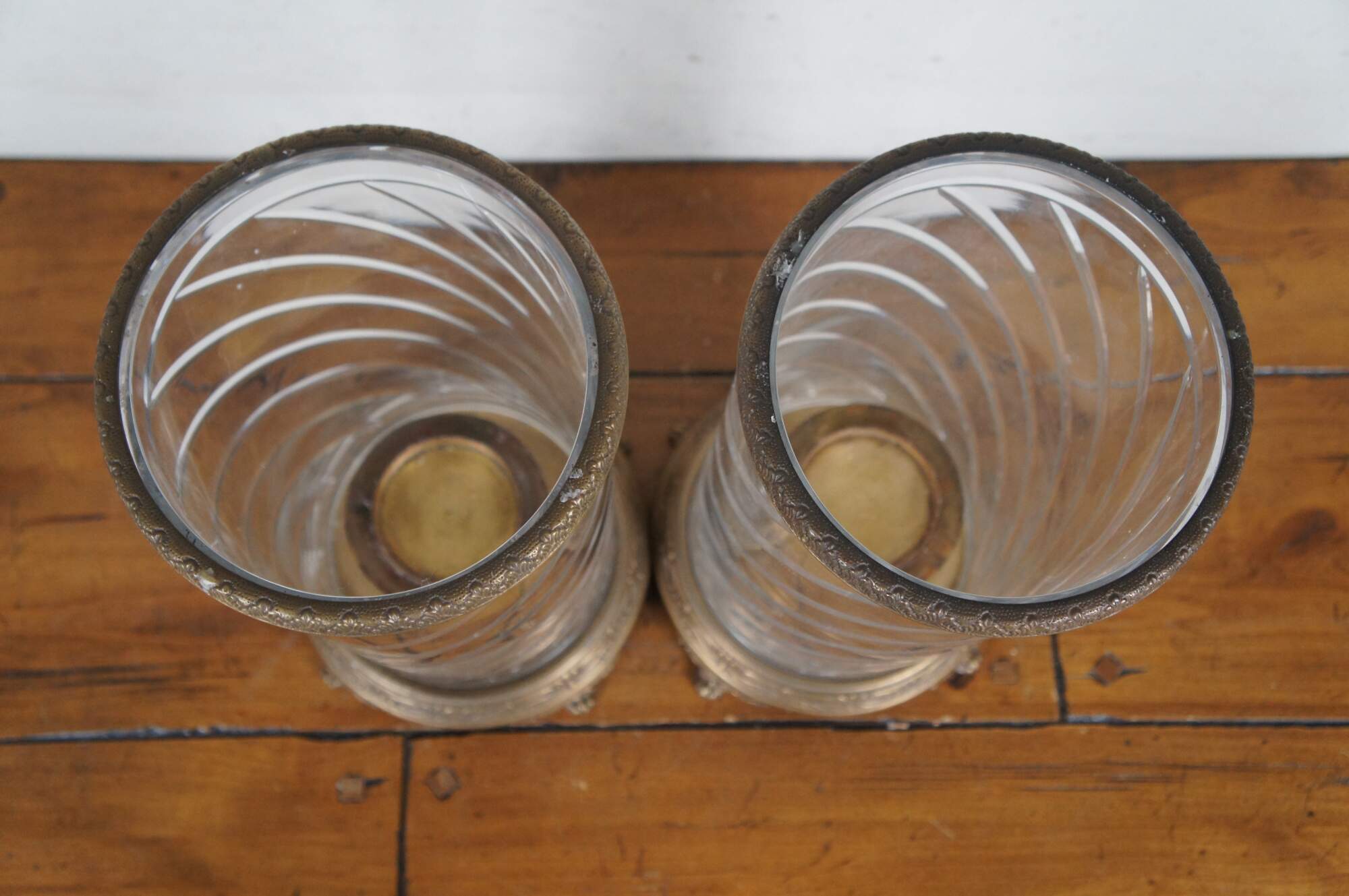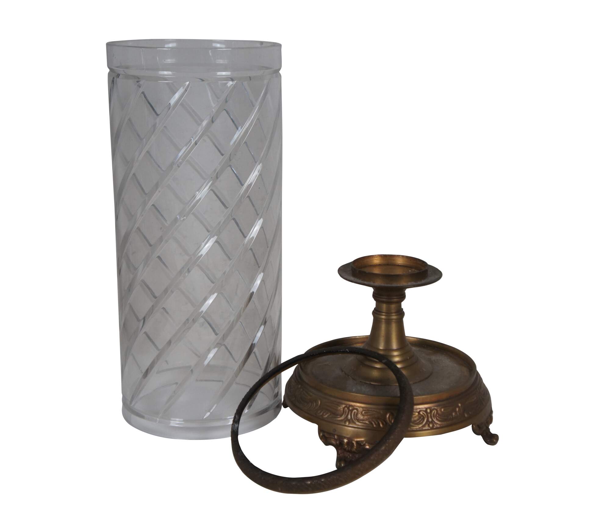 Pair of Castilian Imports brass pillar candle holders - round bases with foliate details and four feet, and spiral cut crystal hurricanes topped with foliate brass rims.