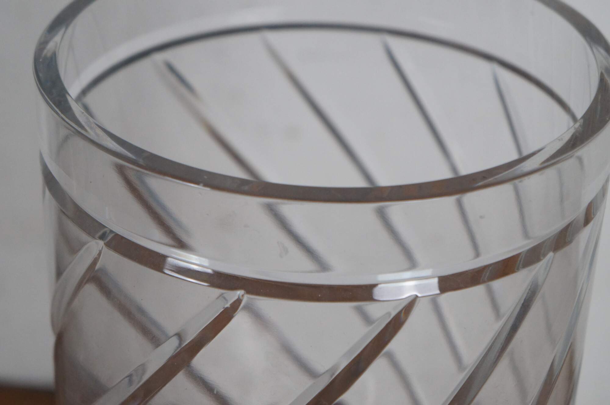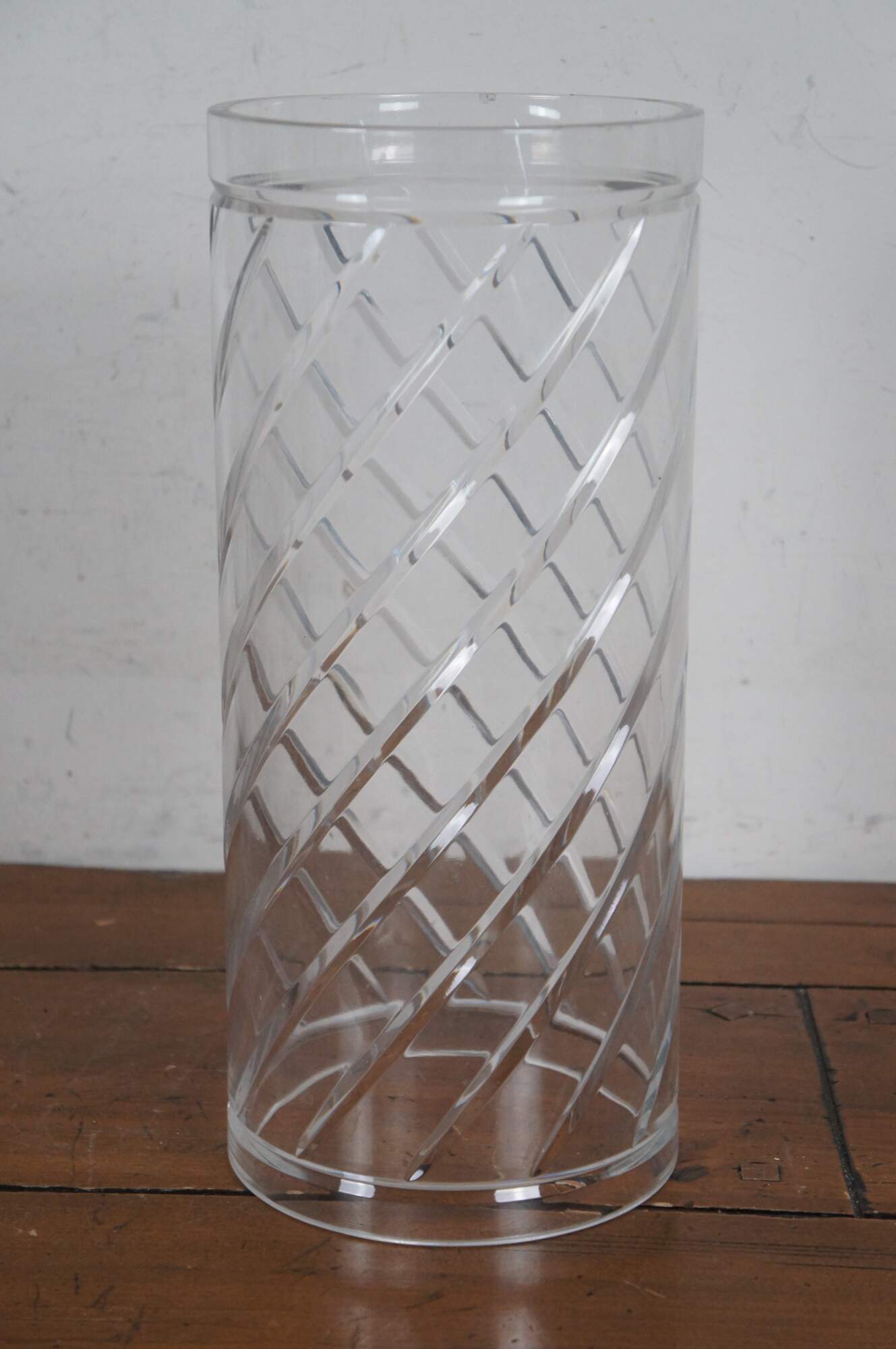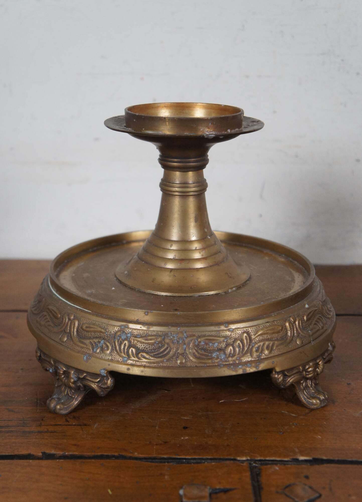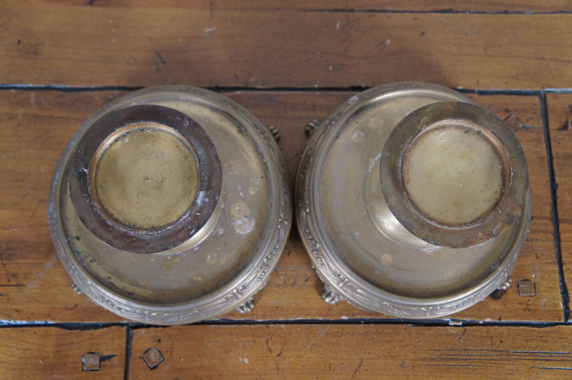 Pair of Castilian Imports brass pillar candle holders - round bases with foliate details and four feet, and spiral cut crystal hurricanes topped with foliate brass rims.