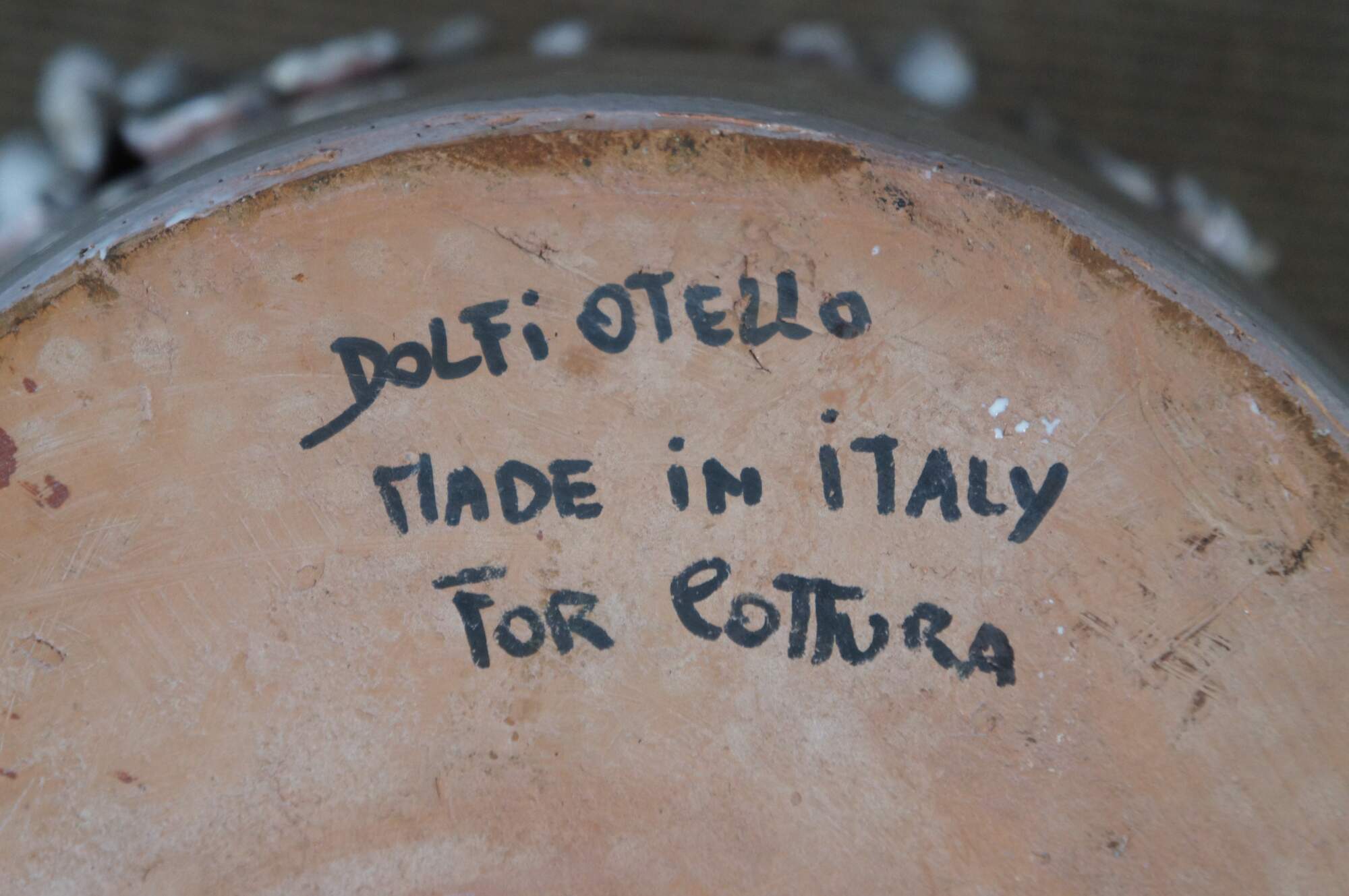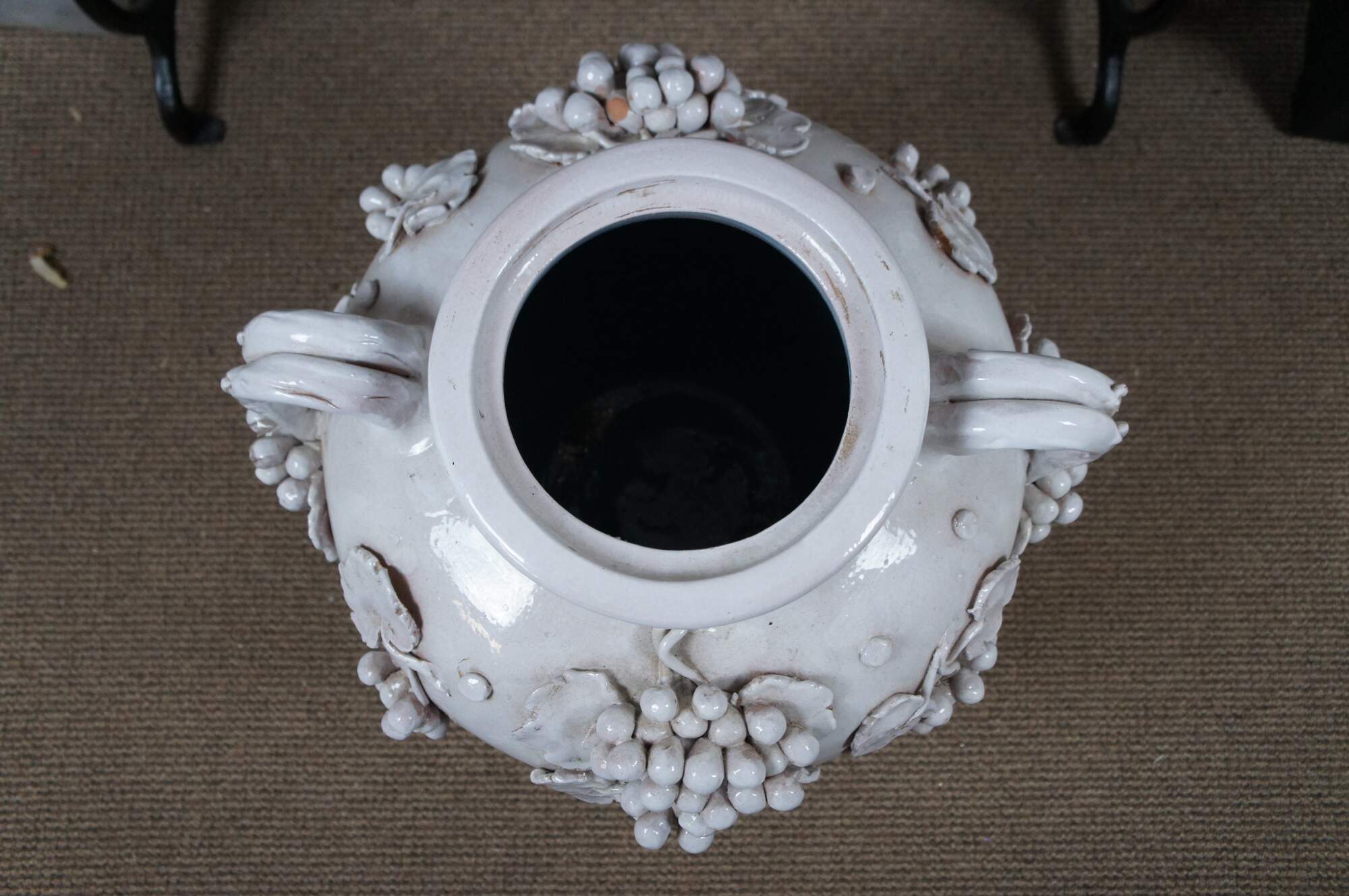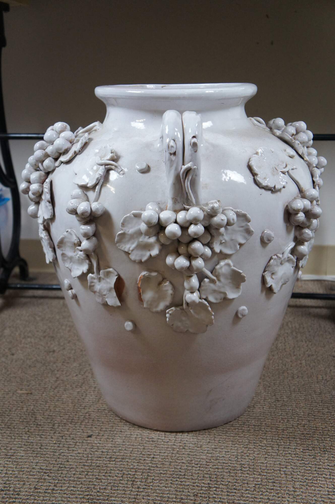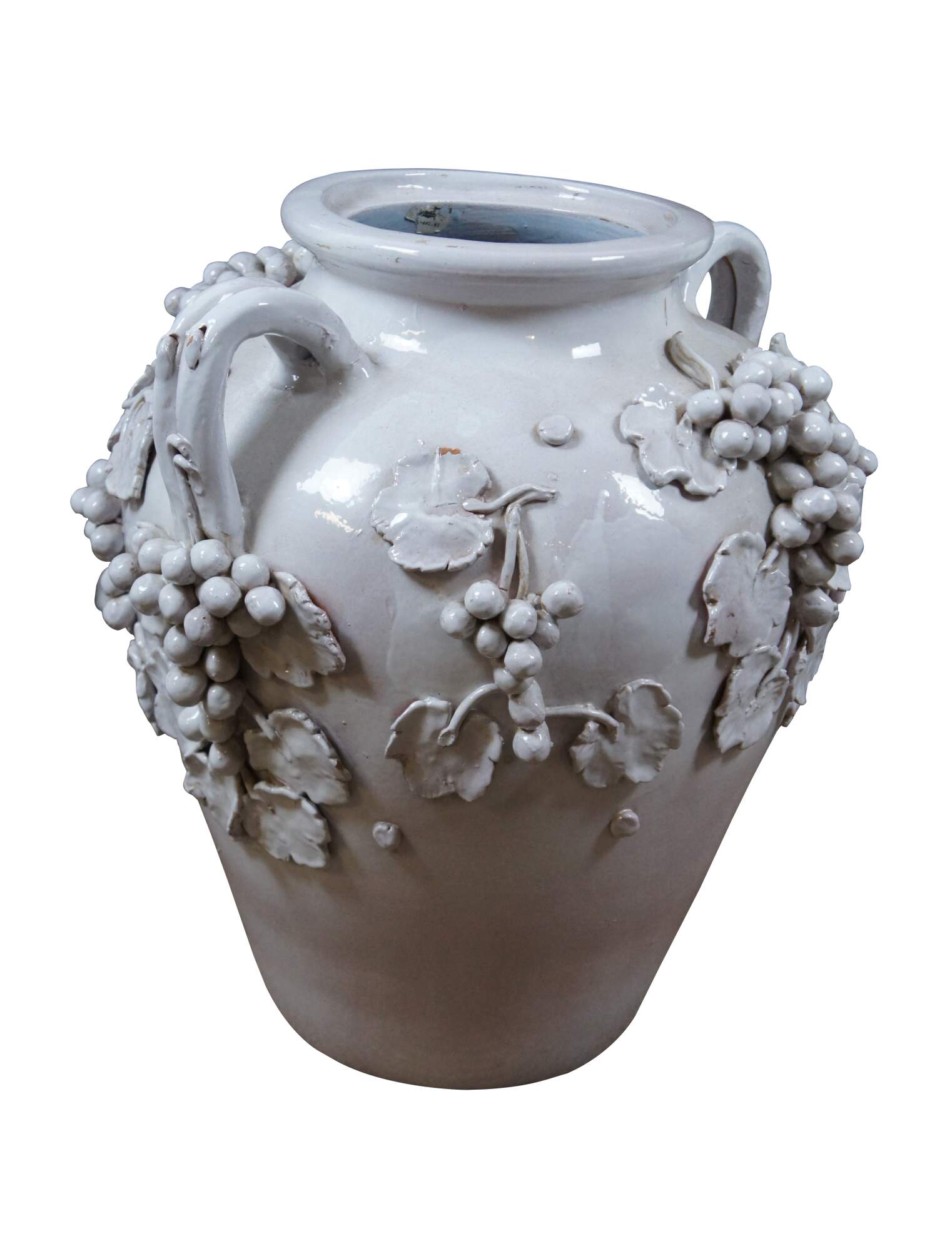 Very large vintage 20th century Italian Dolfi Otello Cottura white glazed terracotta urn / floor vase featuring two handles and applied bunches of high relief grapes and leaves. Pale blue glazed interior. Made in Italy for Cottura by Dolfi Otello.