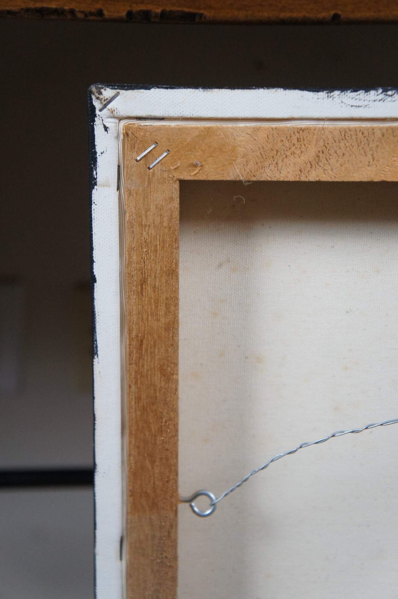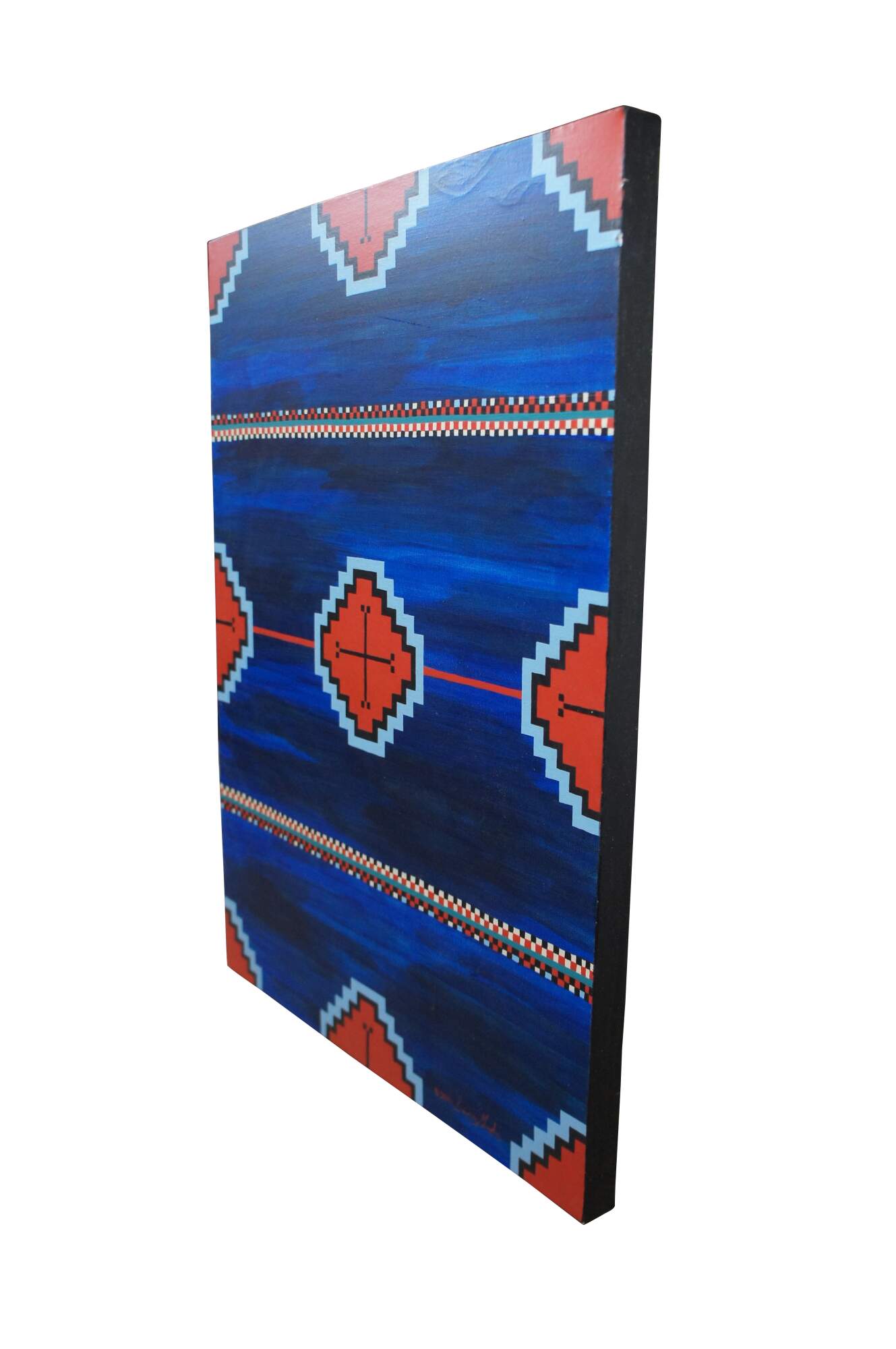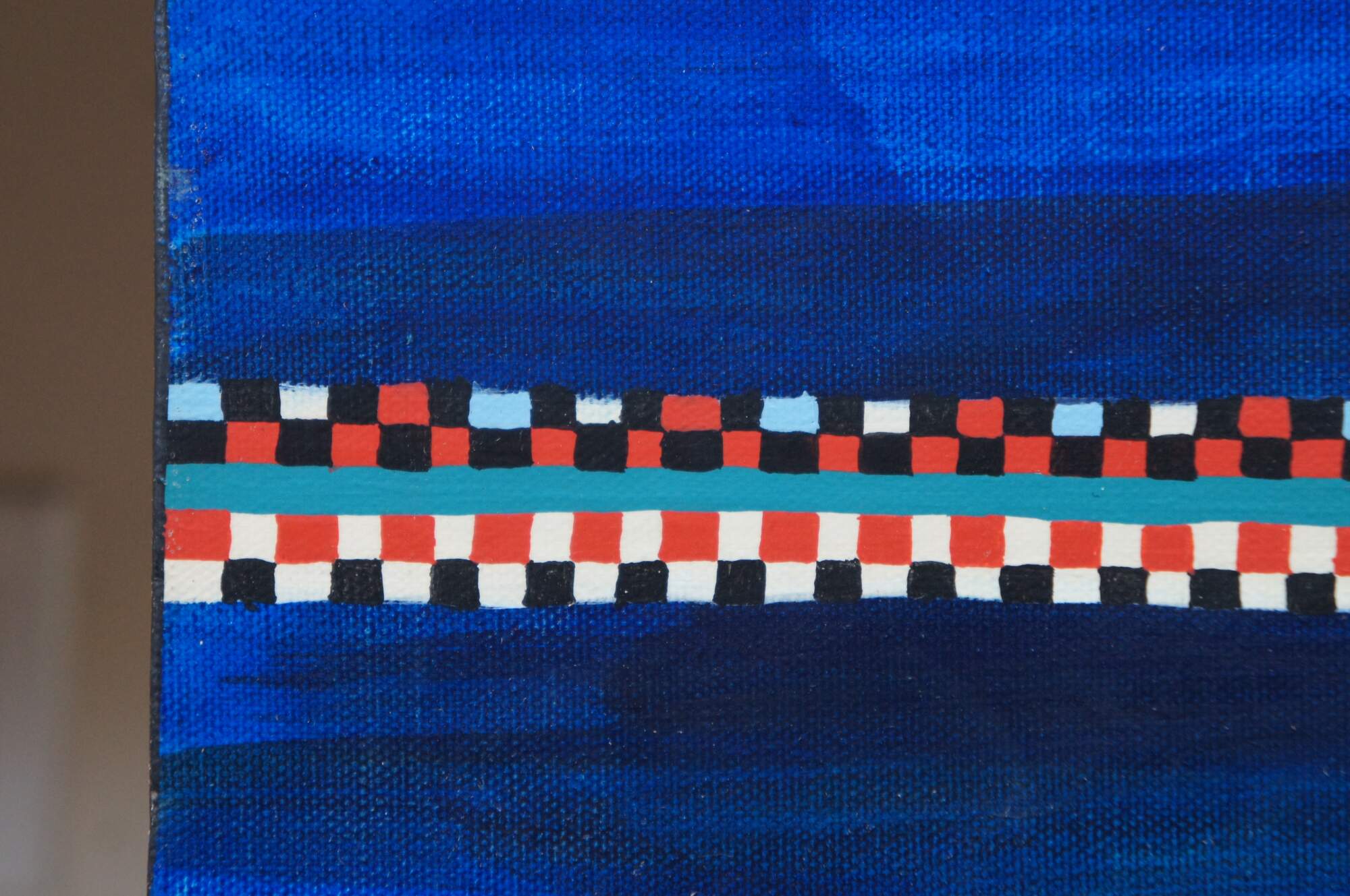 Vintage oil painting on canvas featuring a geometric Navajo blanket or rug design motif in blue, red and cream. Signed Dennis Murphy and dated 2010 in lower right.