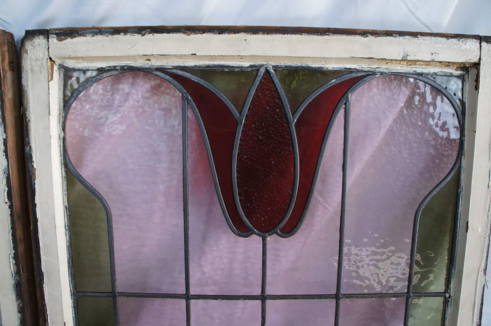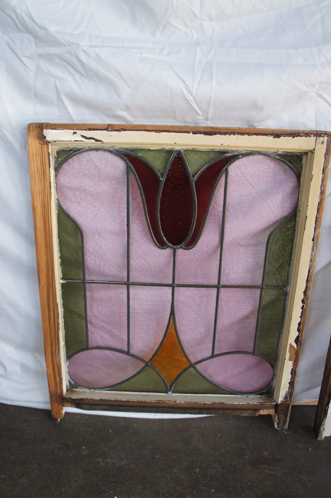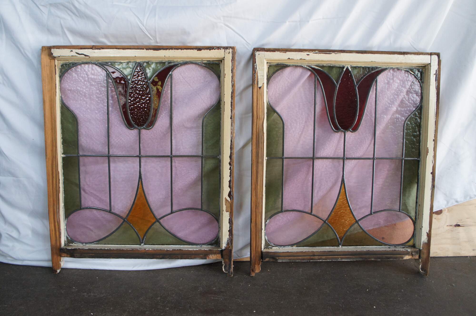 Pair of antique 19th century Victorian / Art Nouveau framed stained glass windows. Features colors of green, rose, red and amber in a white frame. Originally used as sliding windows.