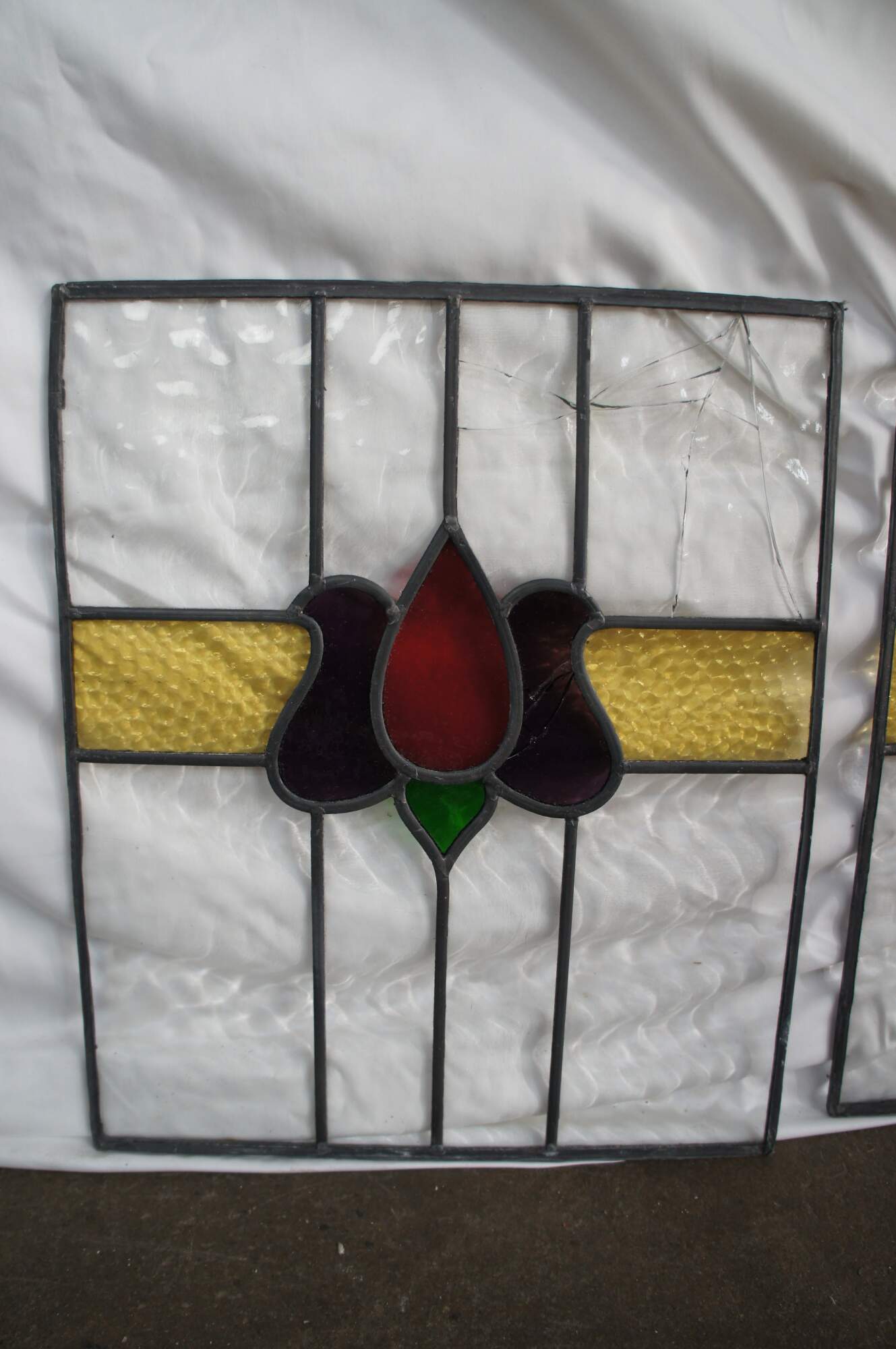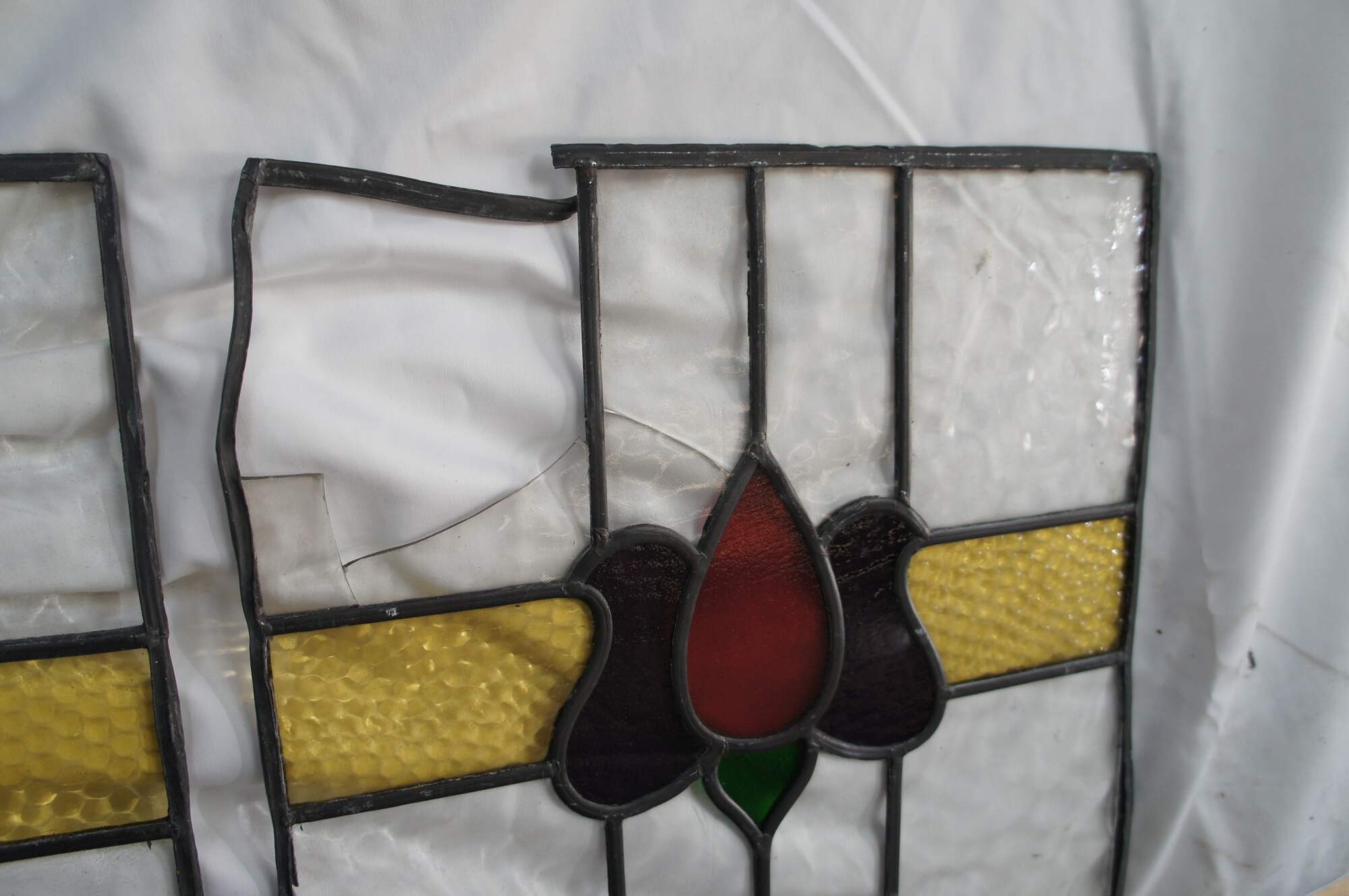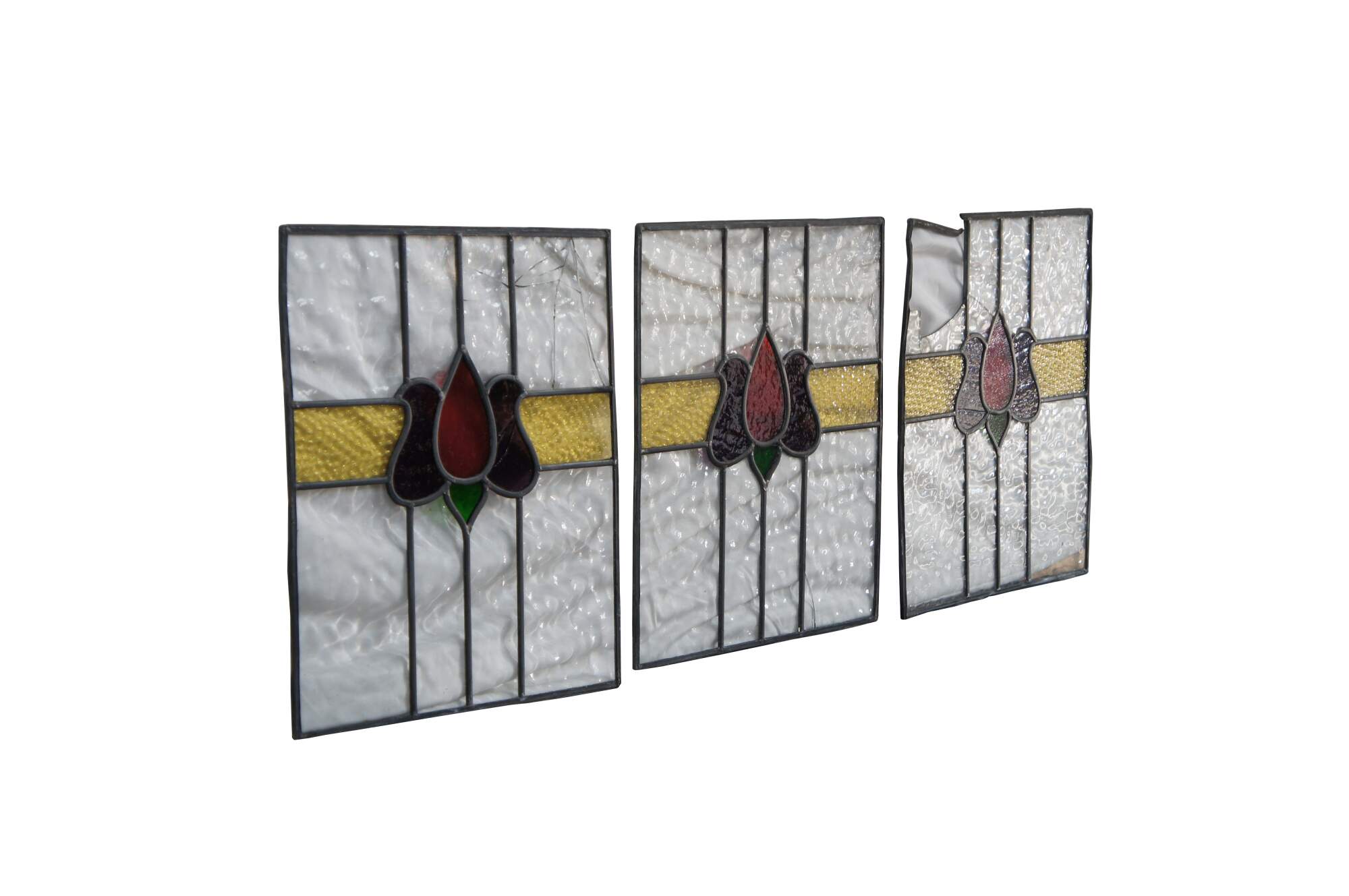 Set of three leaded stained glass window panels. Features pebbled glass in yellow with colorful floral stained glass panels.