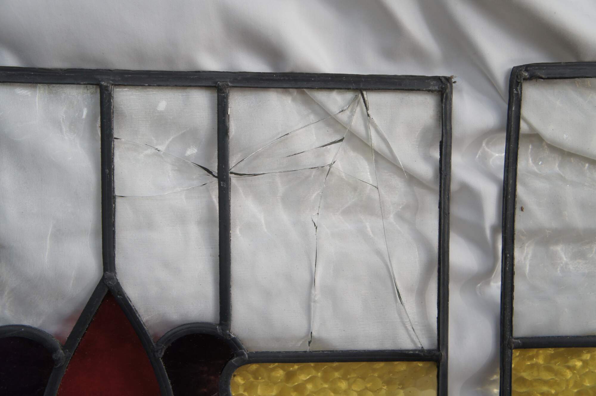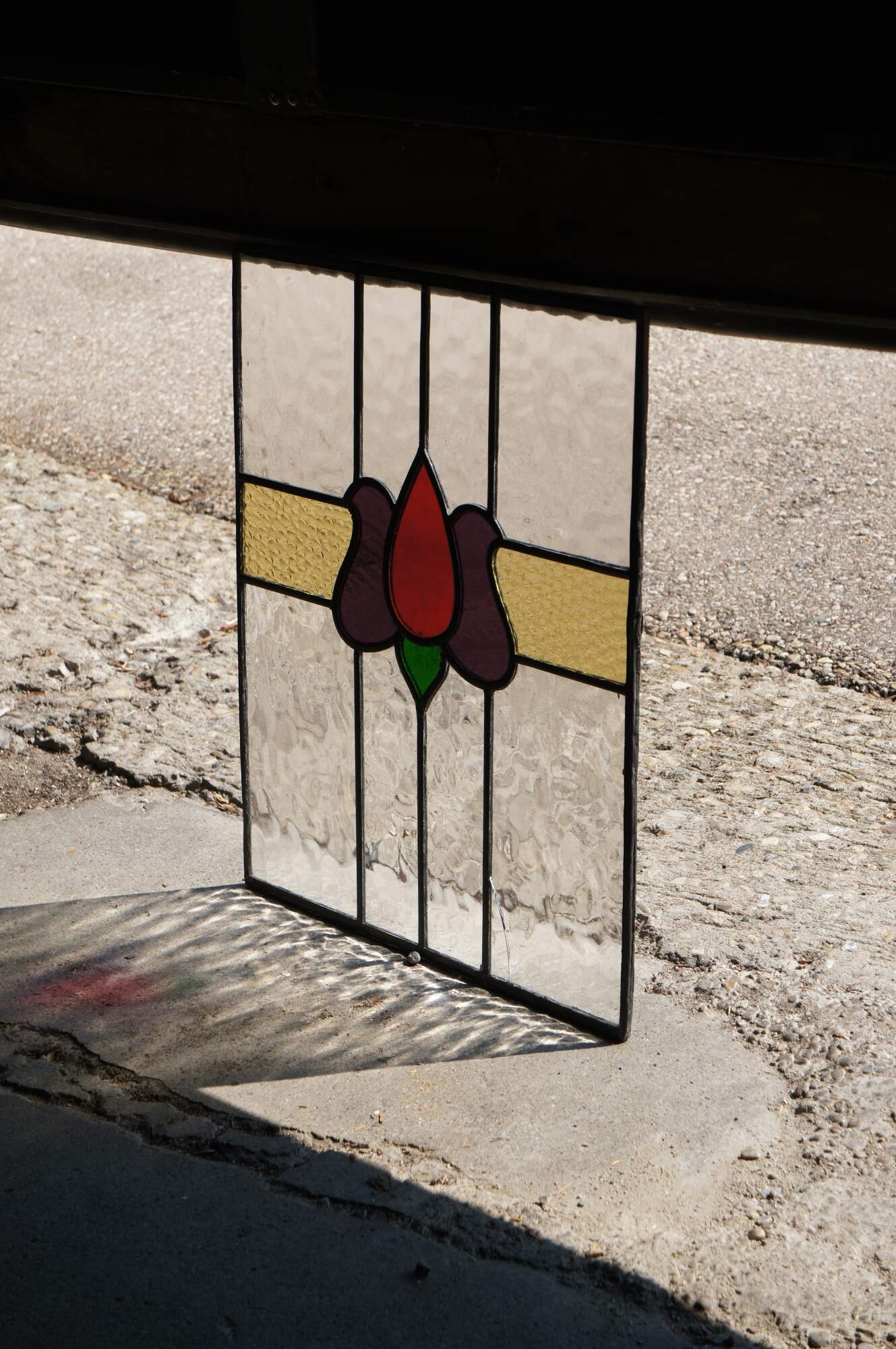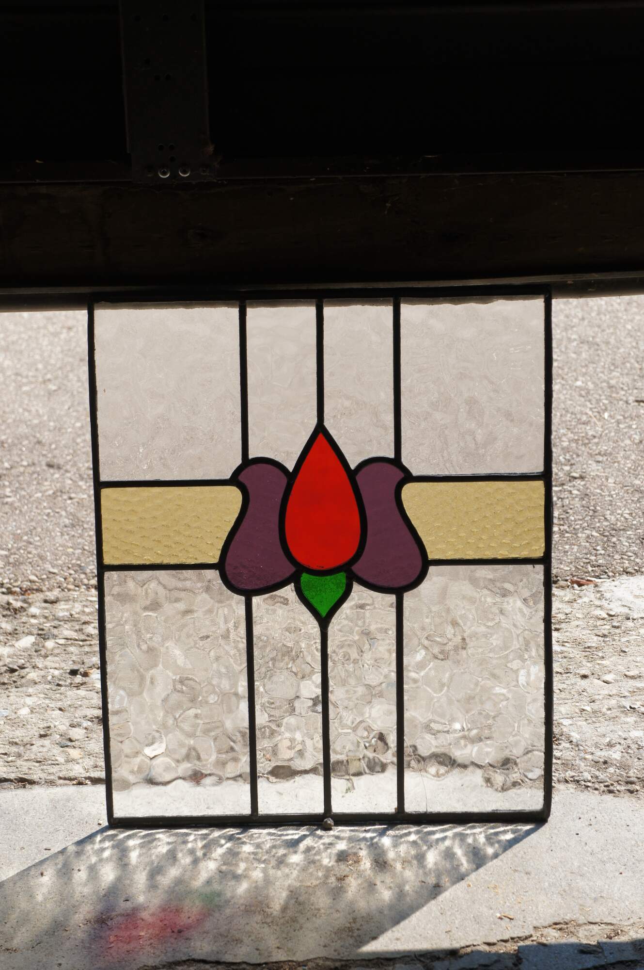 Set of three leaded stained glass window panels. Features pebbled glass in yellow with colorful floral stained glass panels.