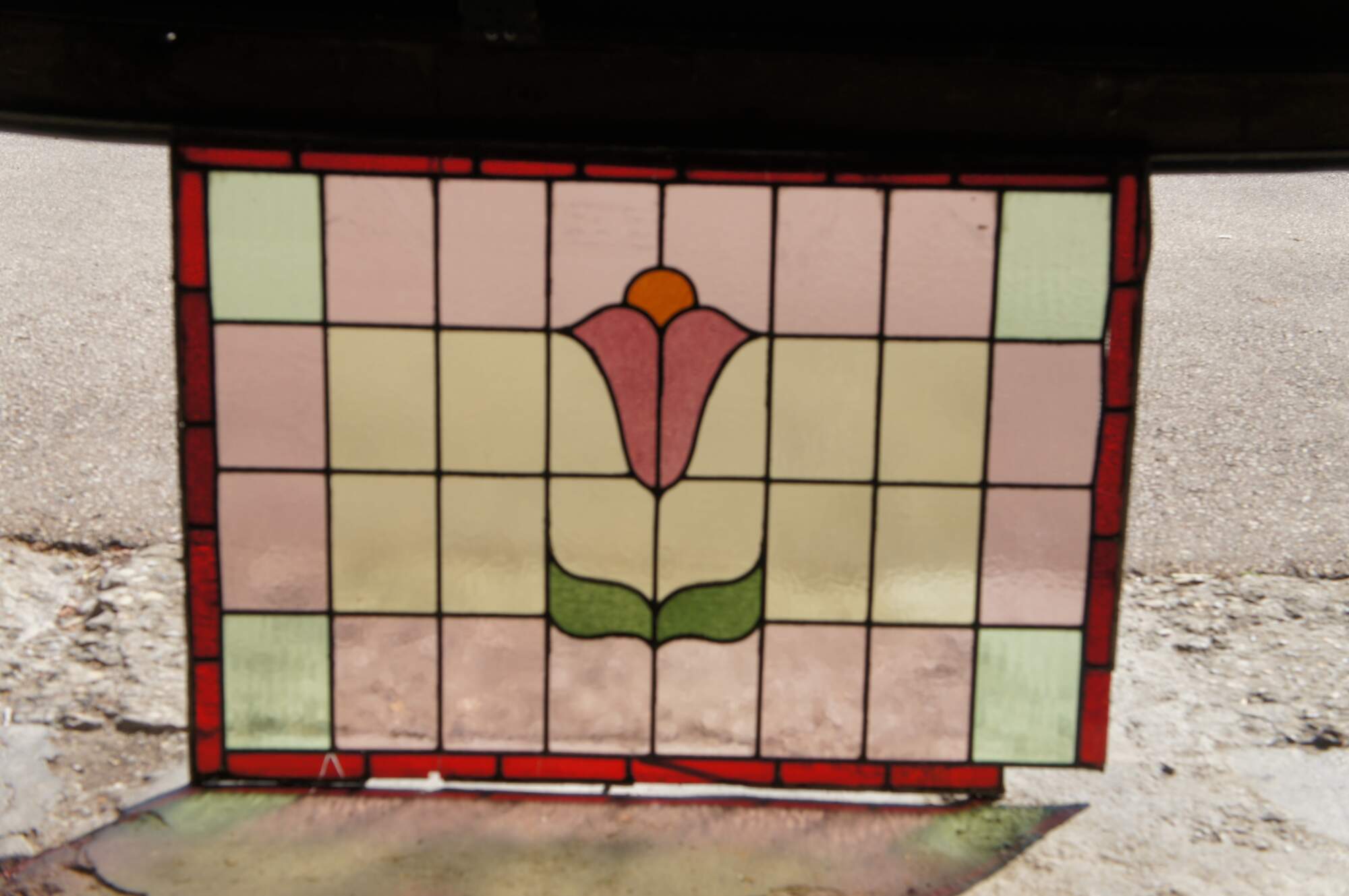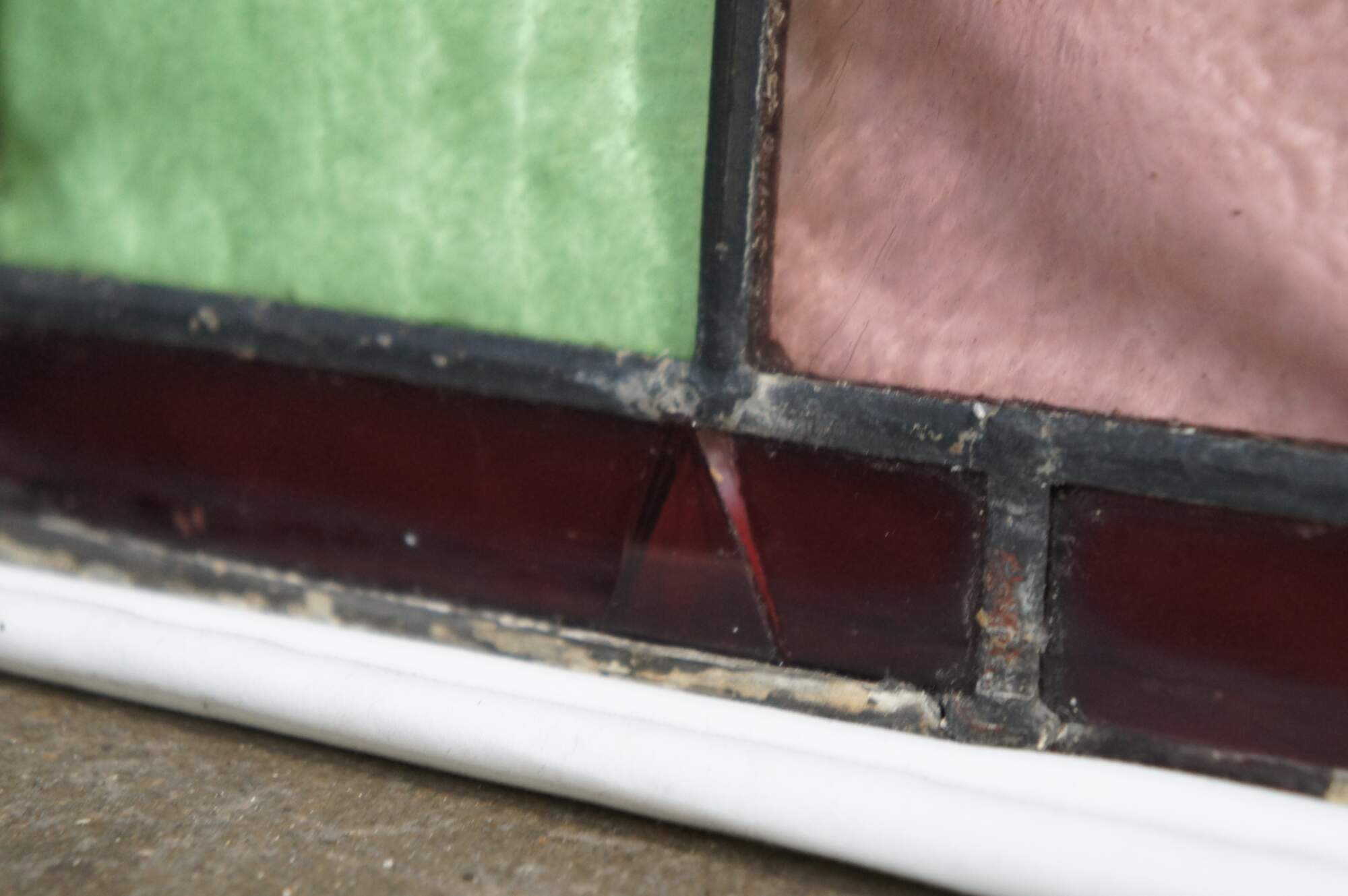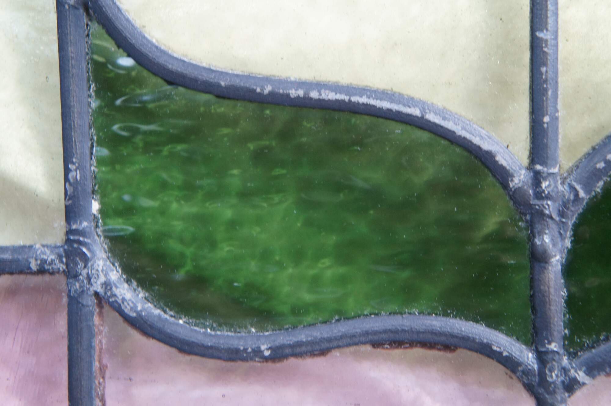 Exquisite antique Victorian leaded stained glass window panel. Features a colorful patchwork pattern in rose, green in yellow with a blooming rose at the center.