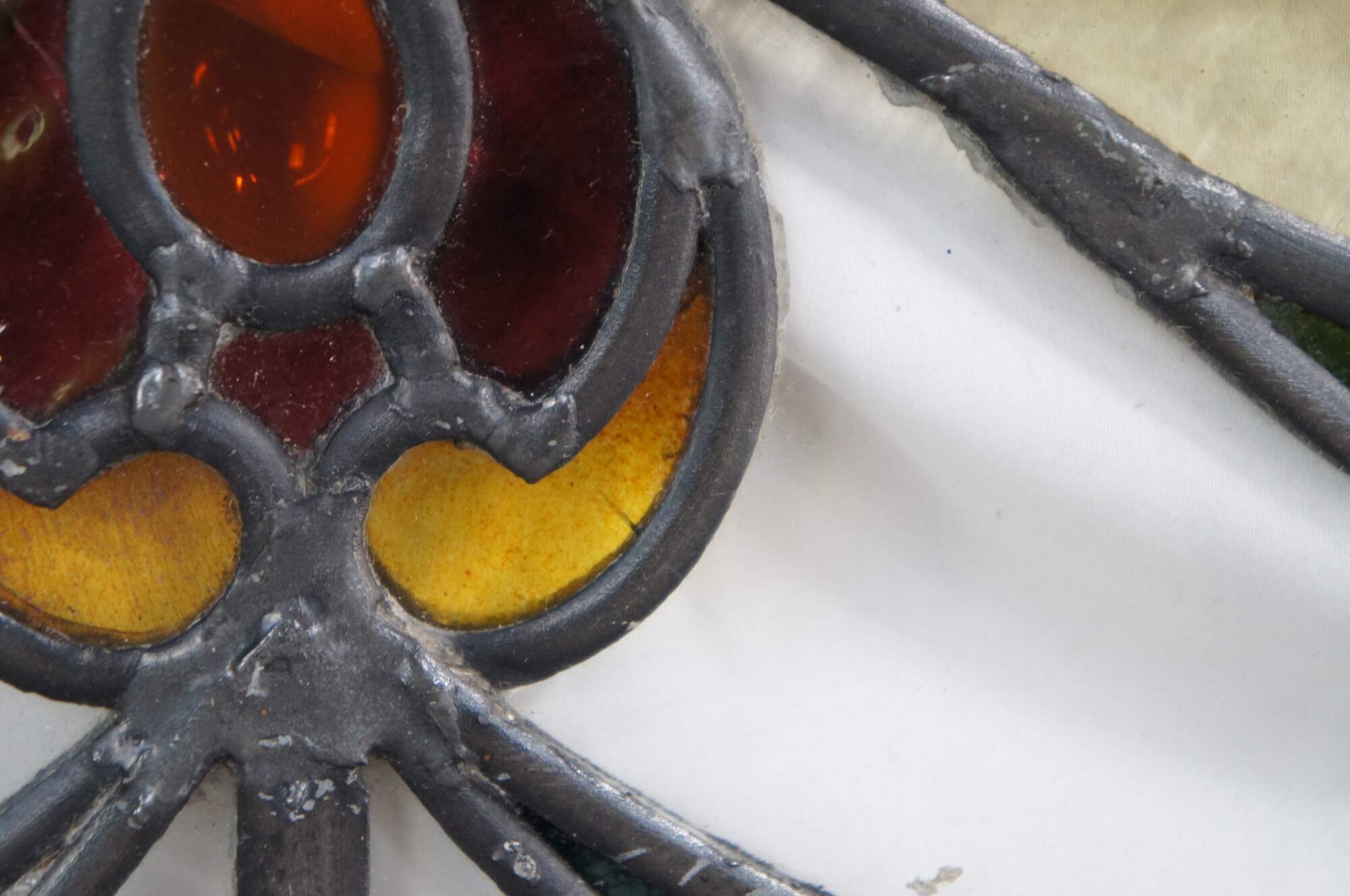 Exquisite antique Art Nouveau leaded stained glass window. Features floral swags in green, amber and yellow over a clear paneled background. Framed in wood for ease of hanging.