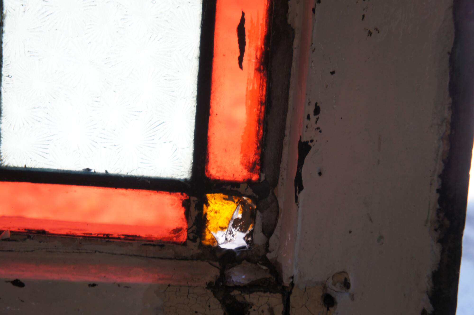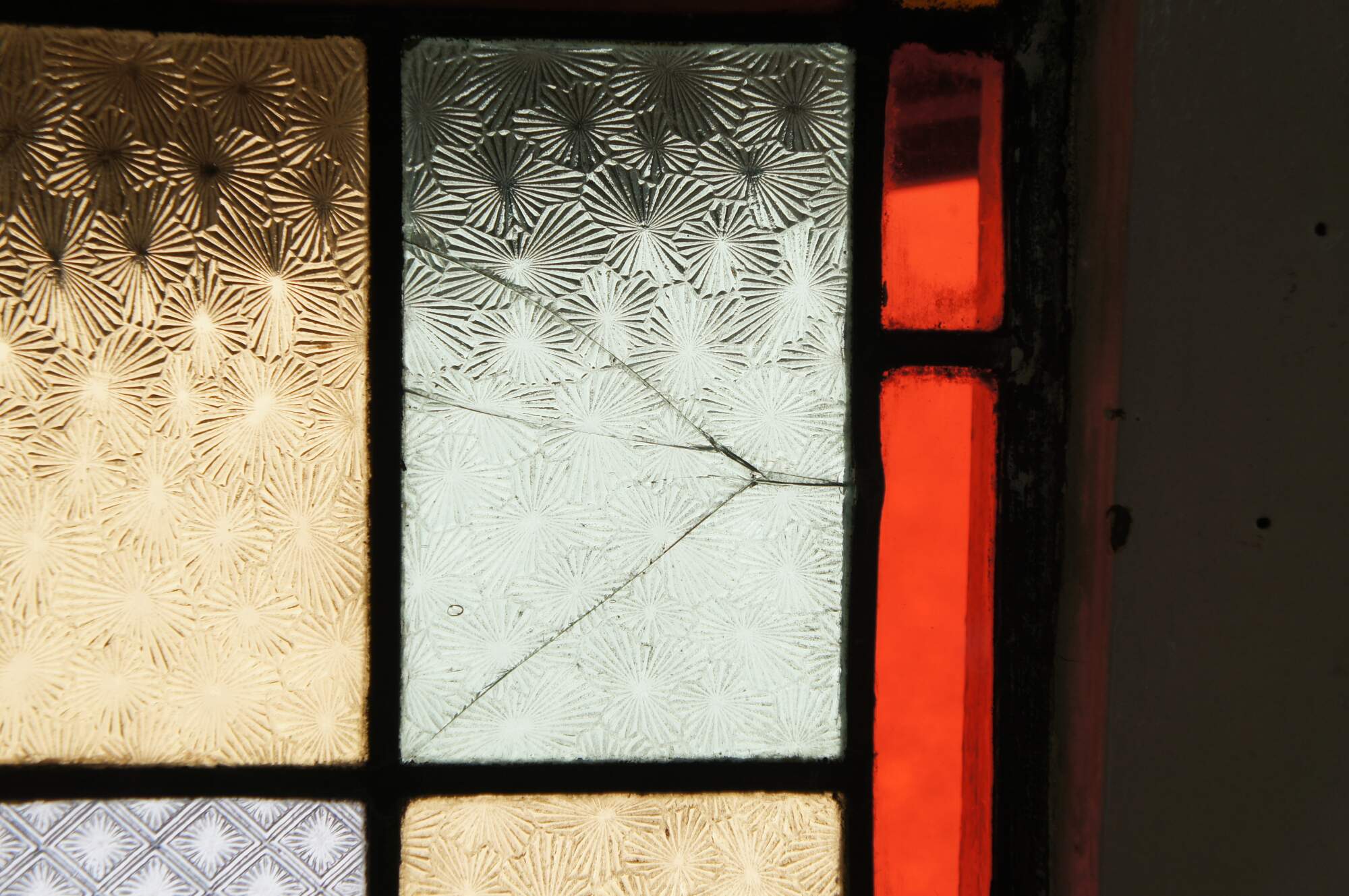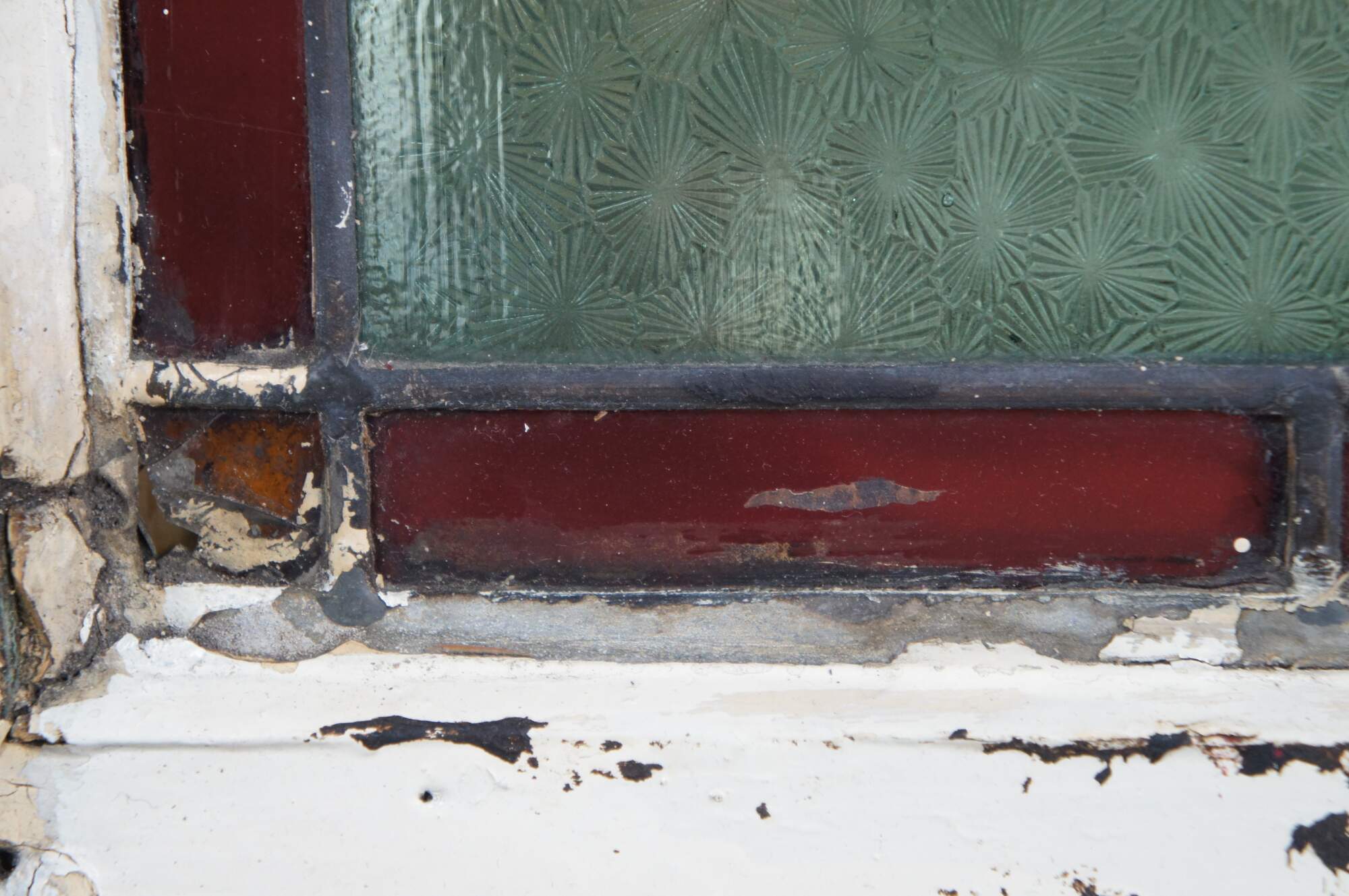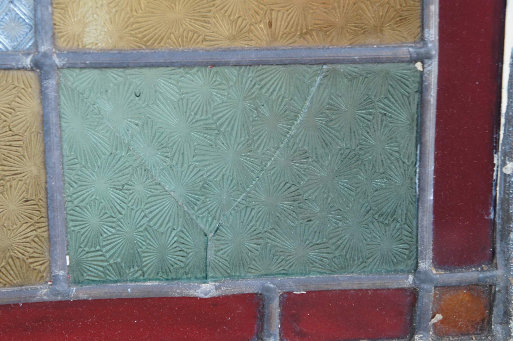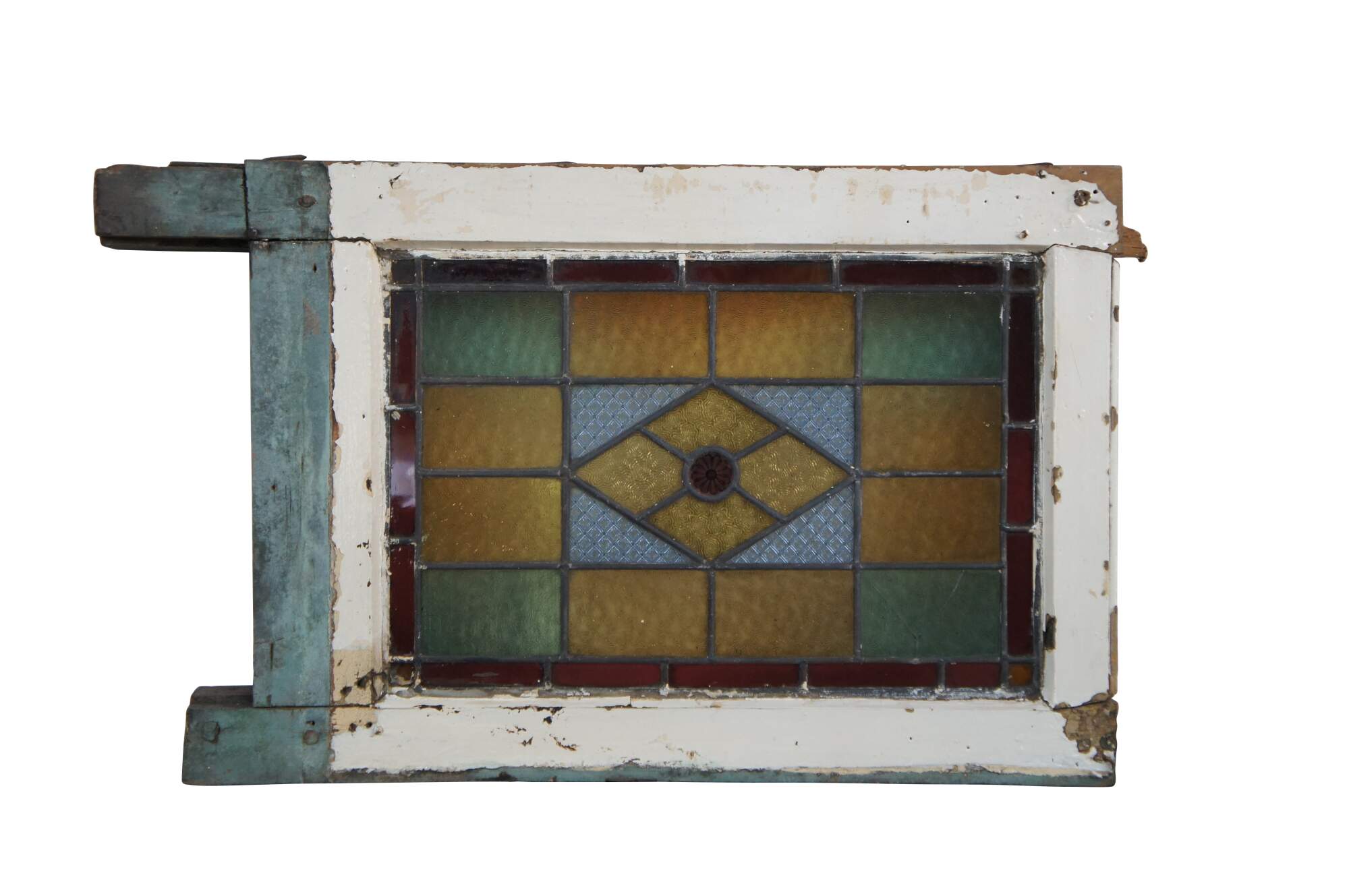 Late 19th Century American Victorian Leaded Stained Glass Window. Features a gridded design with a diamond along the center. Features pebbled shades of amber, green, blue and ruby slag glass.