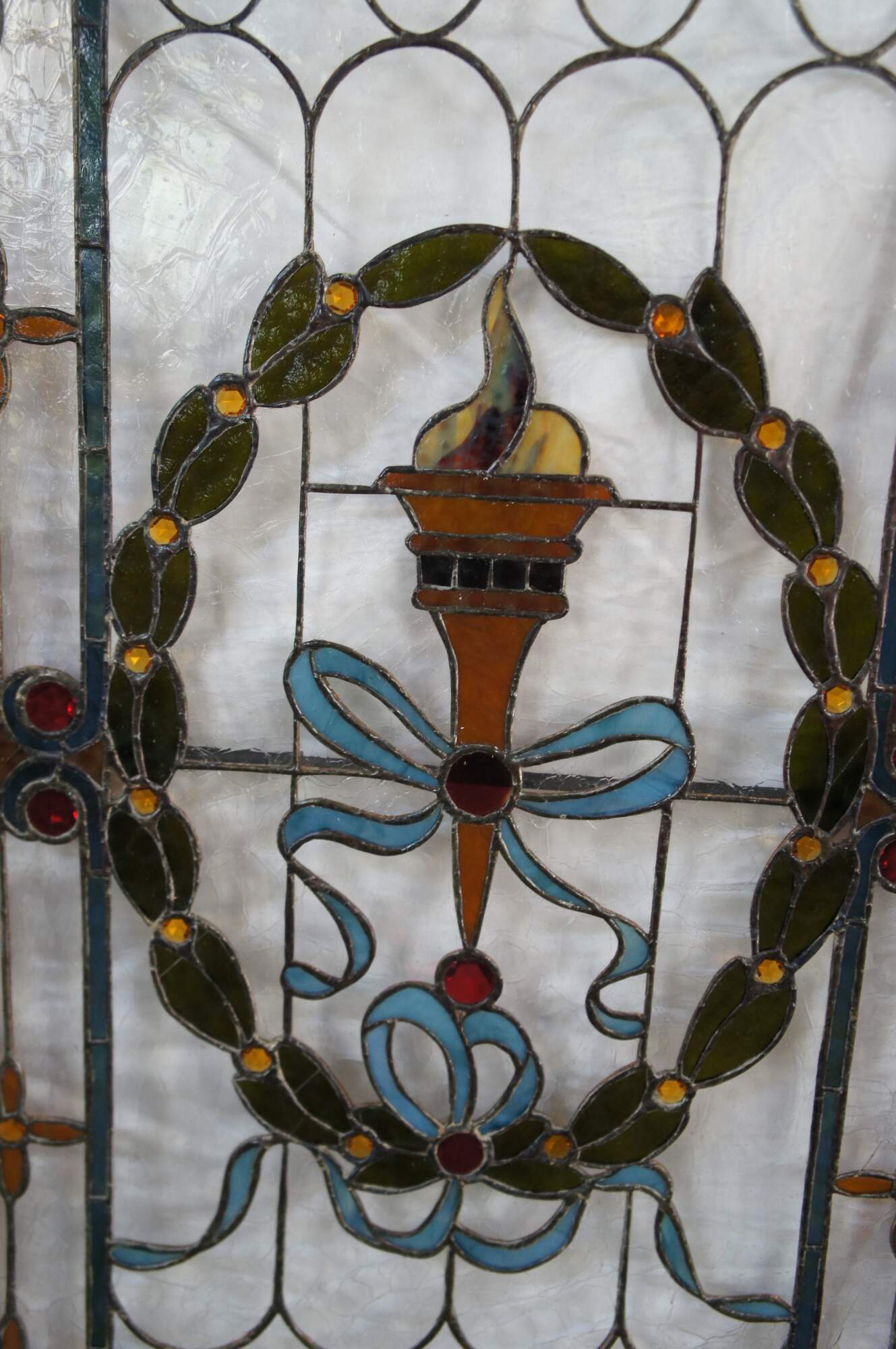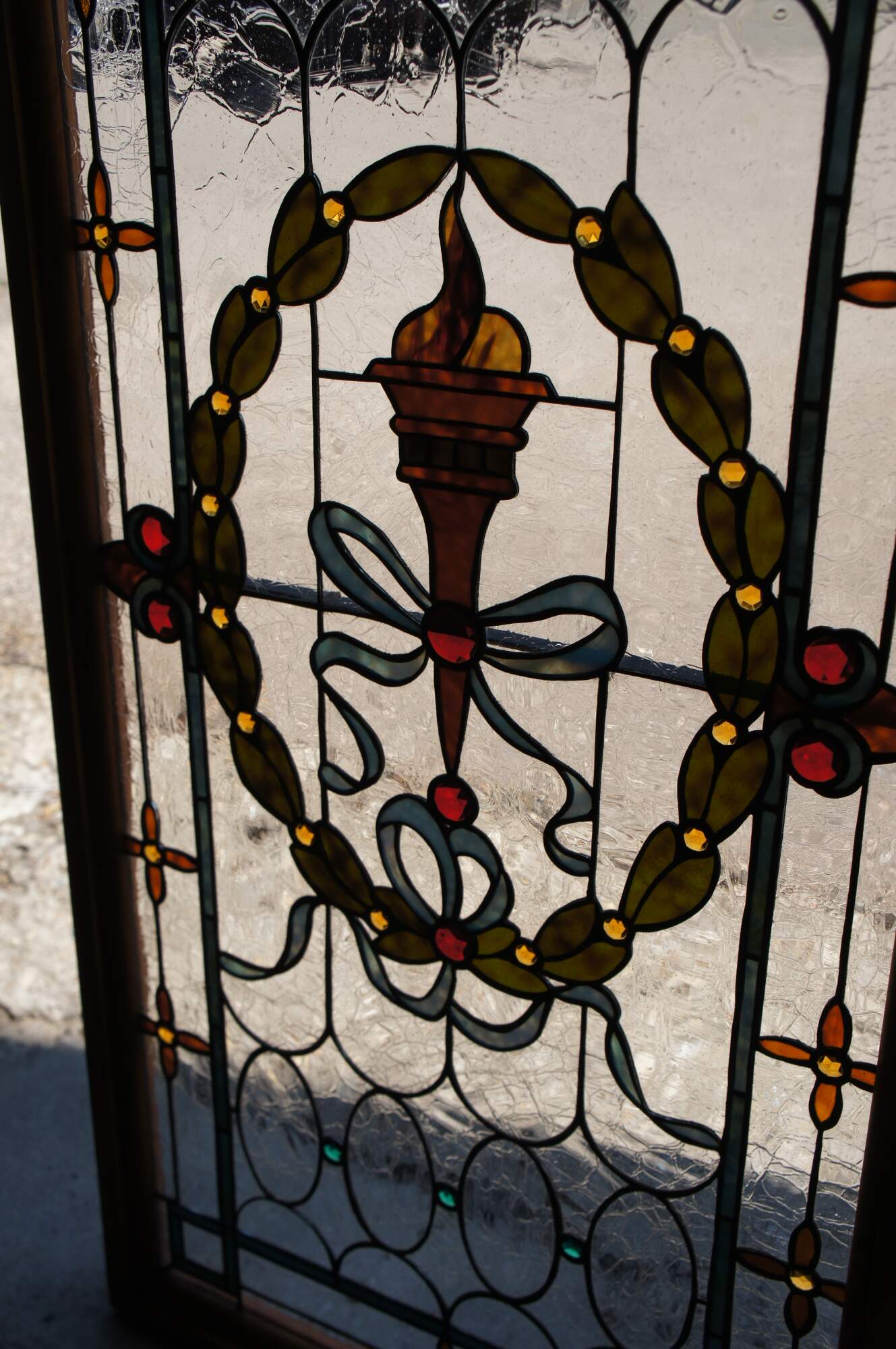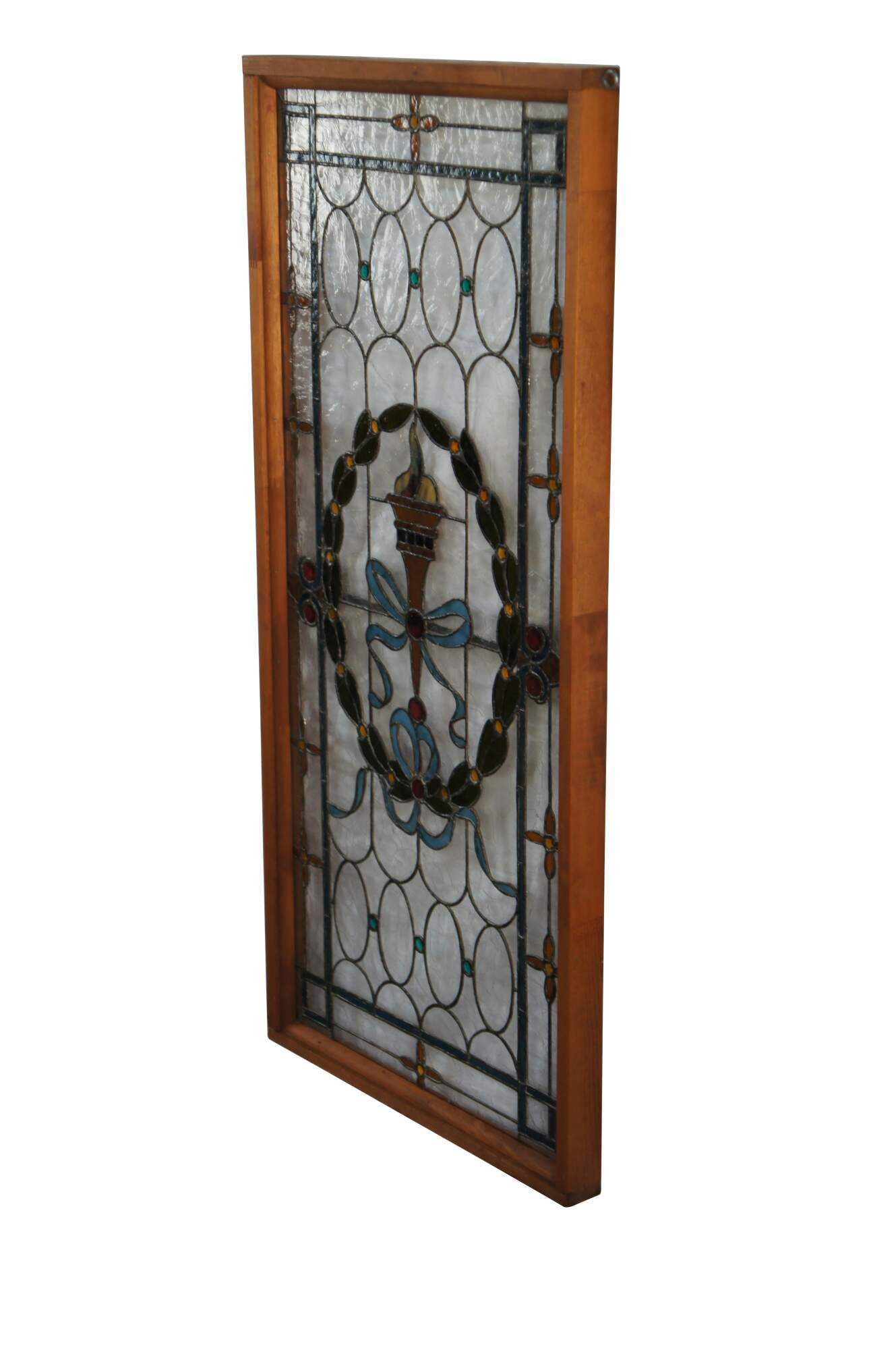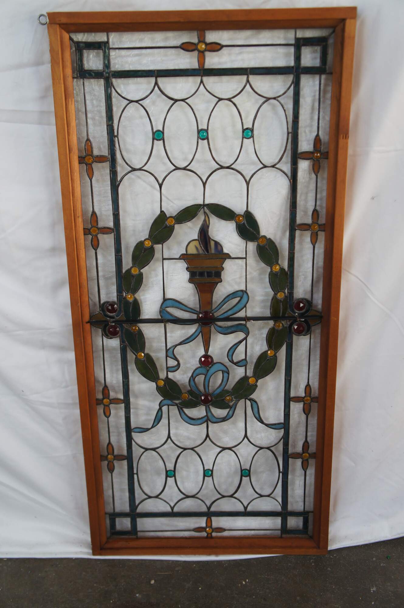 Rare and exceptional antique leaded stained glass window. Features a French Neoclassical ribboned motif with Olympic Torch at the center set within a wreath. The window showcases an impressive backing with arched, oval and floret accents. An impressive addition to any space.