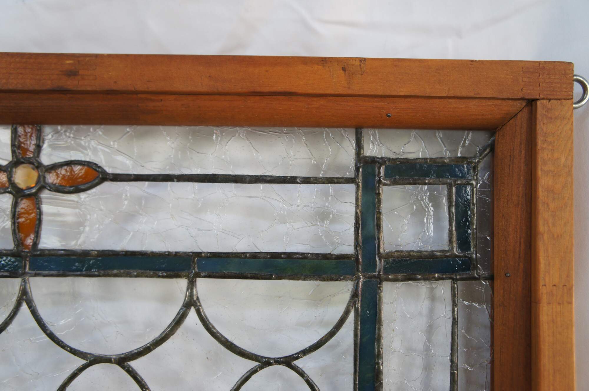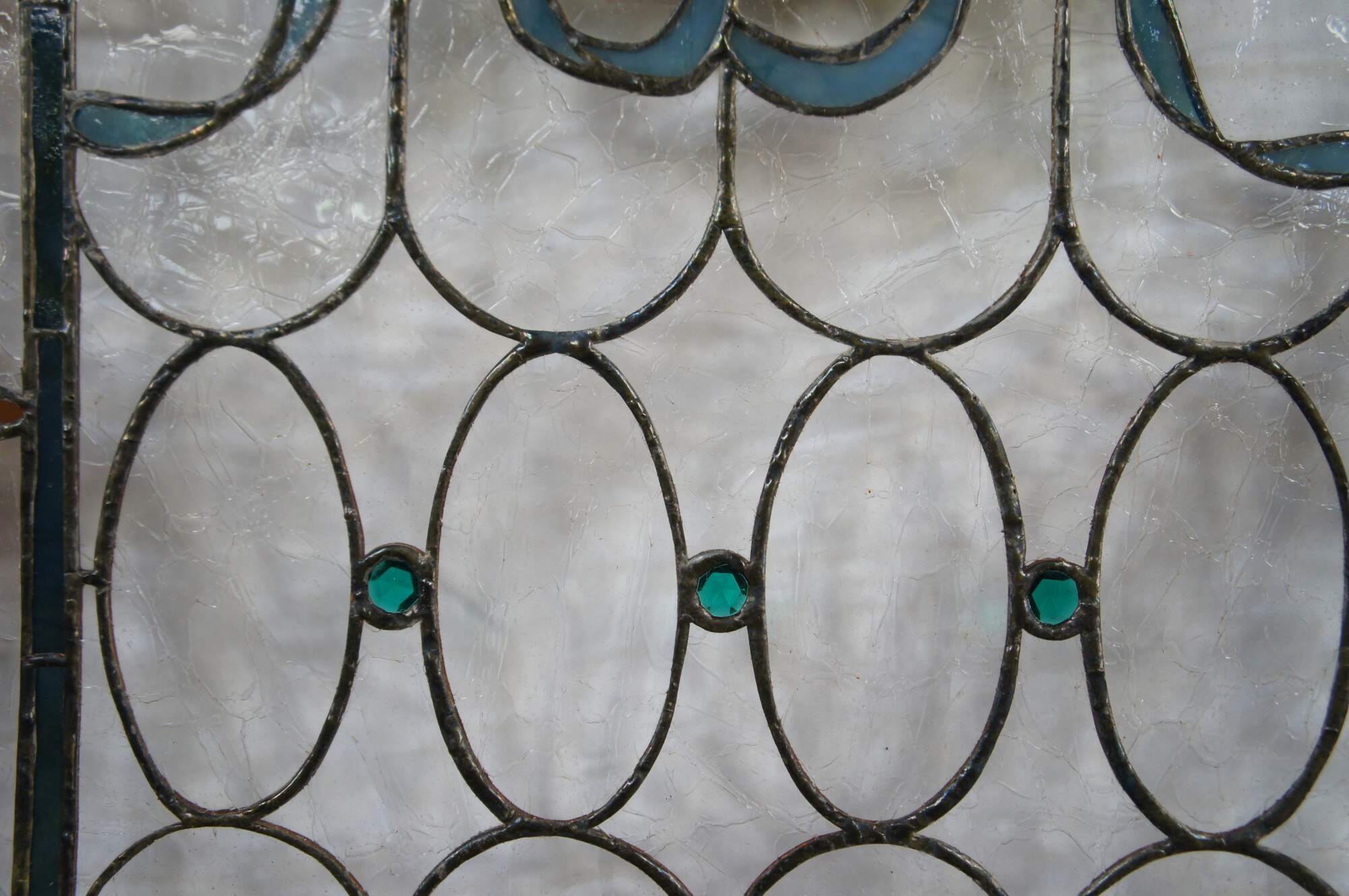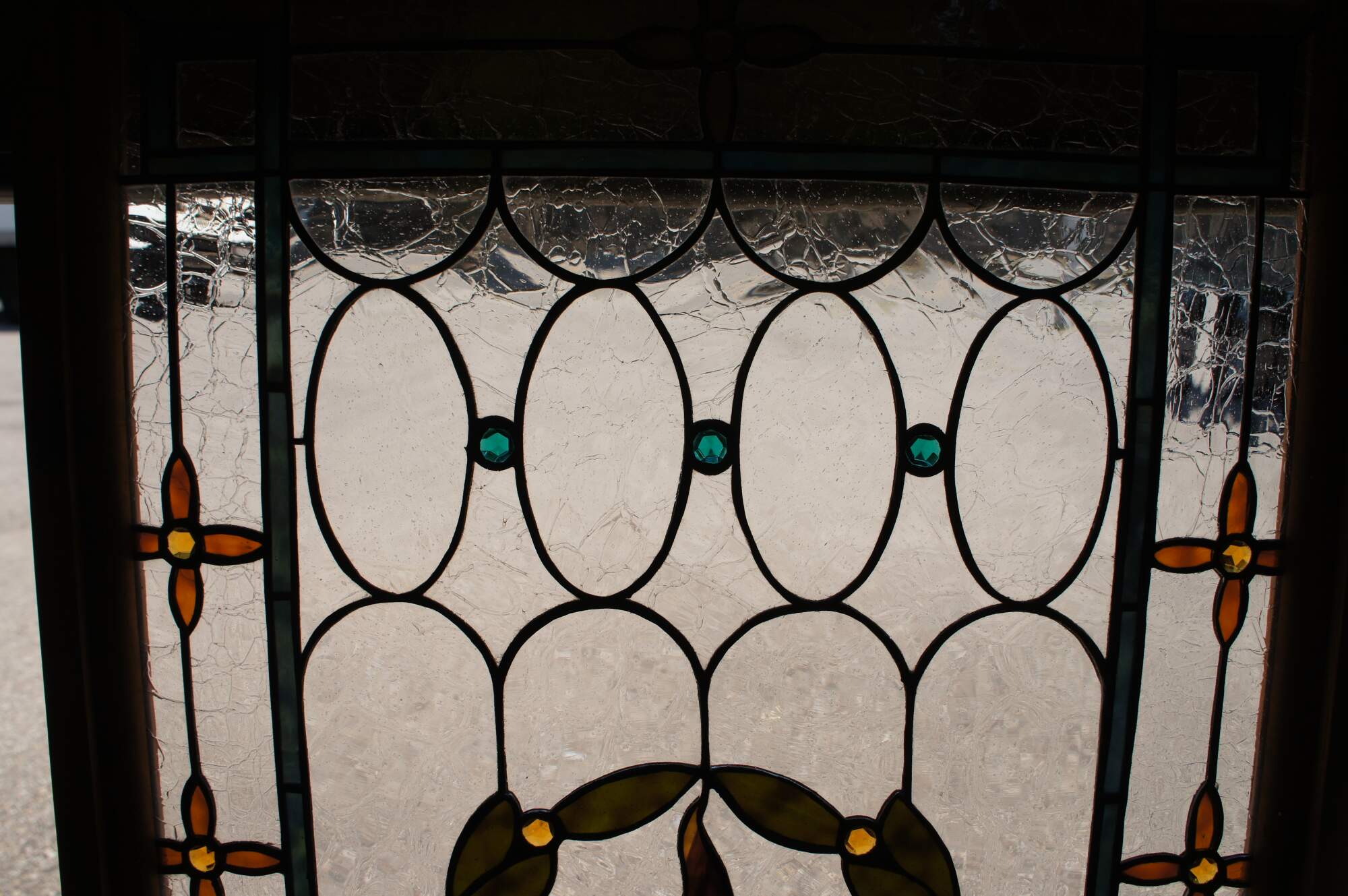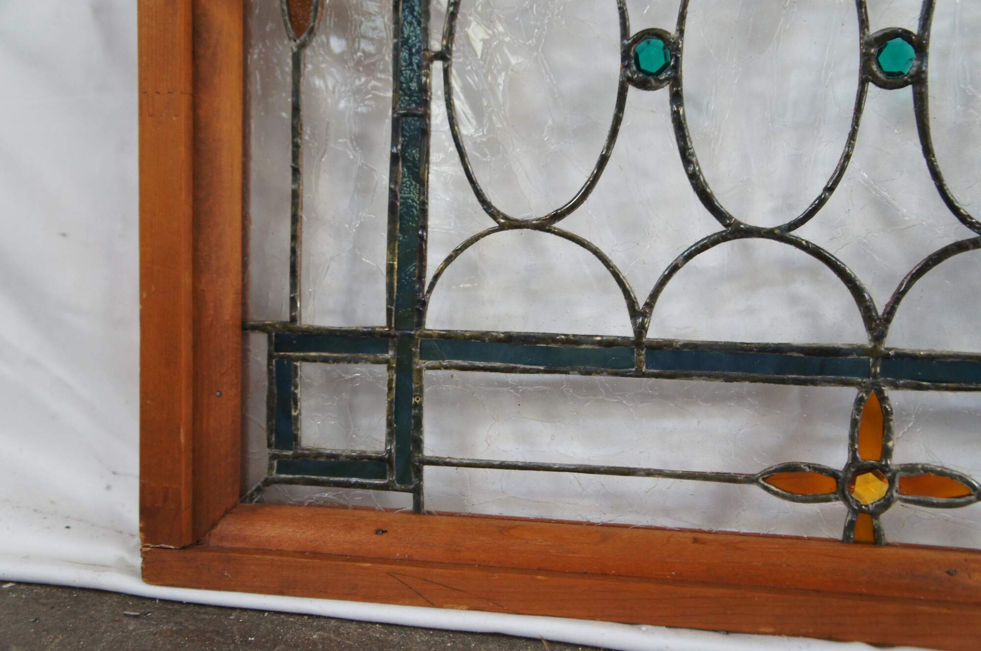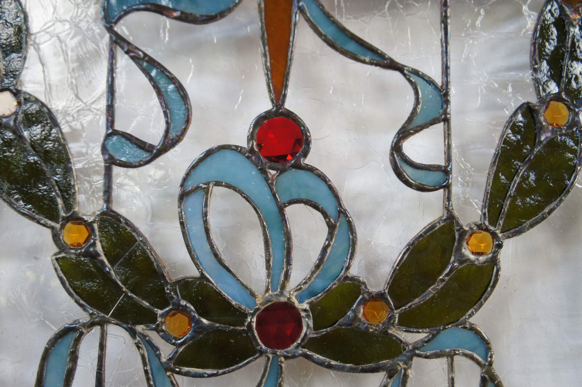 Rare and exceptional antique leaded stained glass window. Features a French Neoclassical ribboned motif with Olympic Torch at the center set within a wreath. The window showcases an impressive backing with arched, oval and floret accents. An impressive addition to any space.
