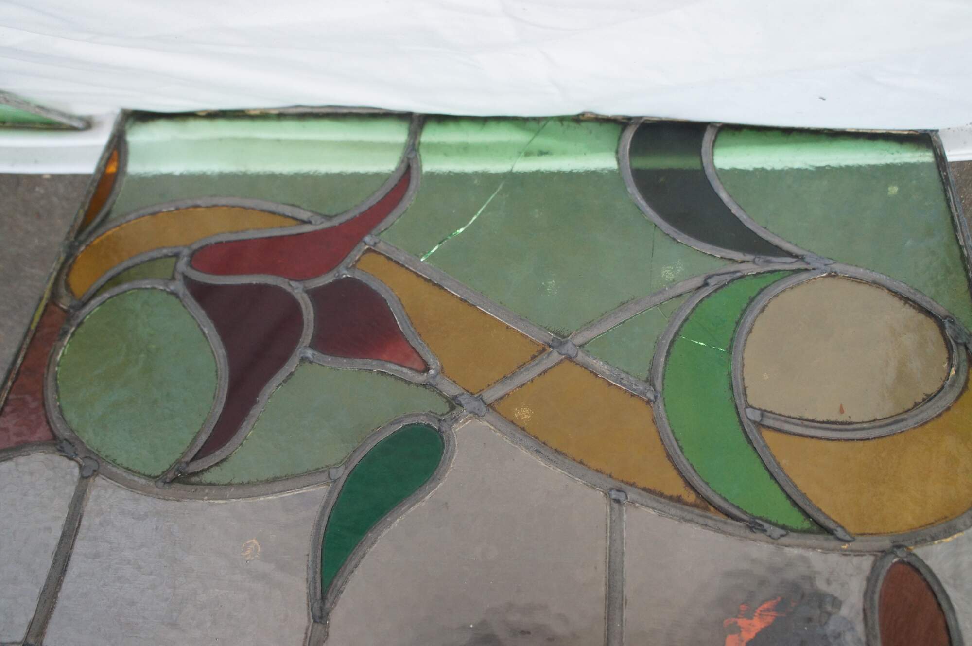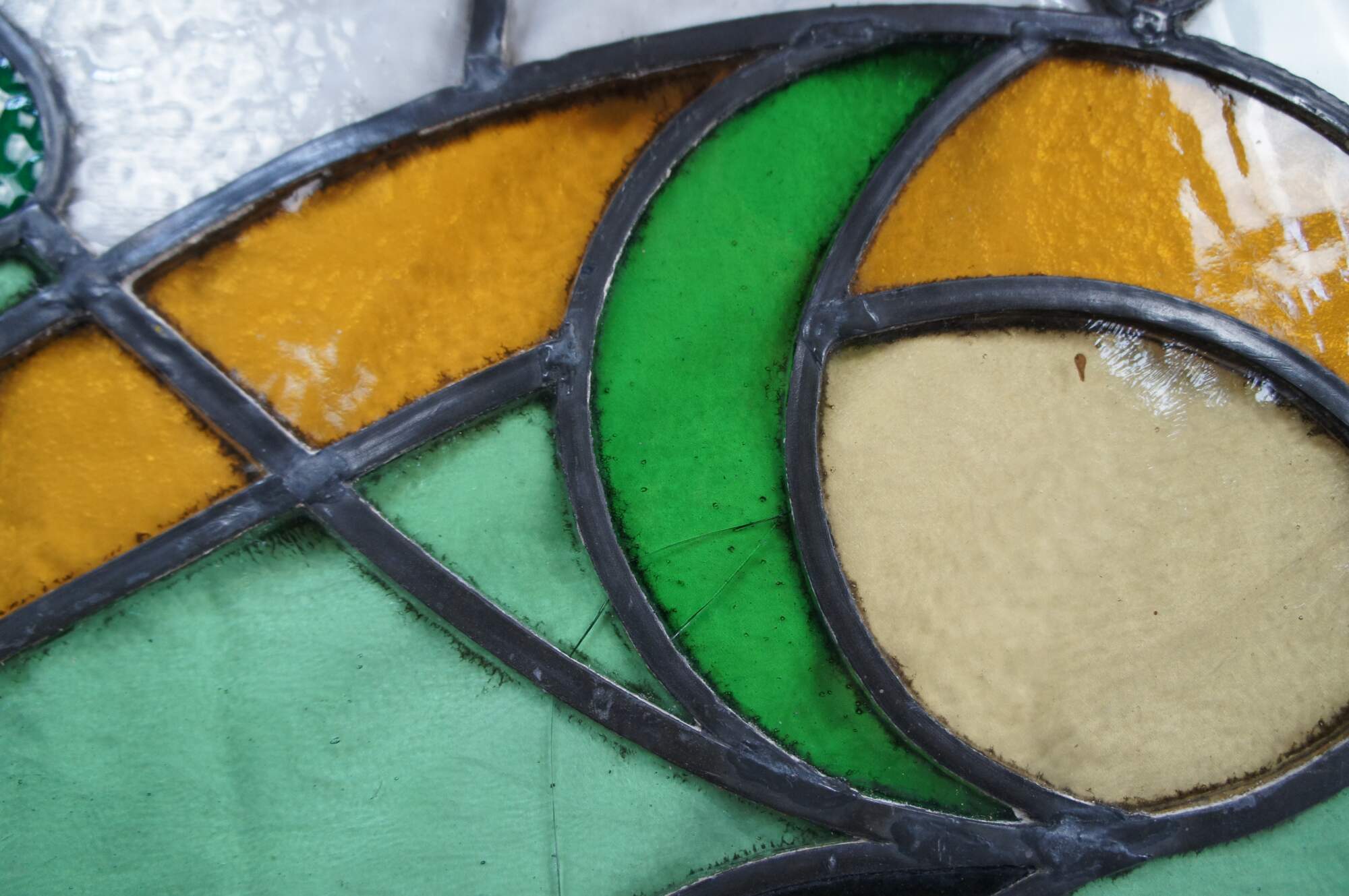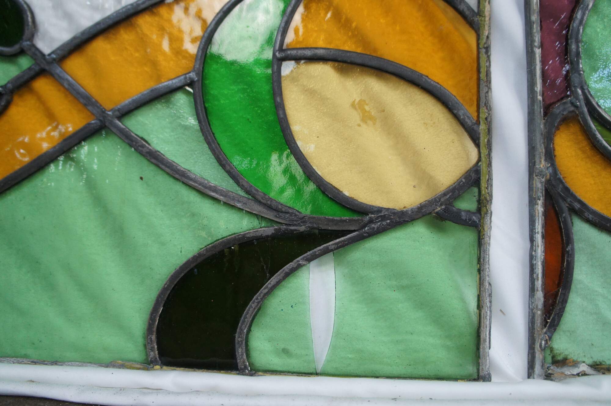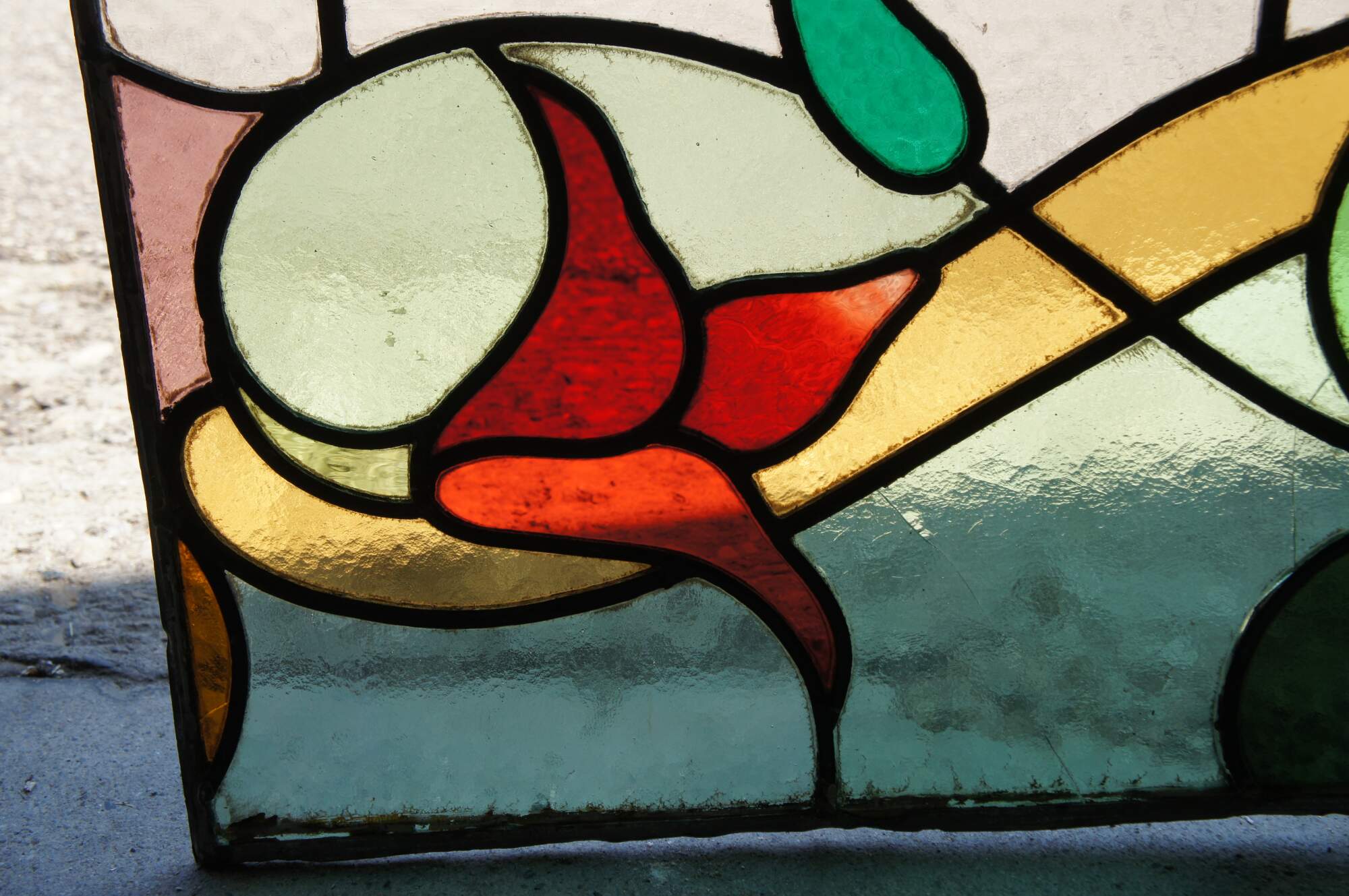A trio of antique Victorian leaded stained glass windows. Features a floral motif with green, amber, yellow and ruby colored stained glass.