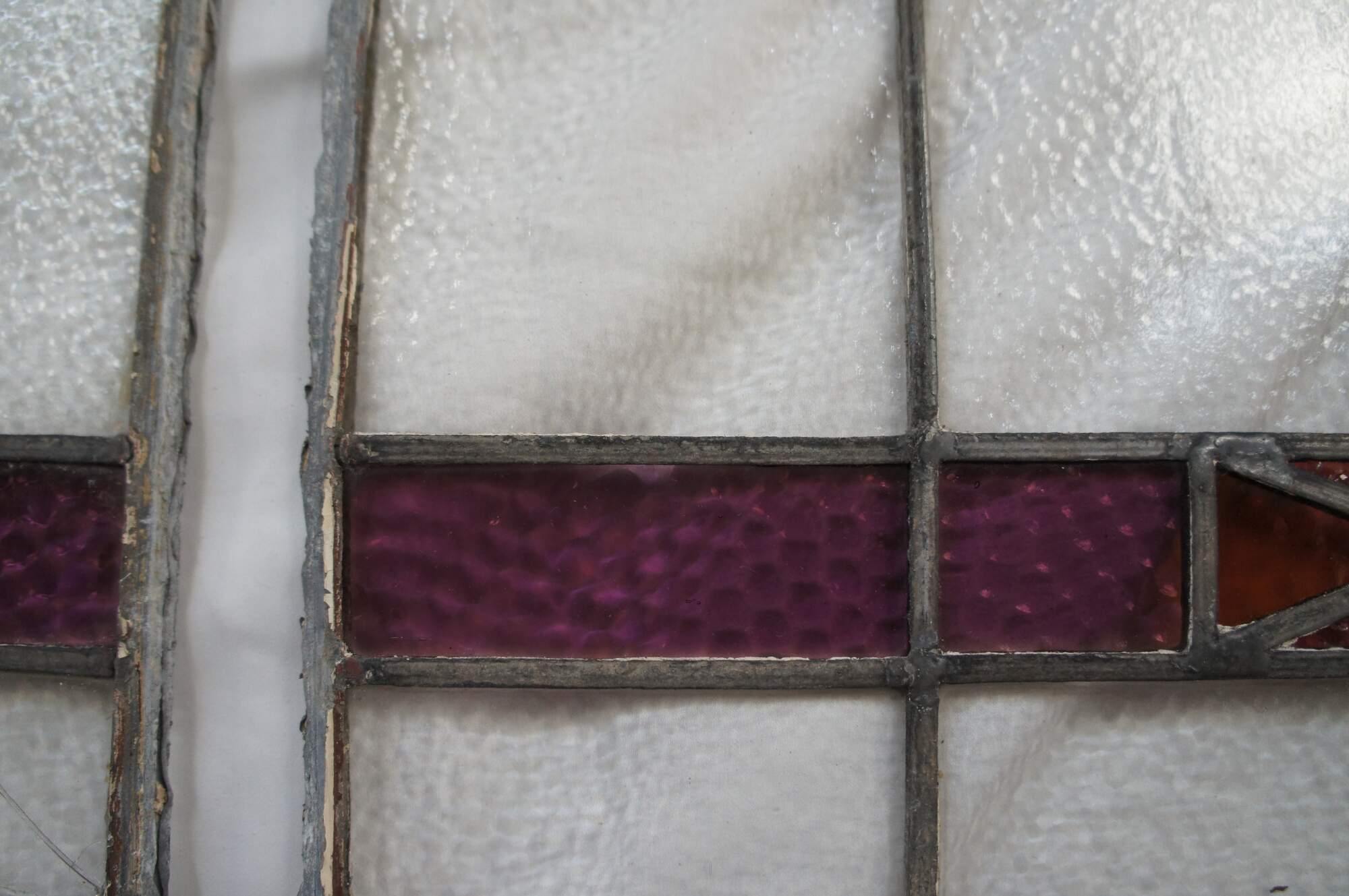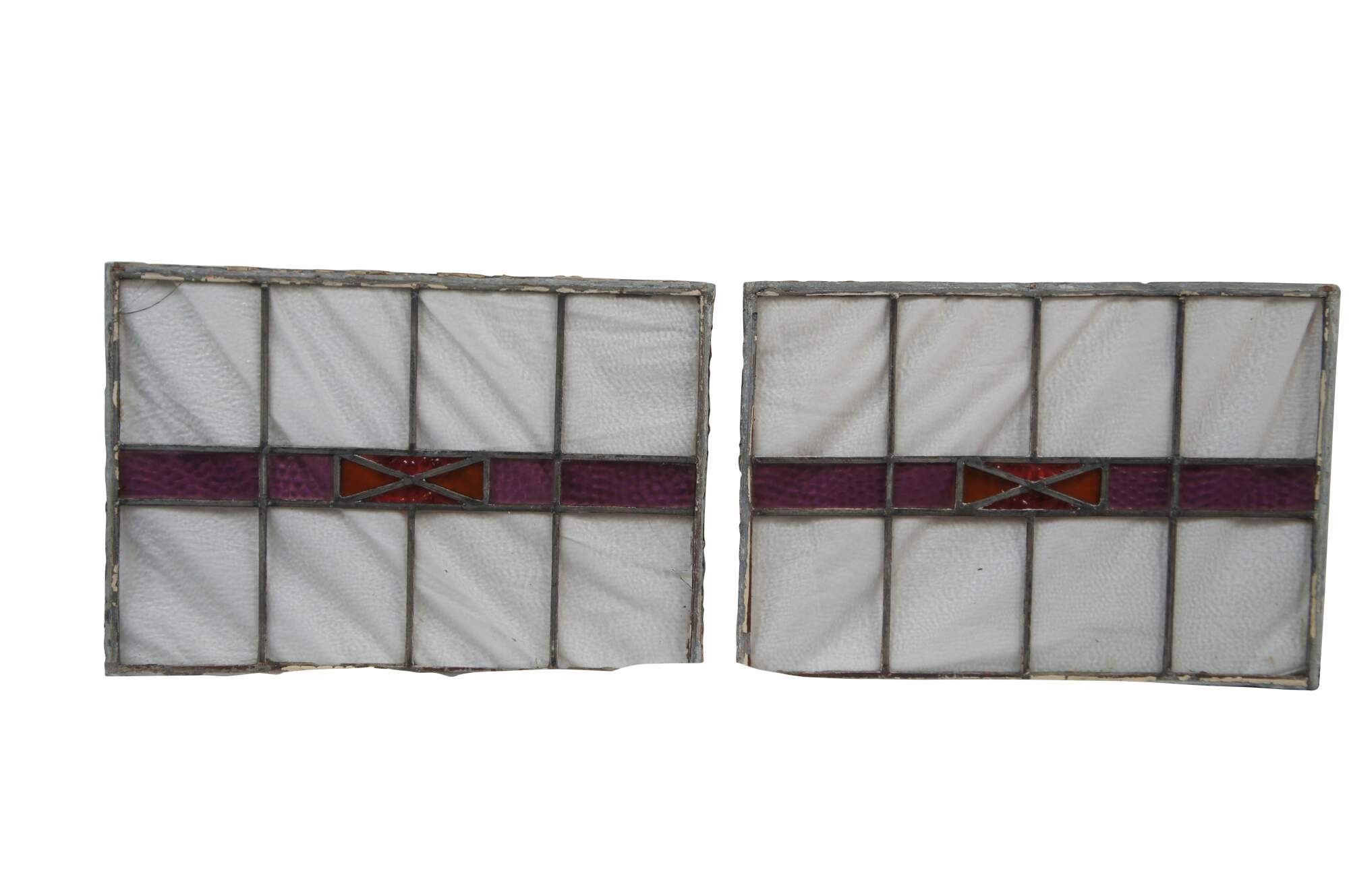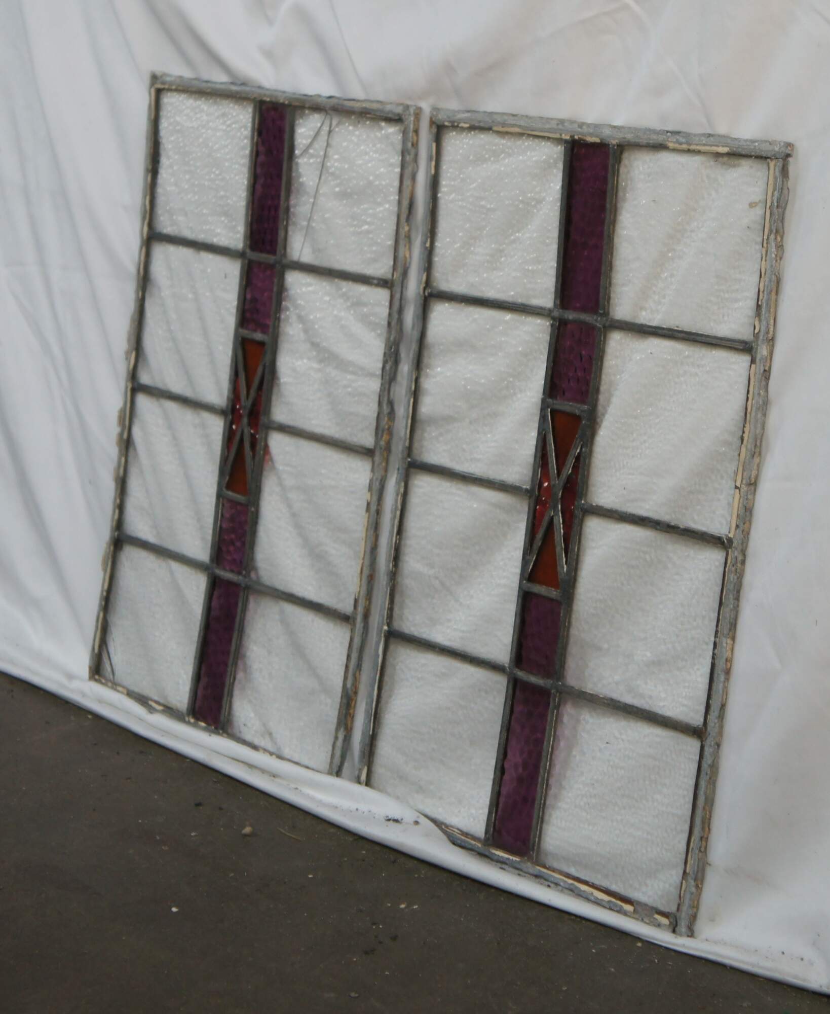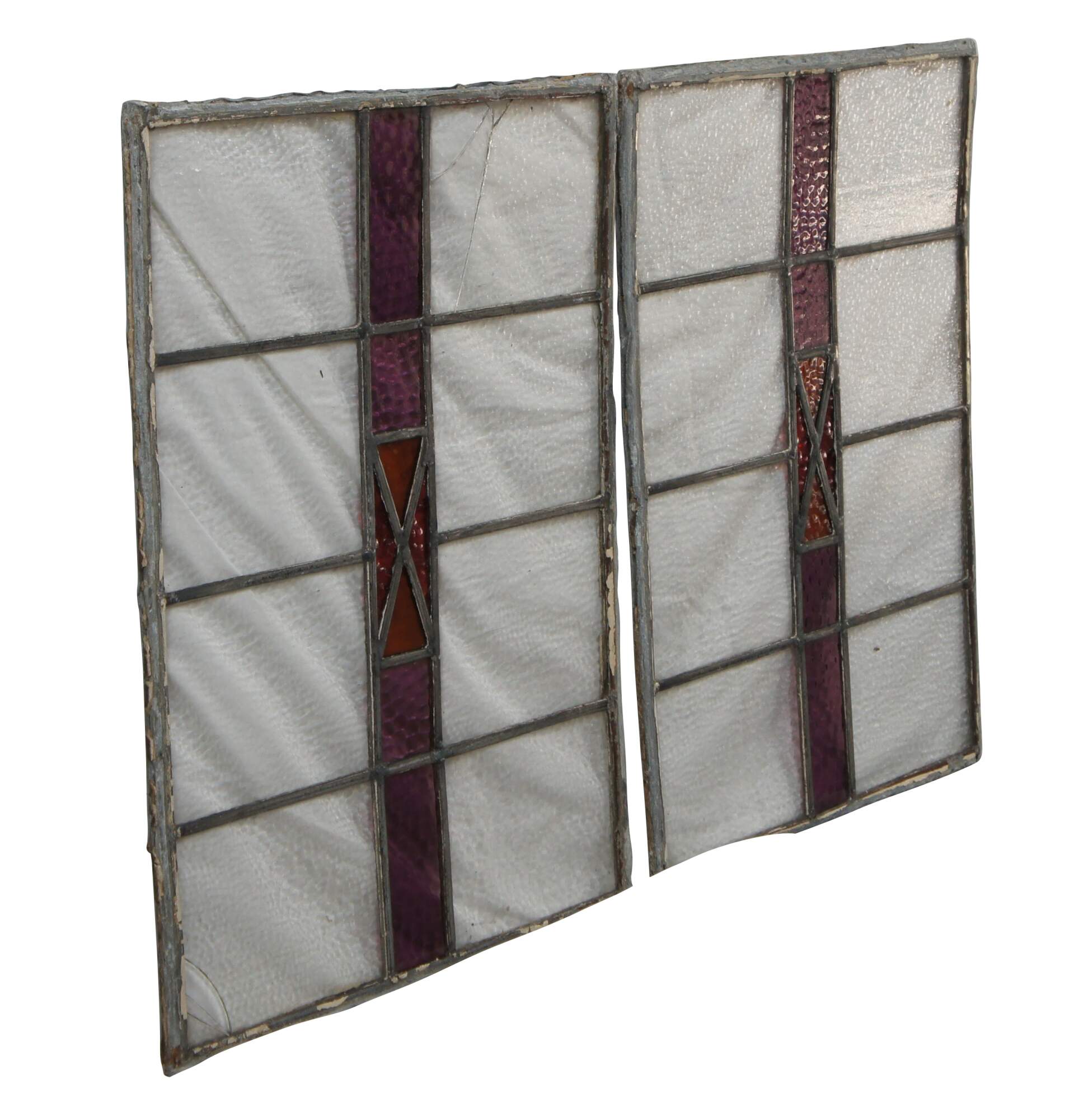 Pair of Antique Victorian Leaded Stained Glass windows. Features a gridded pattern with an amethyst stripe and X pattern center in red. The glass is all in a pebbled motif.