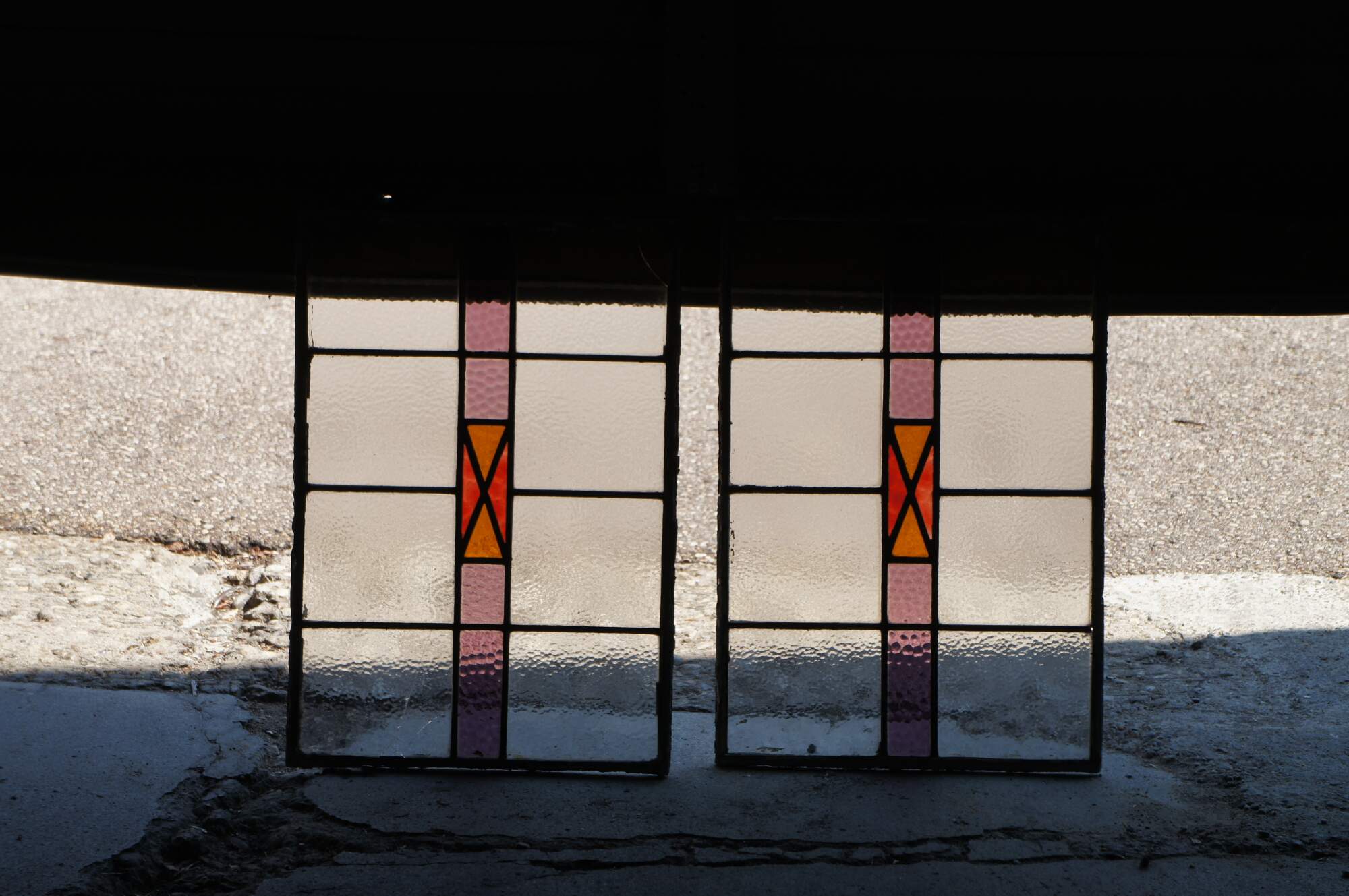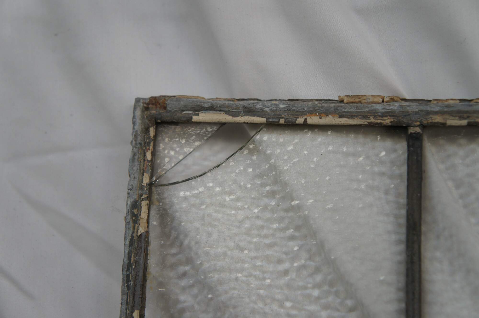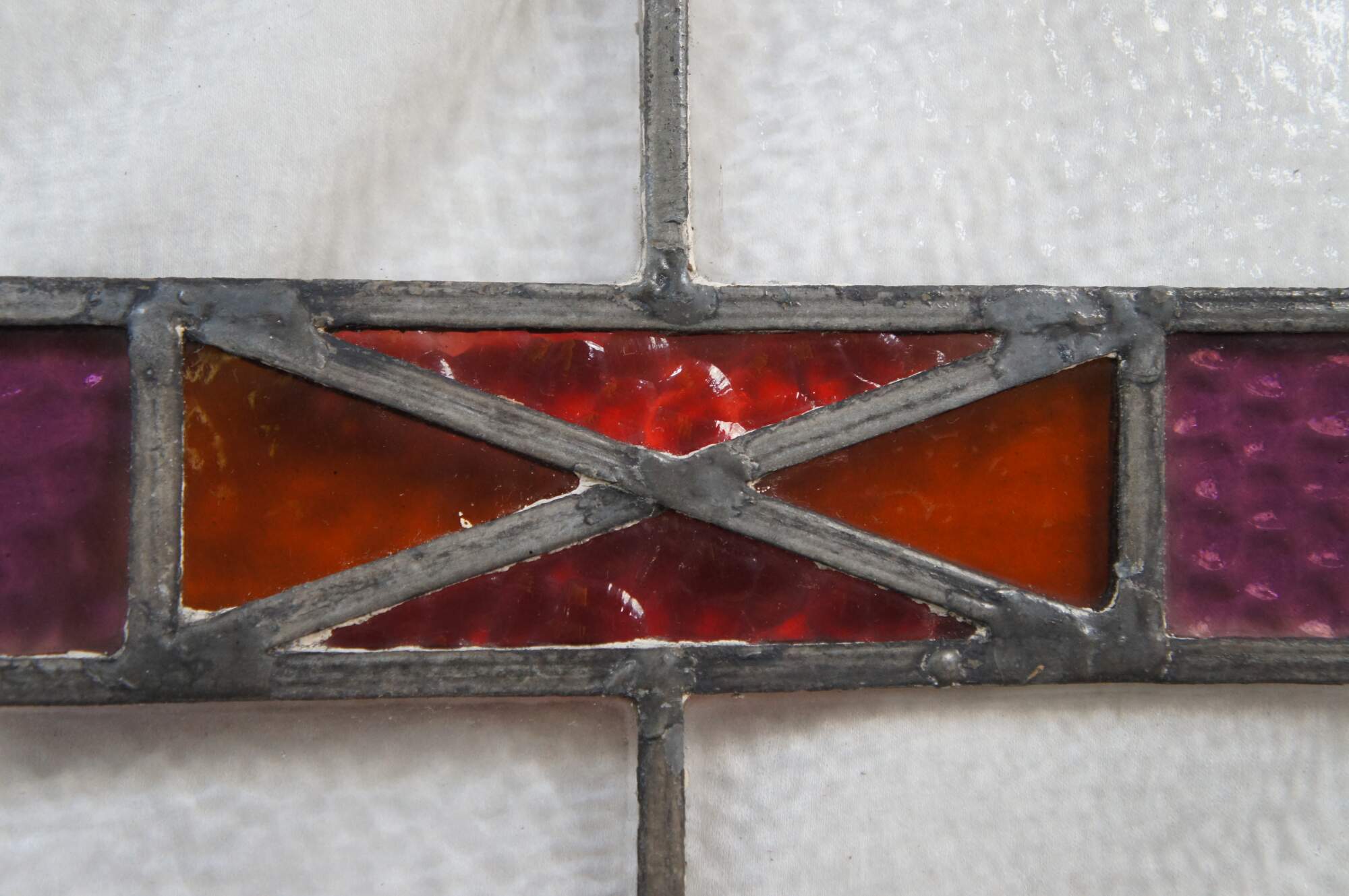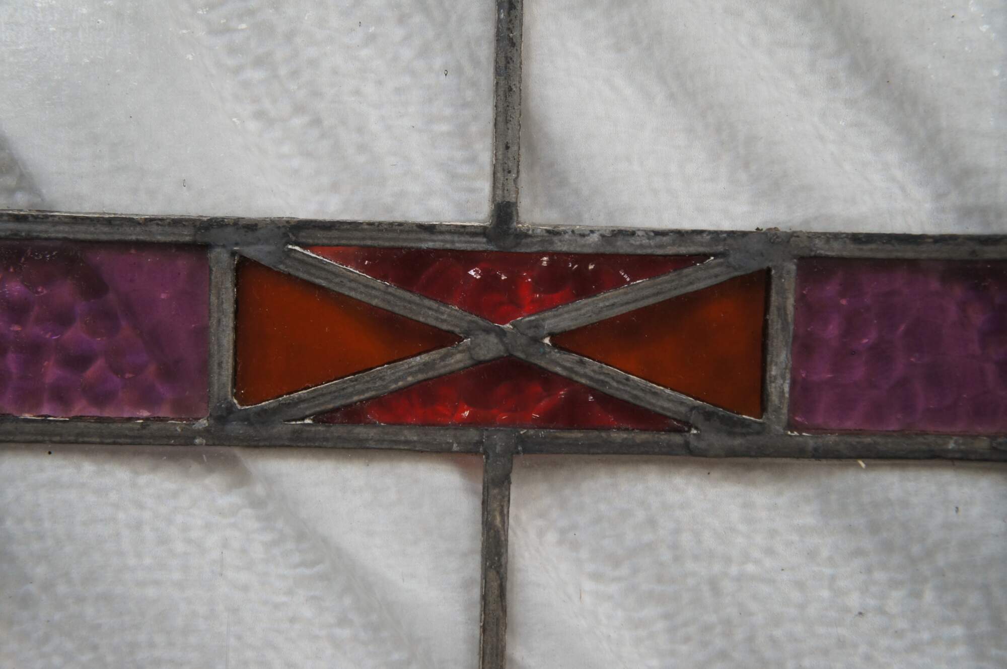 Pair of Antique Victorian Leaded Stained Glass windows. Features a gridded pattern with an amethyst stripe and X pattern center in red. The glass is all in a pebbled motif.