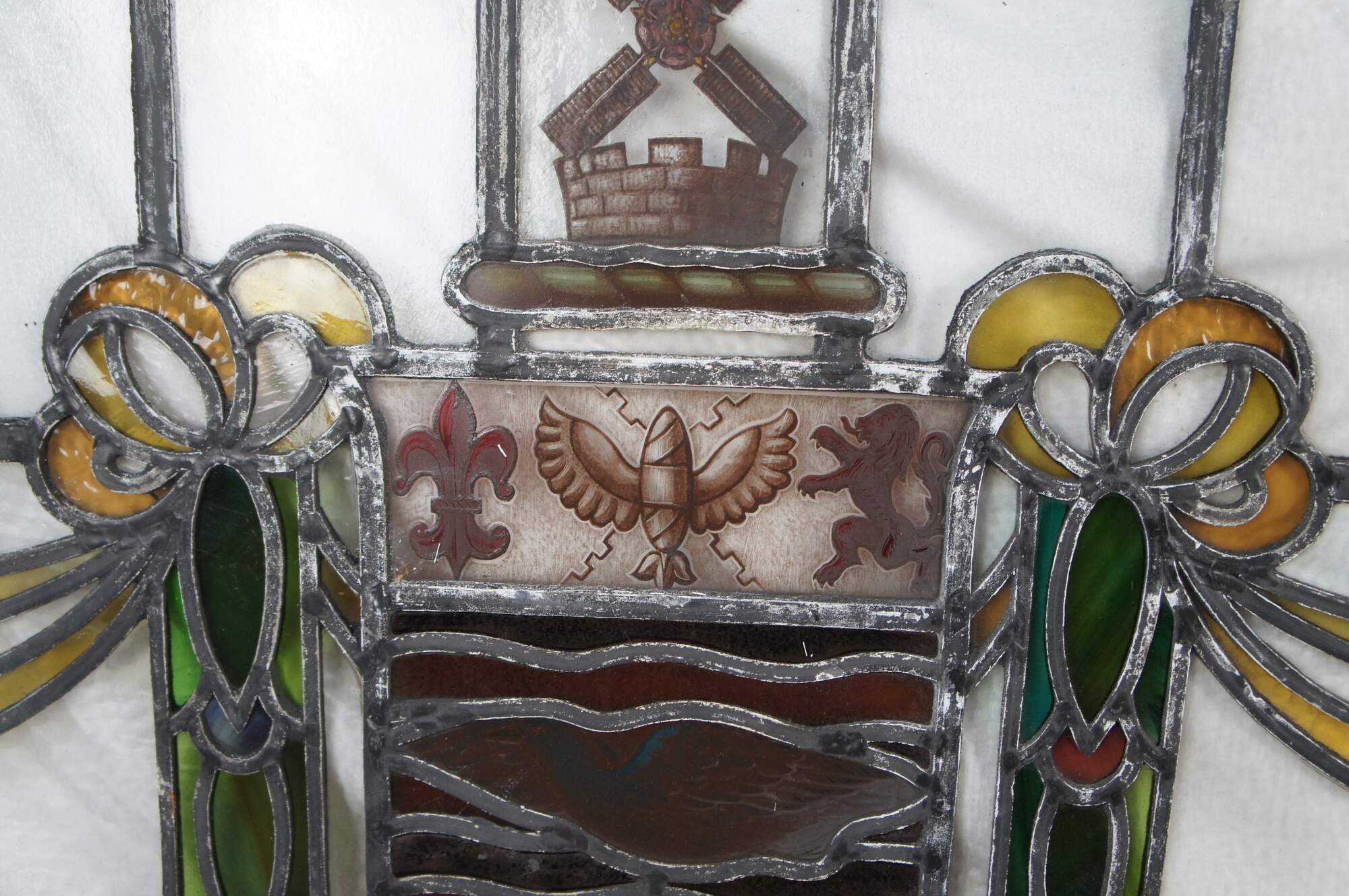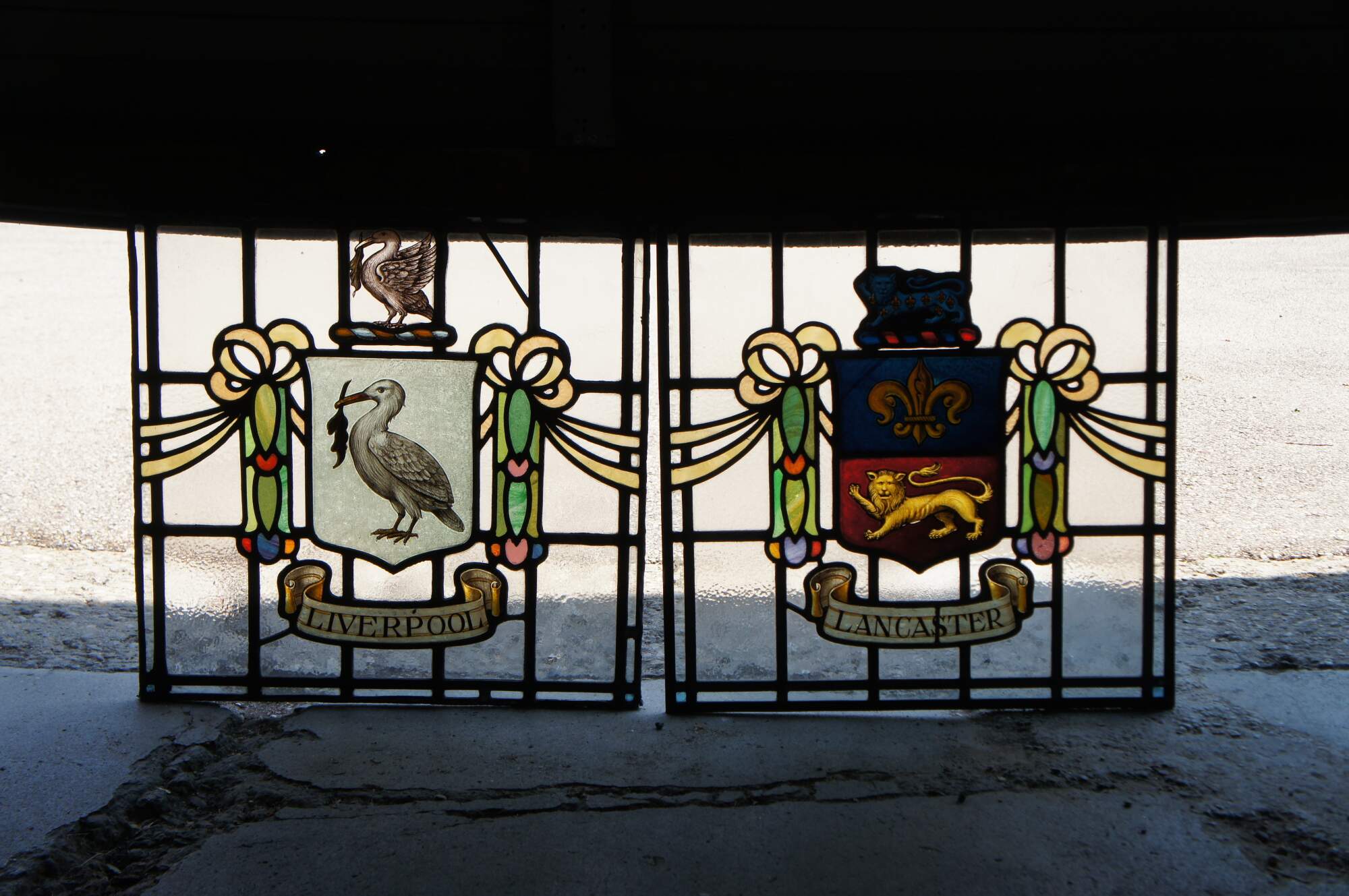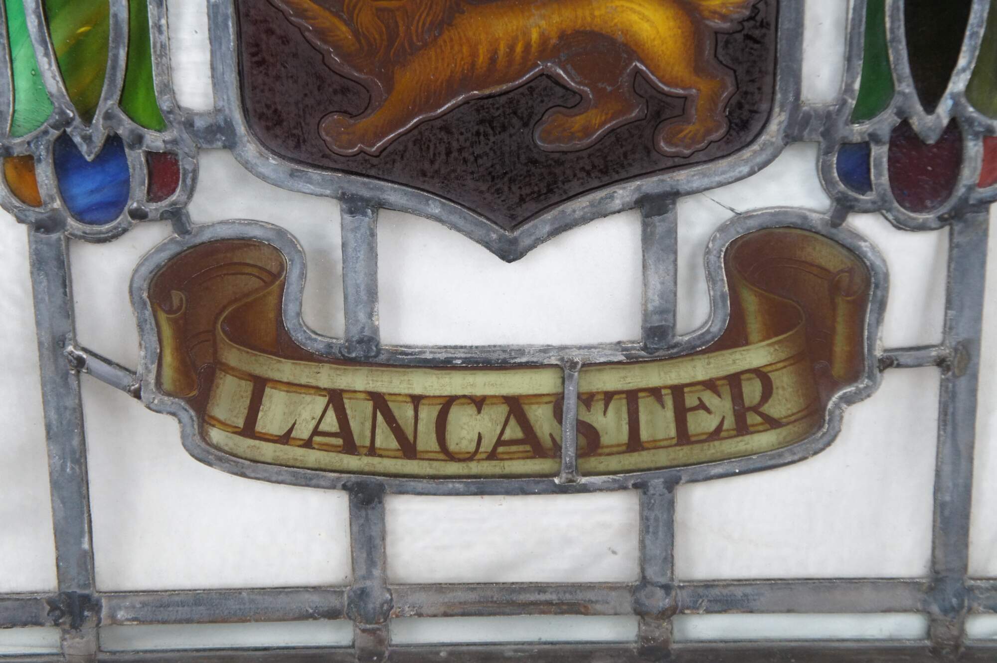 The fleurs-de-lis and lion were part of the old arms of the city, and are themselves derived from the arms of the Duchy of Lancaster. Each lion stands on a garb for the two Rural District Councils.