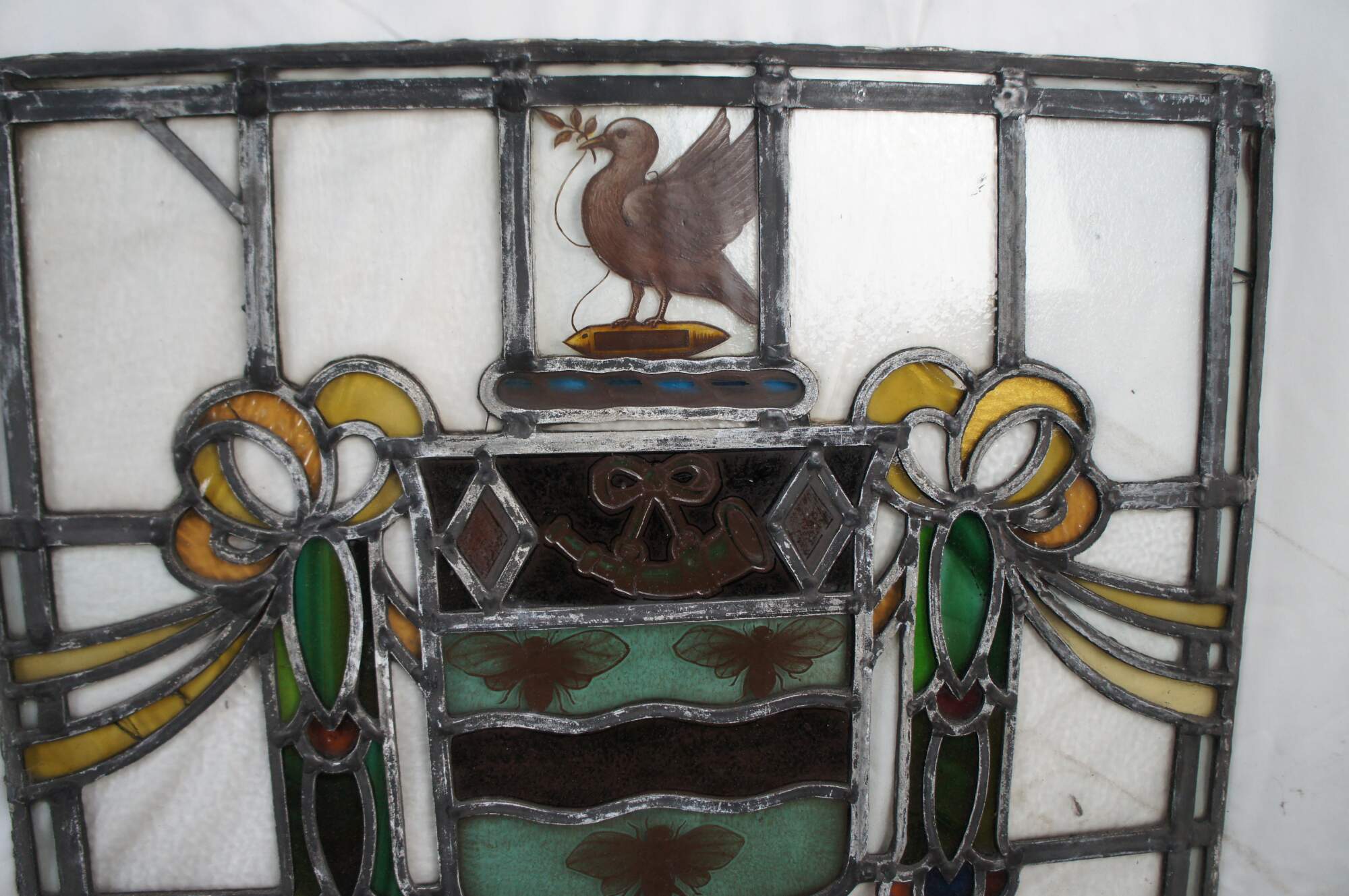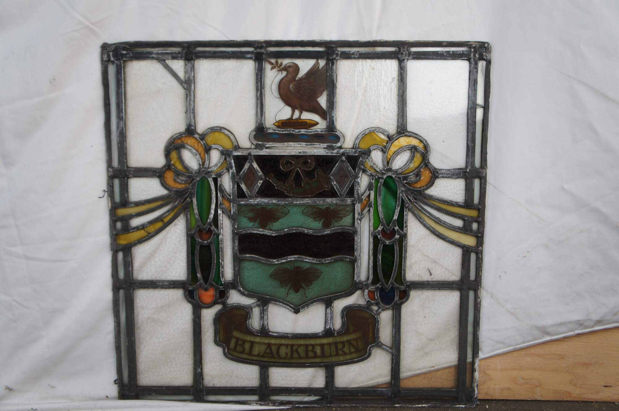 The crest has a dove and olive branch, a popular charge in Victorian civic arms. He stands on a weaver's shuttle. The crest represents the beneficial results emanating from the art of weaving.