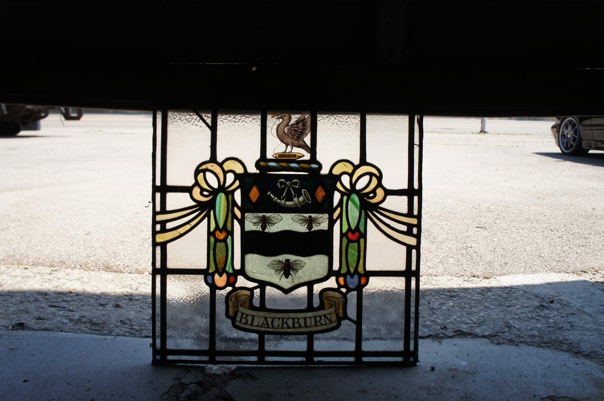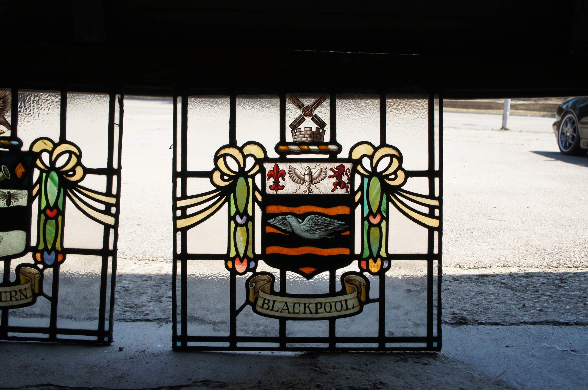 Between a fleurs-de-lys for the Banks family and a lion for the Cocker family is a thunderbolt. This represents the generation of electricity and the town's famous electric trams.