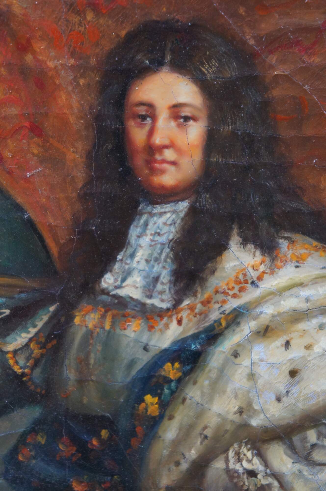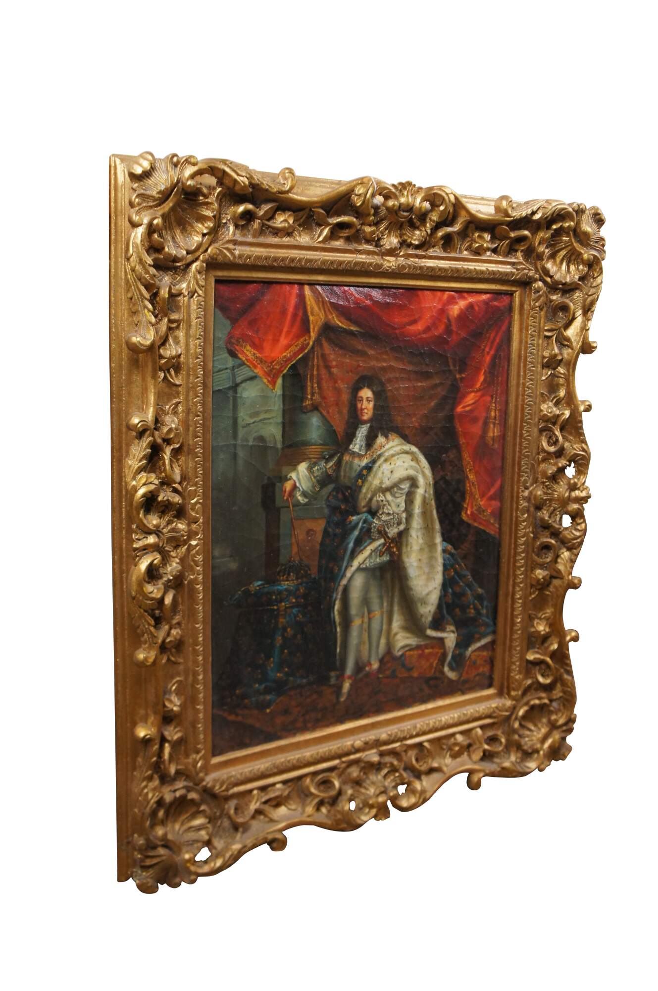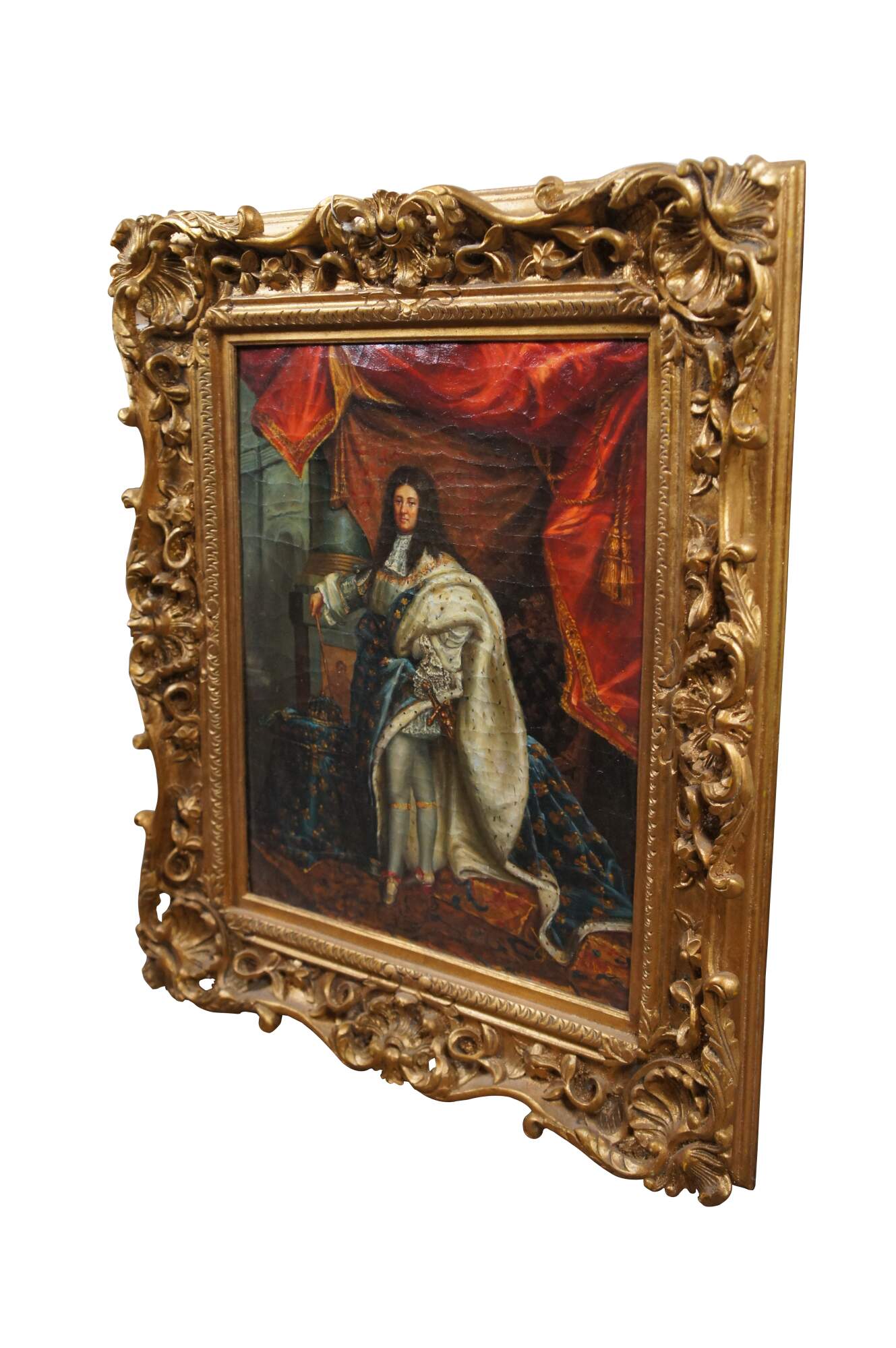 Late 20th Century portrait oil painting after the original portrait of King Louis XIV by Hyacinthe Rigaud. The original was painted in 1701 and is on display at the Montreal Museum of Fine Arts. This painting was executed on canvas with Craquelure and signed lower right. The painting is framed in wood with a baroque raised design and gold finish. Baroque gold resin frame.