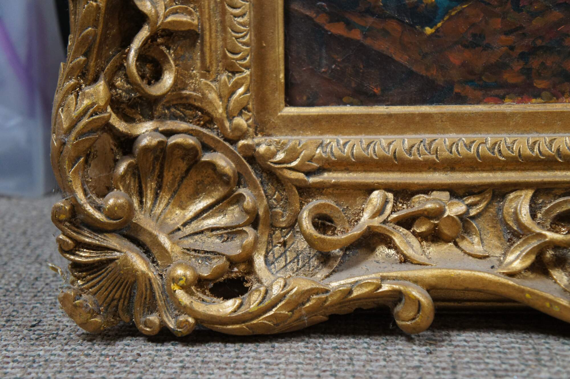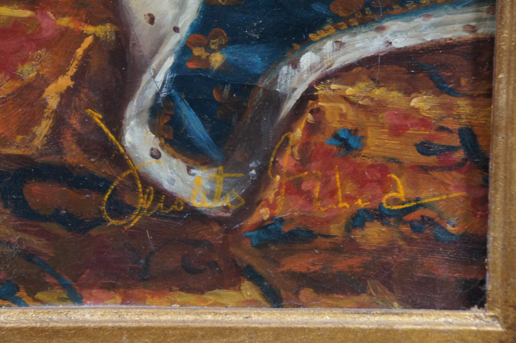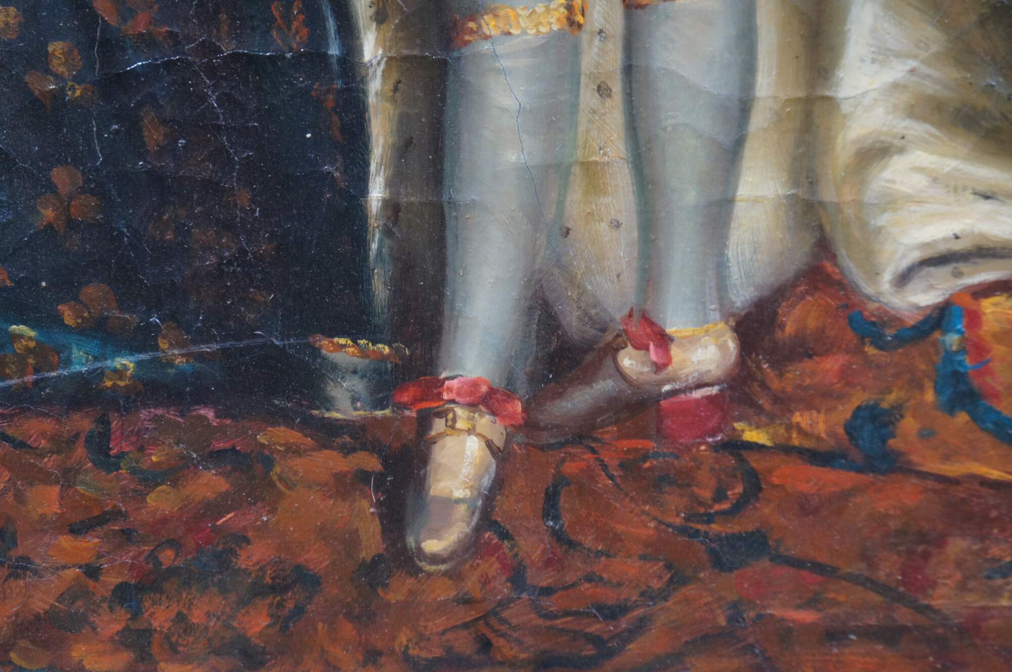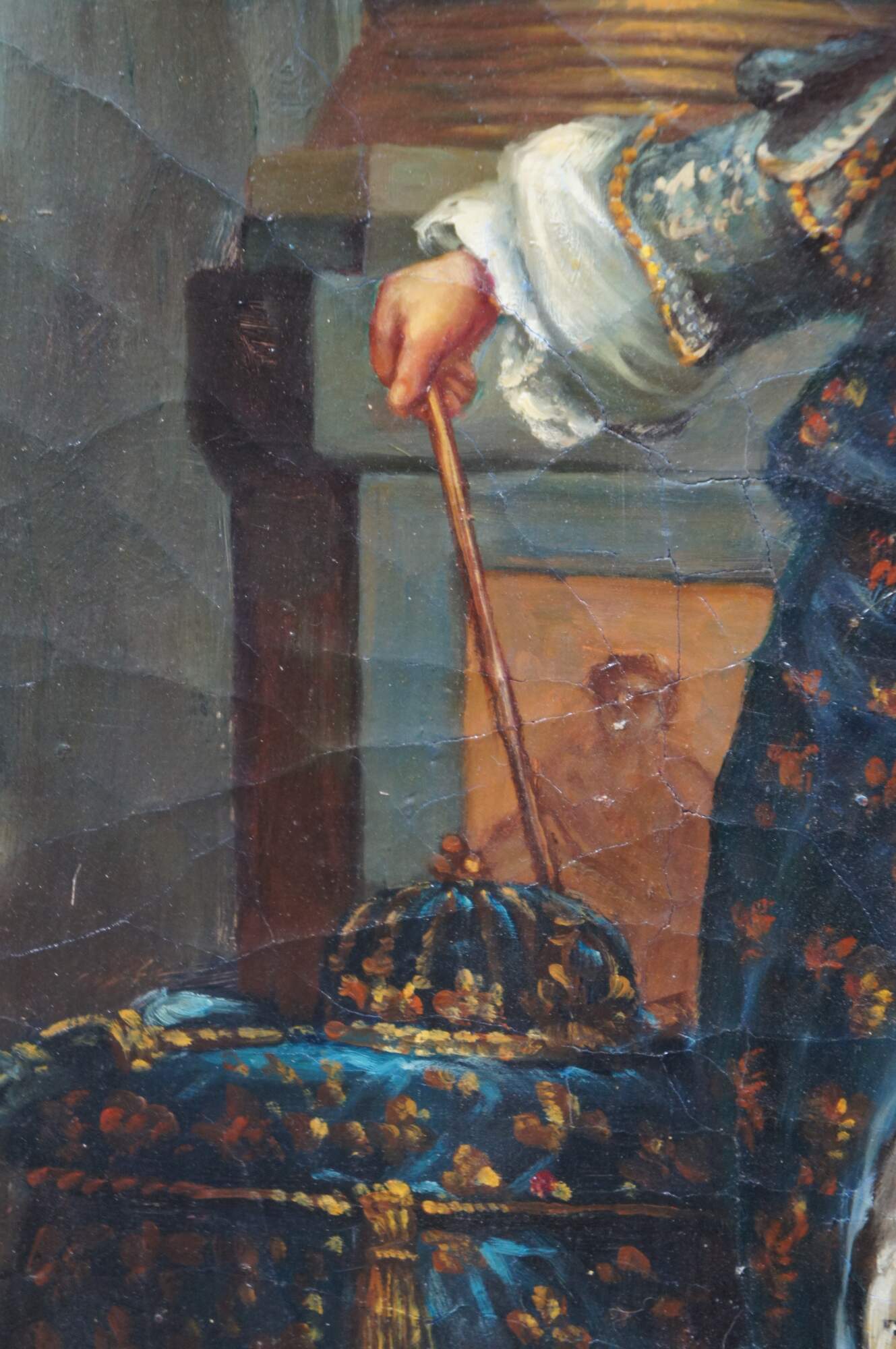 Late 20th Century portrait oil painting after the original portrait of King Louis XIV by Hyacinthe Rigaud. The original was painted in 1701 and is on display at the Montreal Museum of Fine Arts. This painting was executed on canvas with Craquelure and signed lower right. The painting is framed in wood with a baroque raised design and gold finish. Baroque gold resin frame.