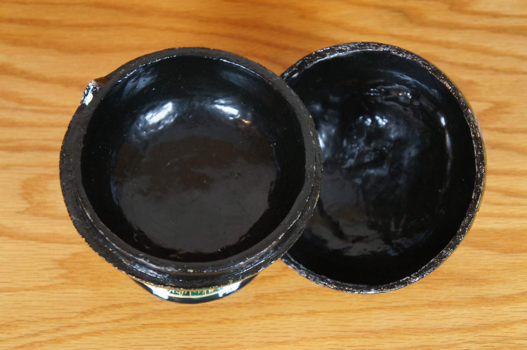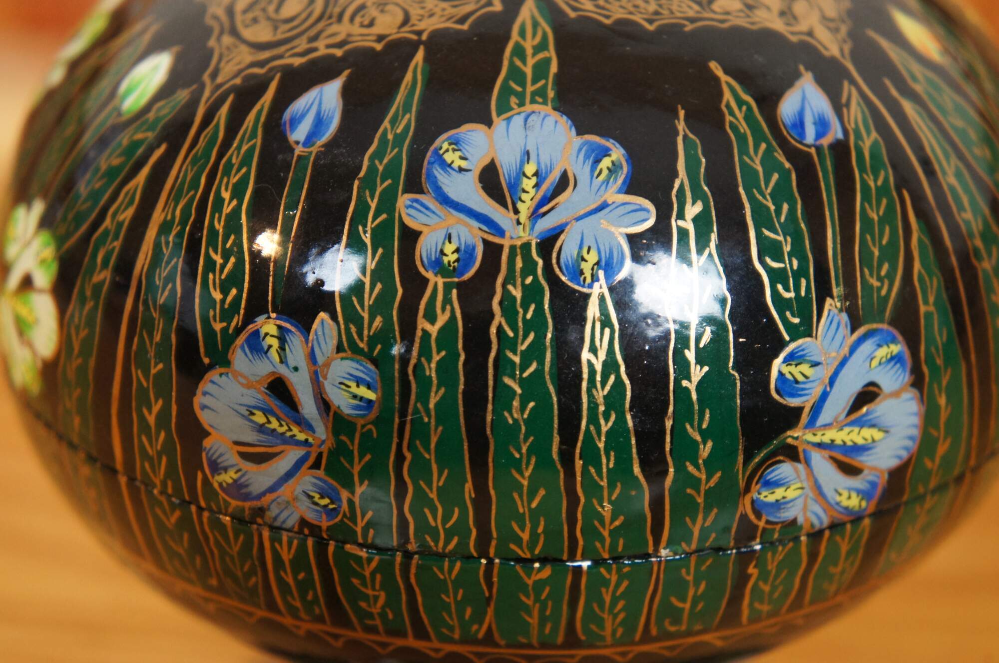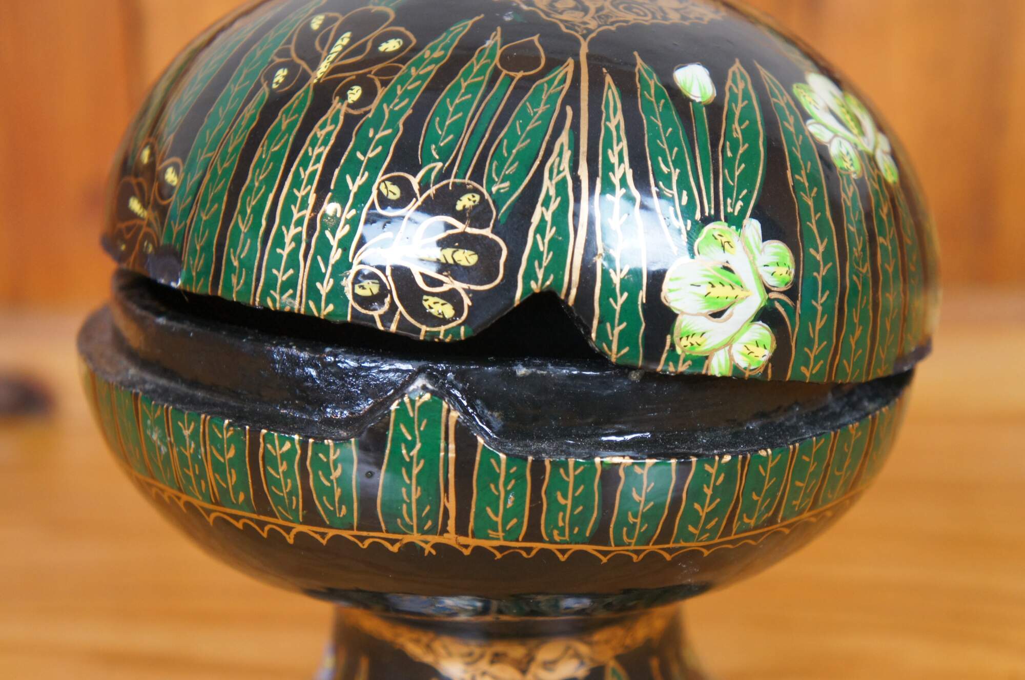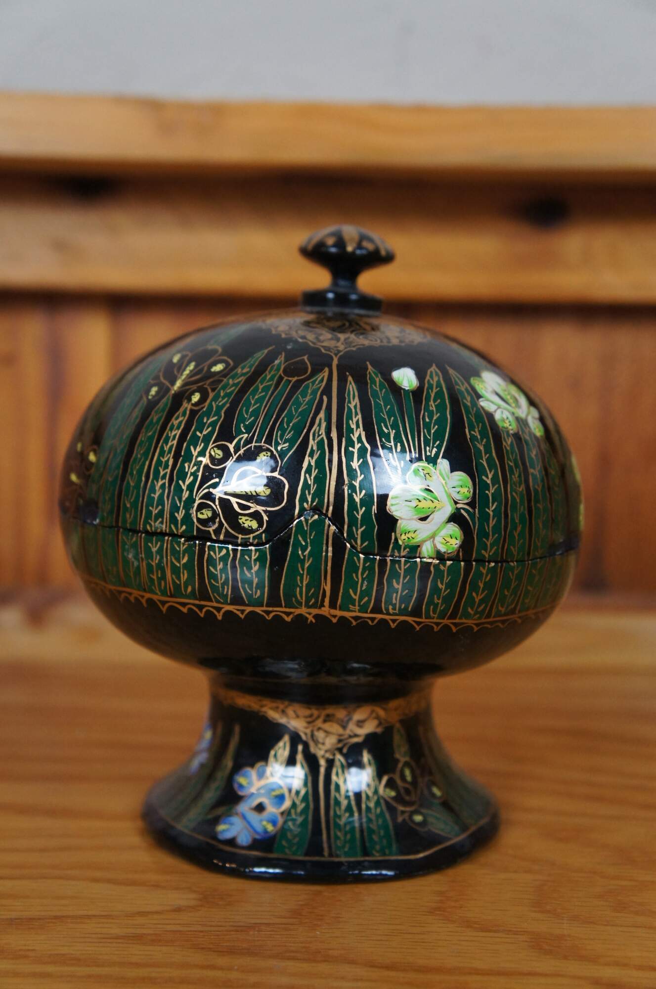 Vintage black laquered lidded pedestal kashmir / kashmiri papier mâché box made in India. It features a floral motif with leaves and flowers.