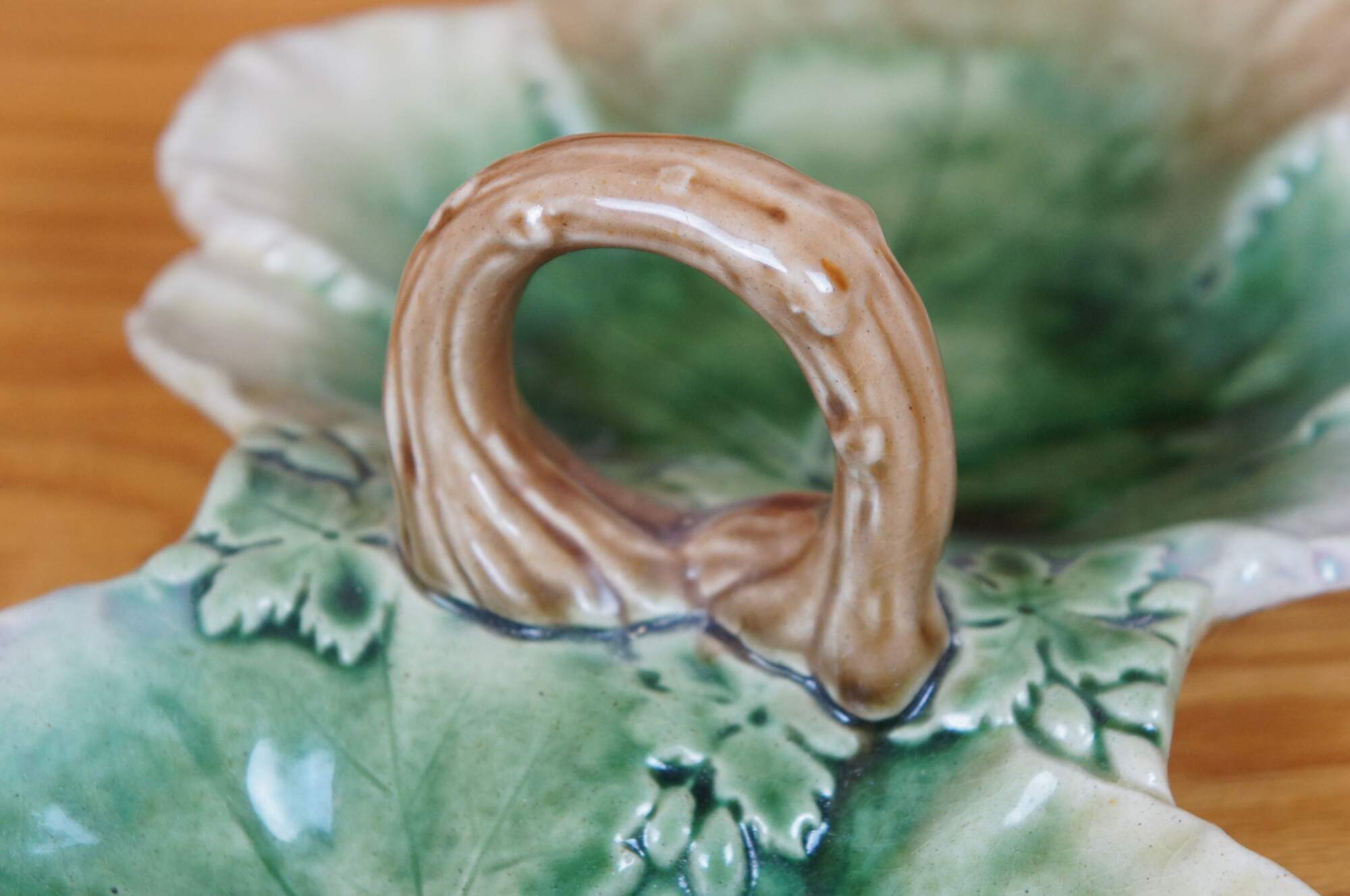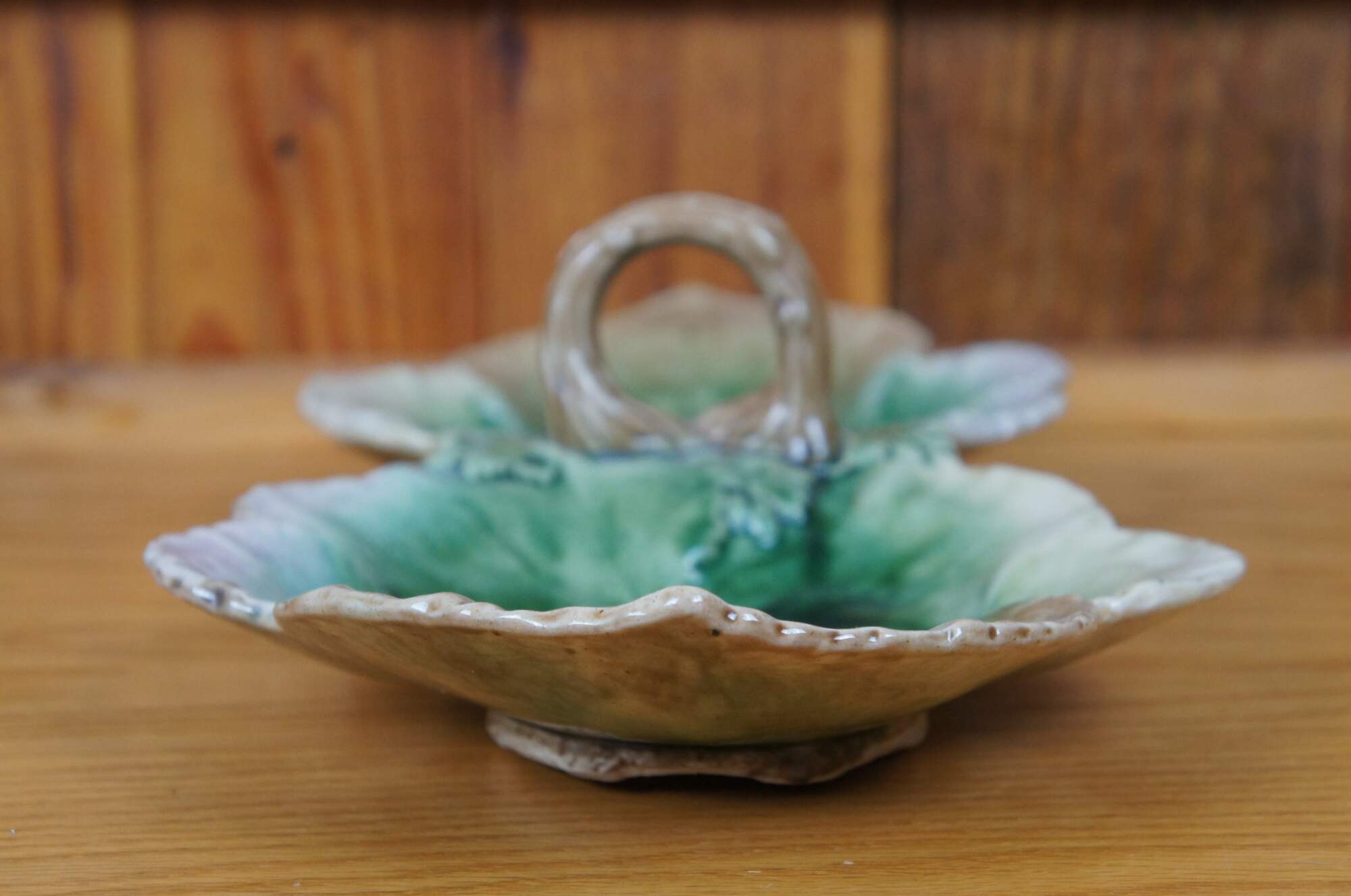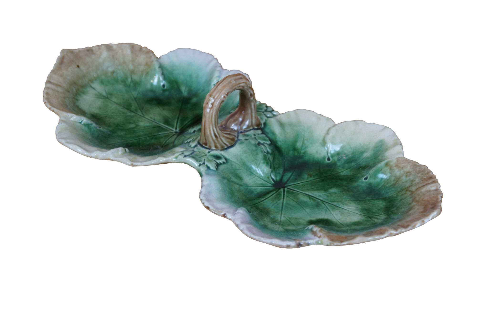 Antique Majolica footed double leaf plates / strawberry platter / serving dish / bowl / basket / compote featuring two green leaves with a twig / branch handle.