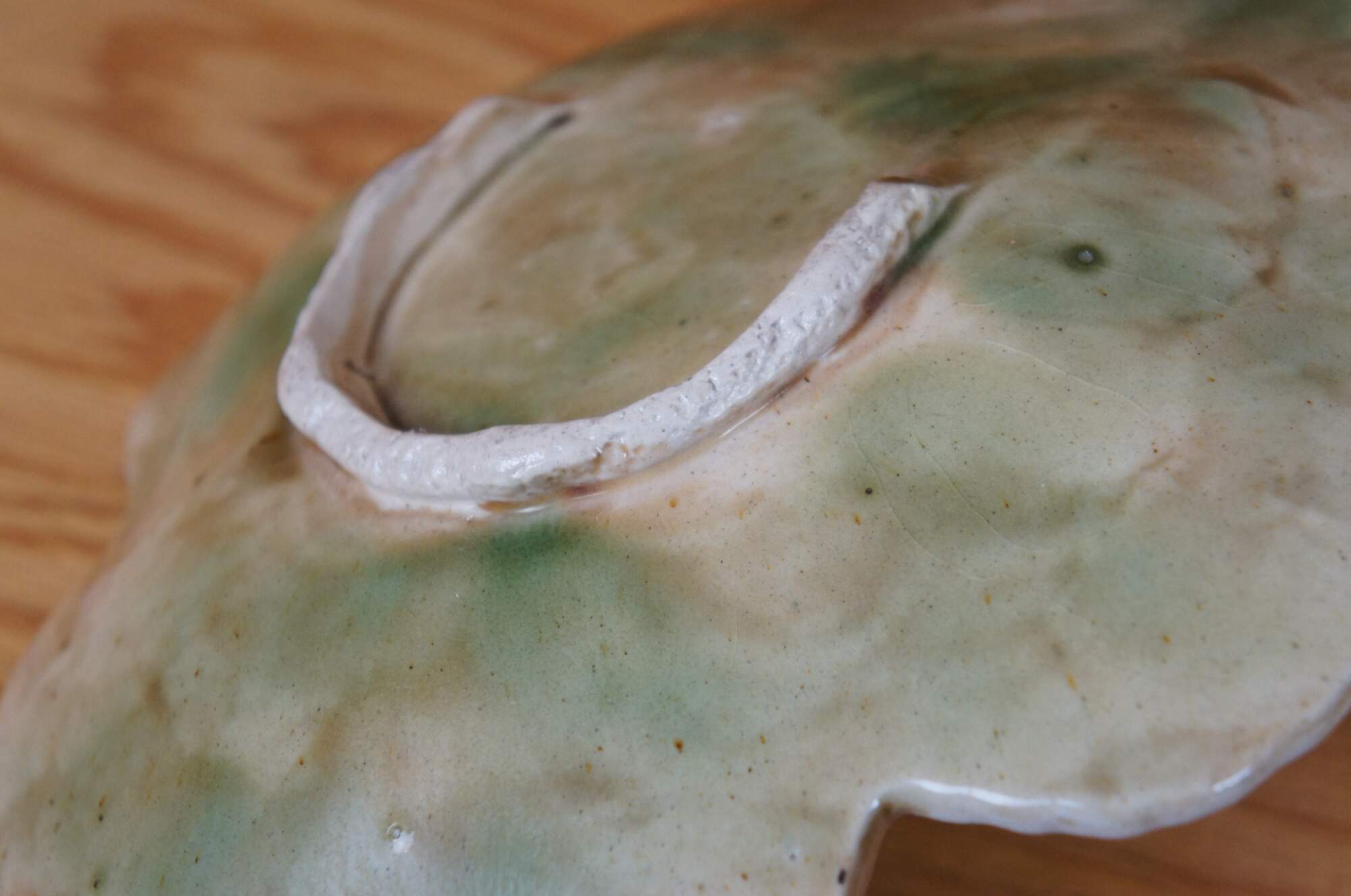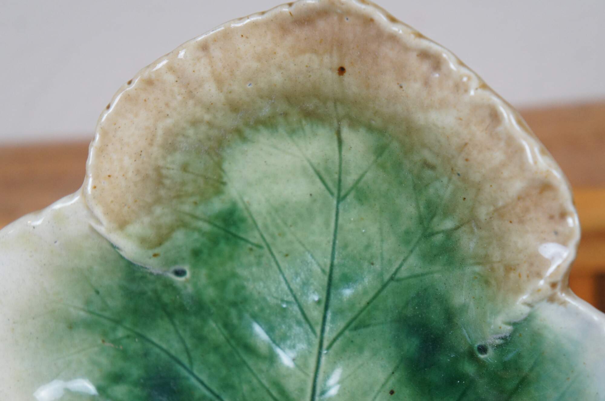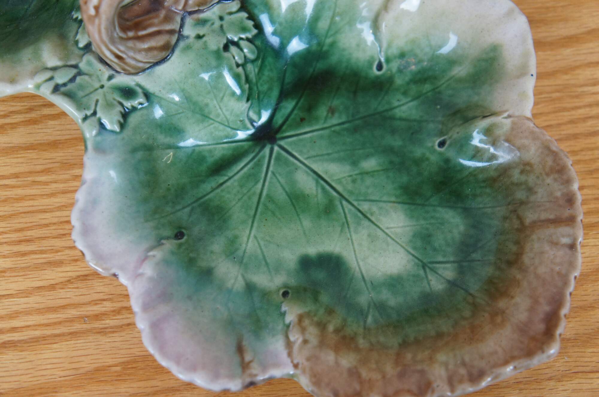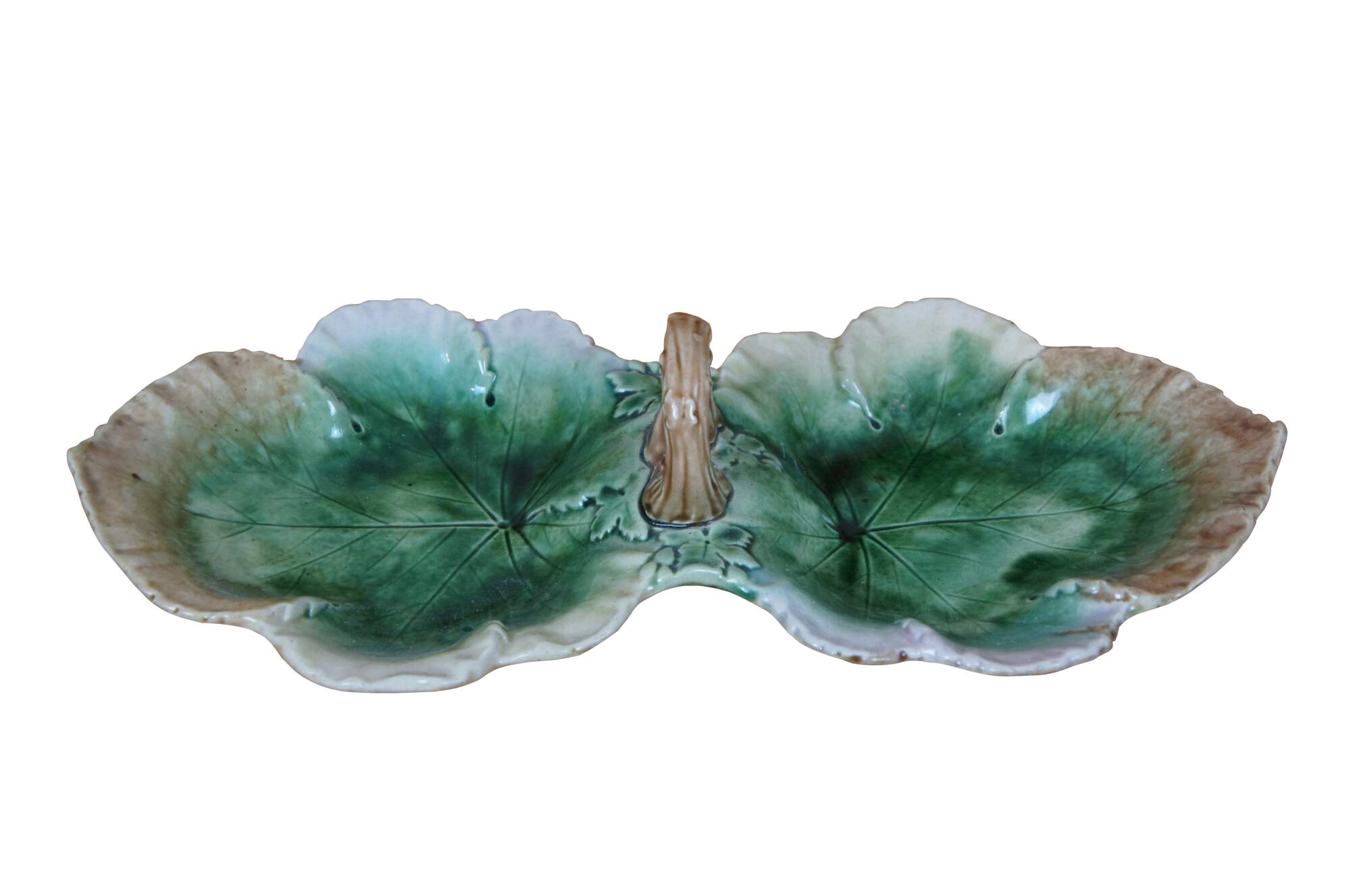 Antique Majolica footed double leaf plates / strawberry platter / serving dish / bowl / basket / compote featuring two green leaves with a twig / branch handle.