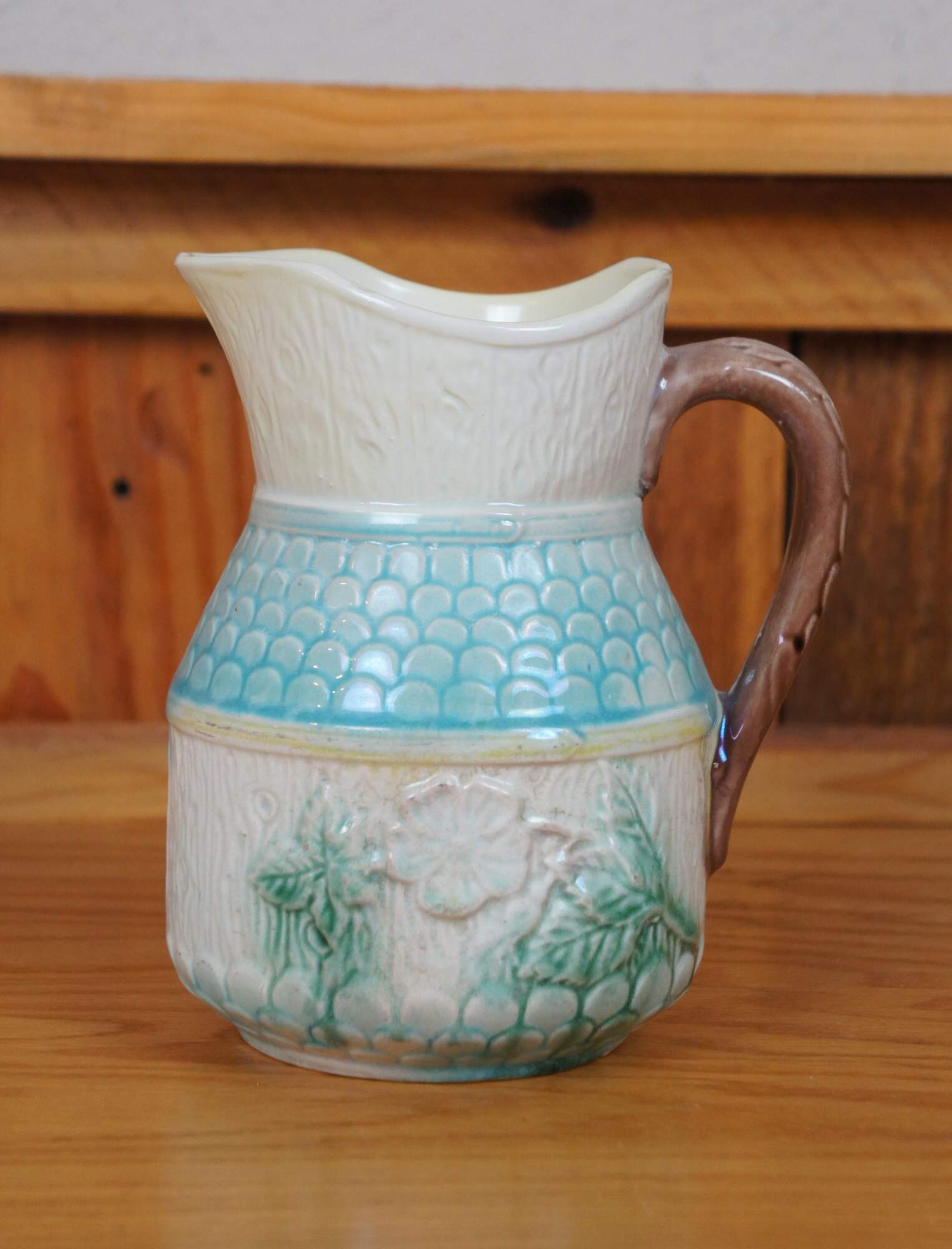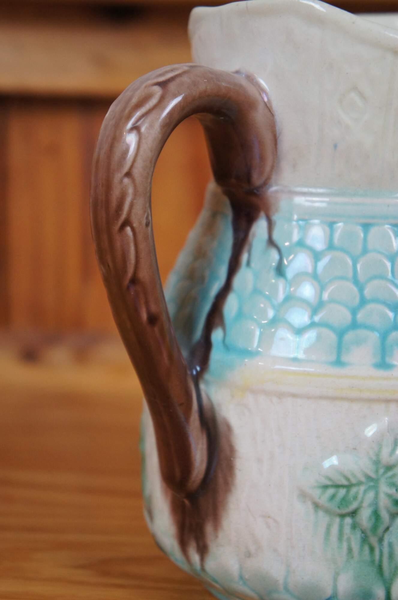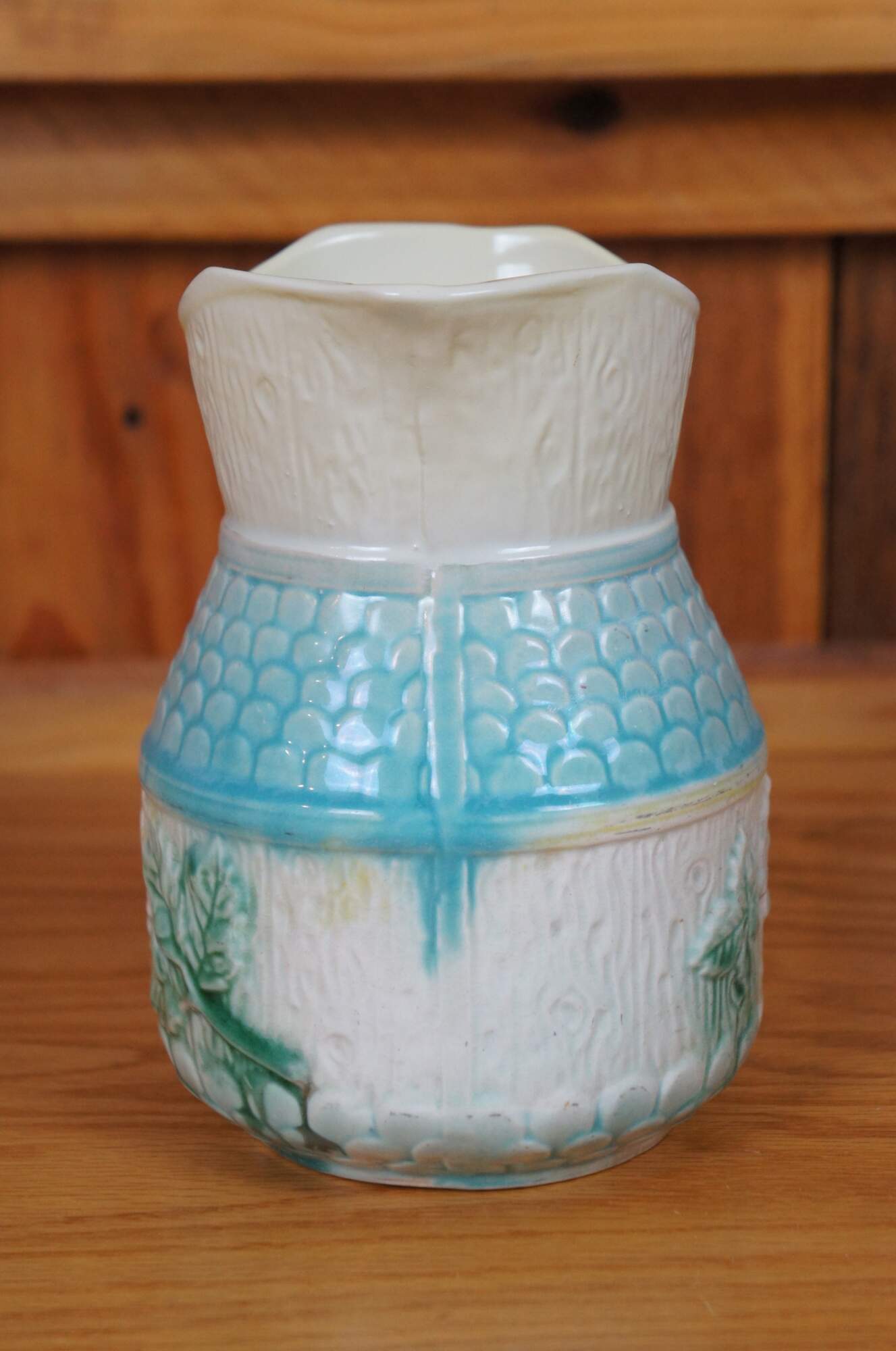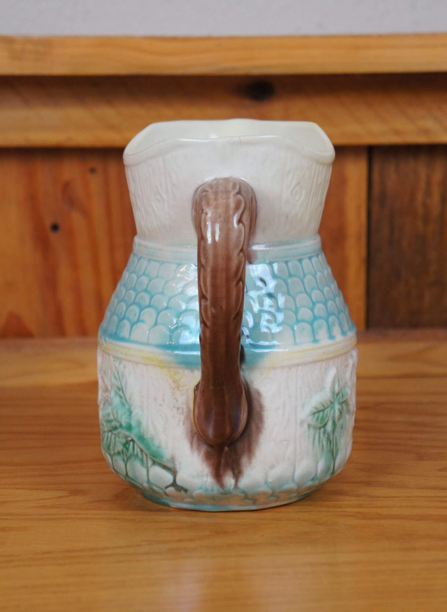 Antique Majolica creamer pitcher / jug featuring a farmhouse motif with wood grain design, shingles, wild roses and acanthus handle.