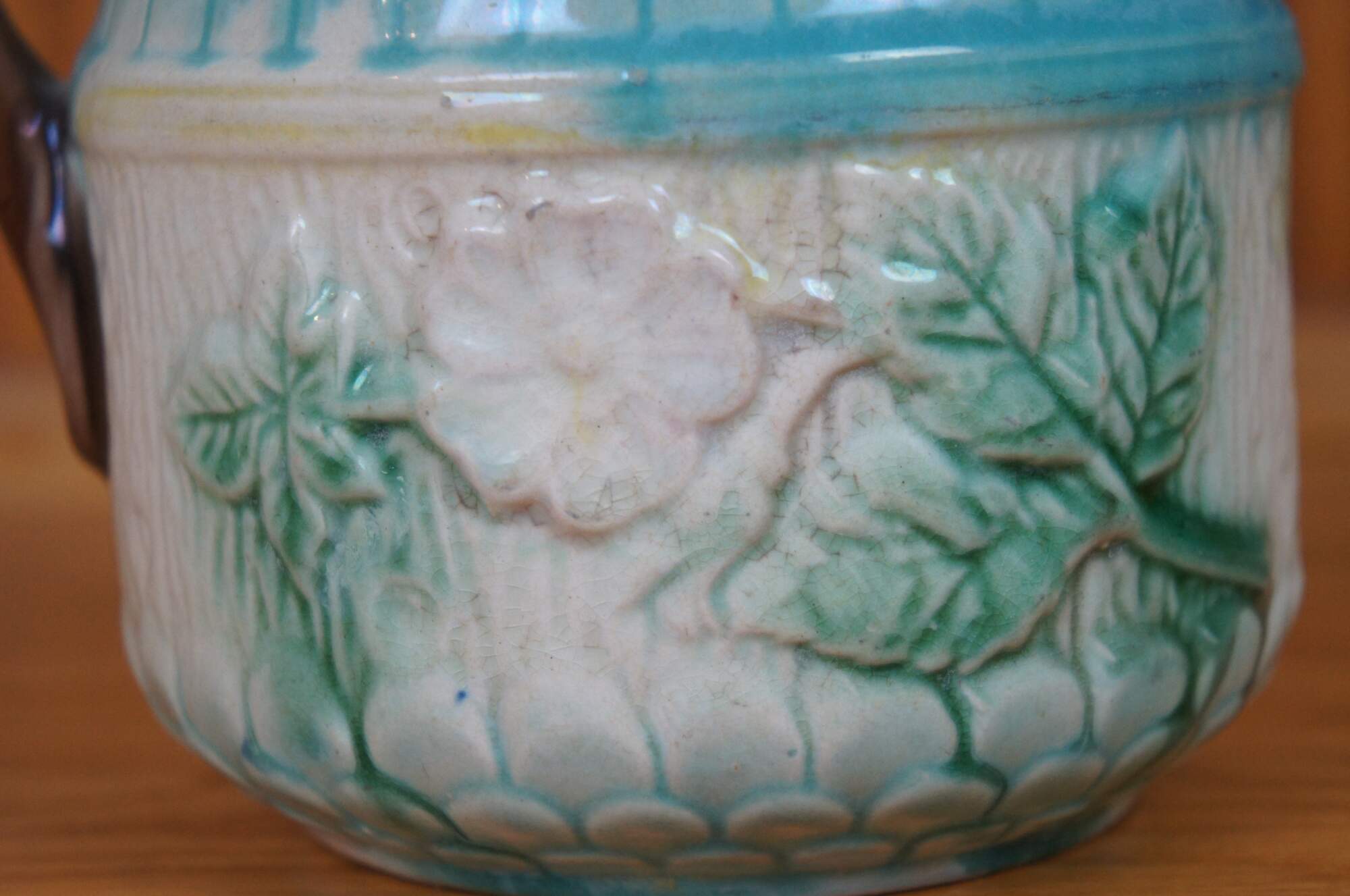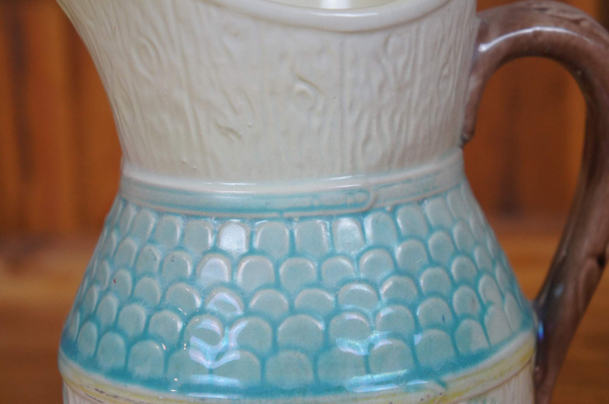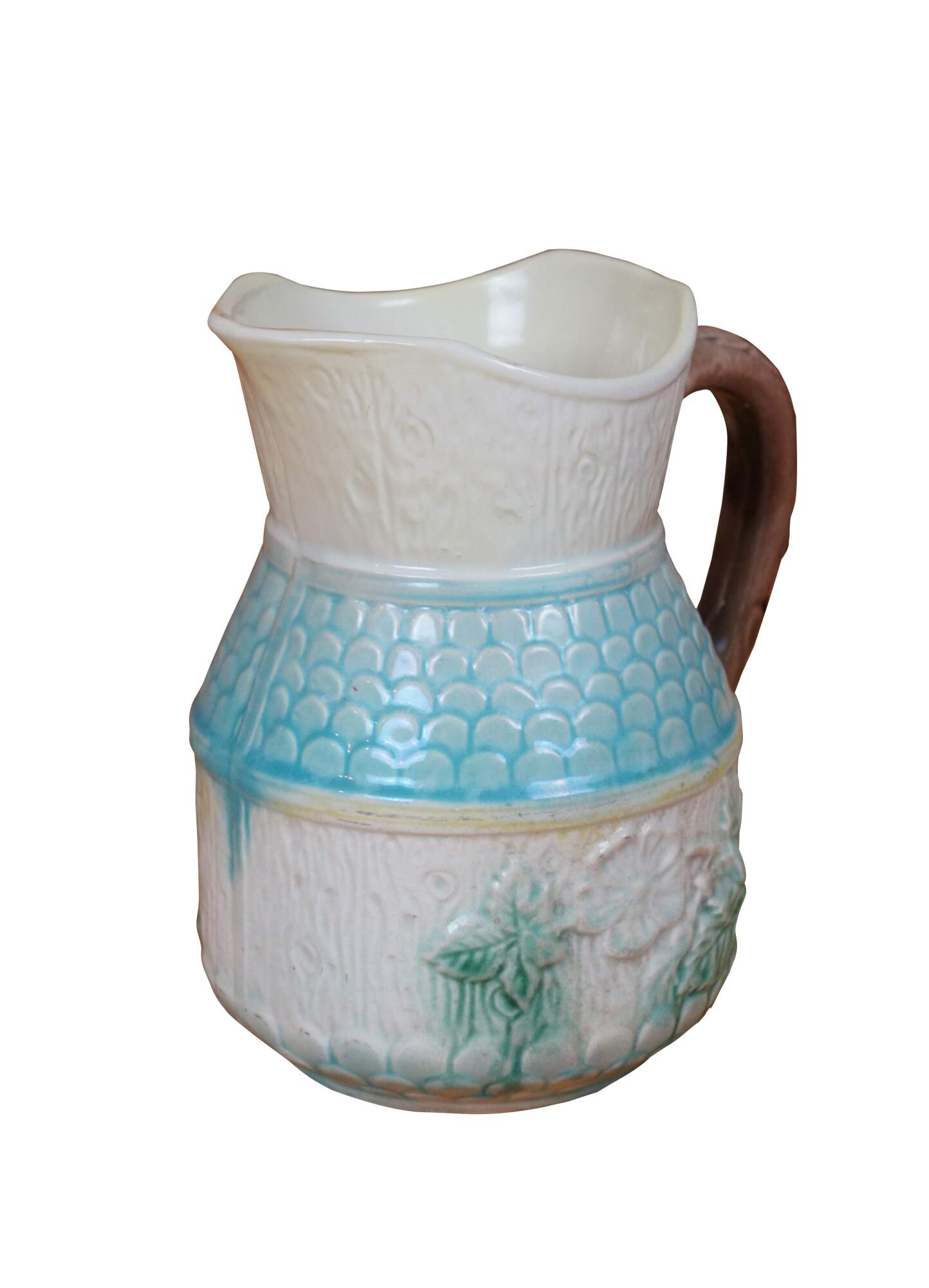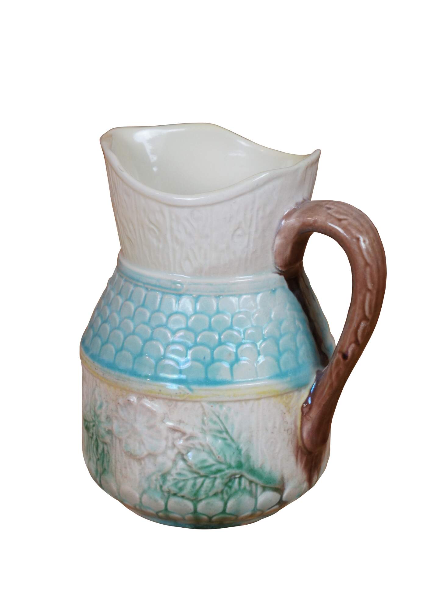Antique Majolica creamer pitcher / jug featuring a farmhouse motif with wood grain design, shingles, wild roses and acanthus handle.