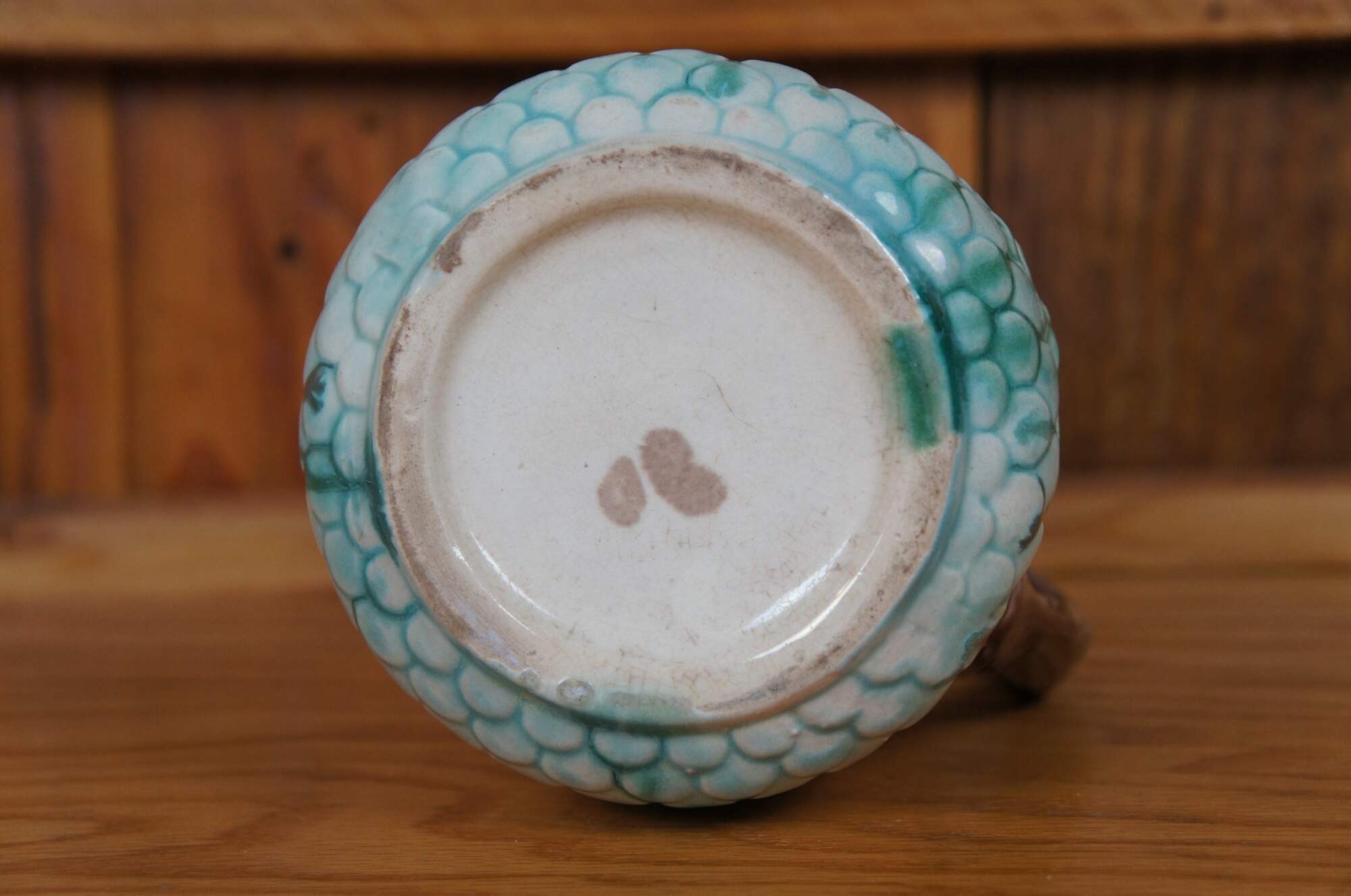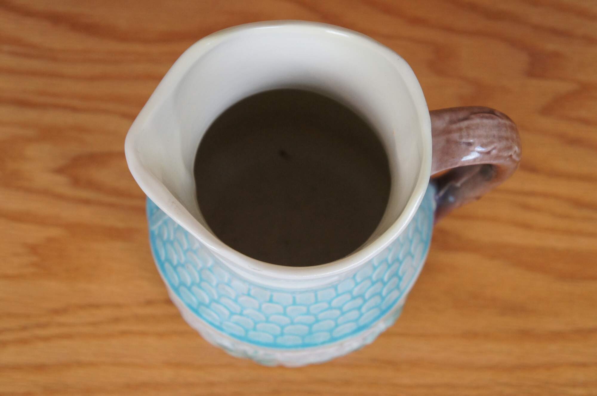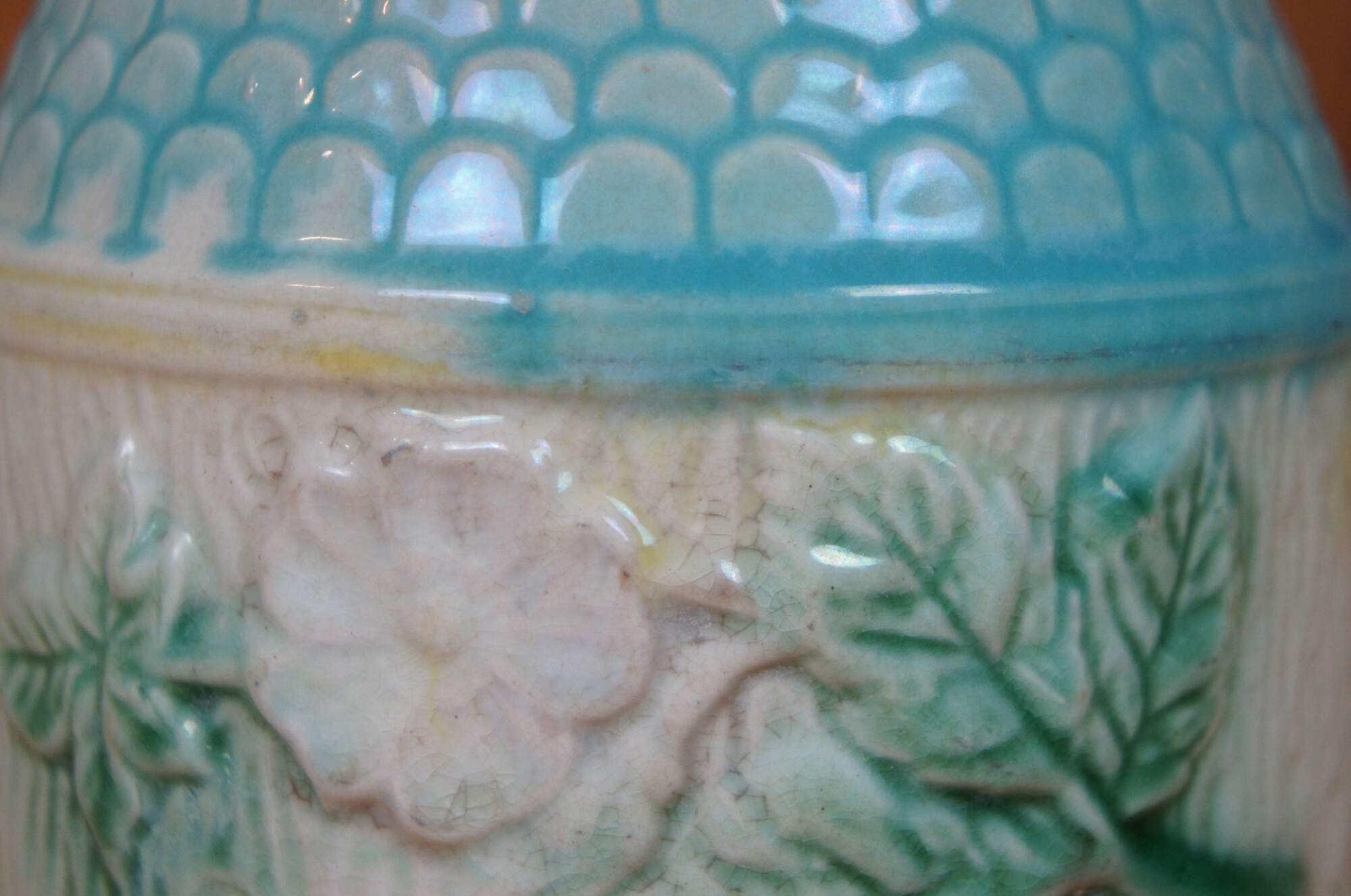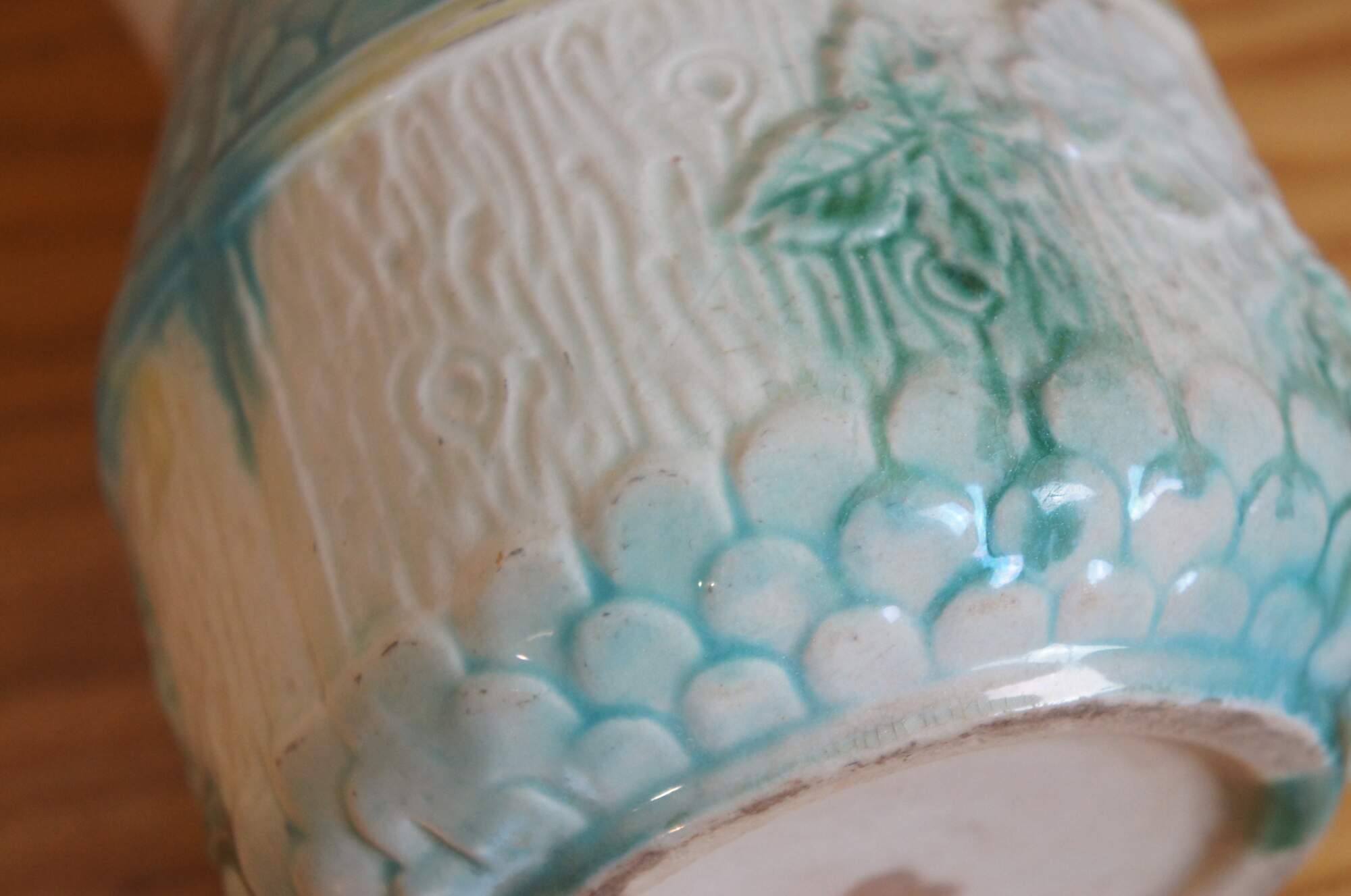 Antique Majolica creamer pitcher / jug featuring a farmhouse motif with wood grain design, shingles, wild roses and acanthus handle.