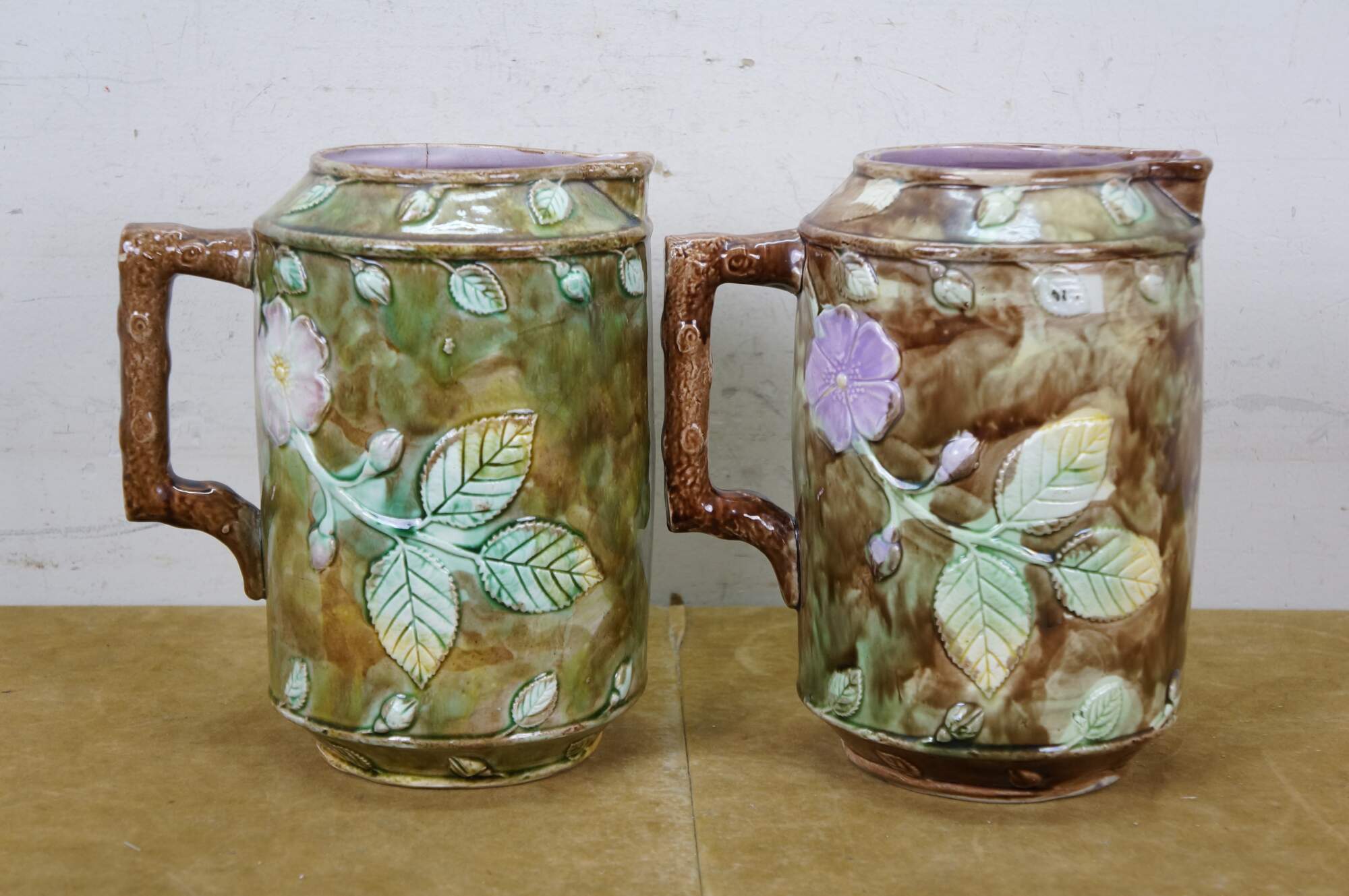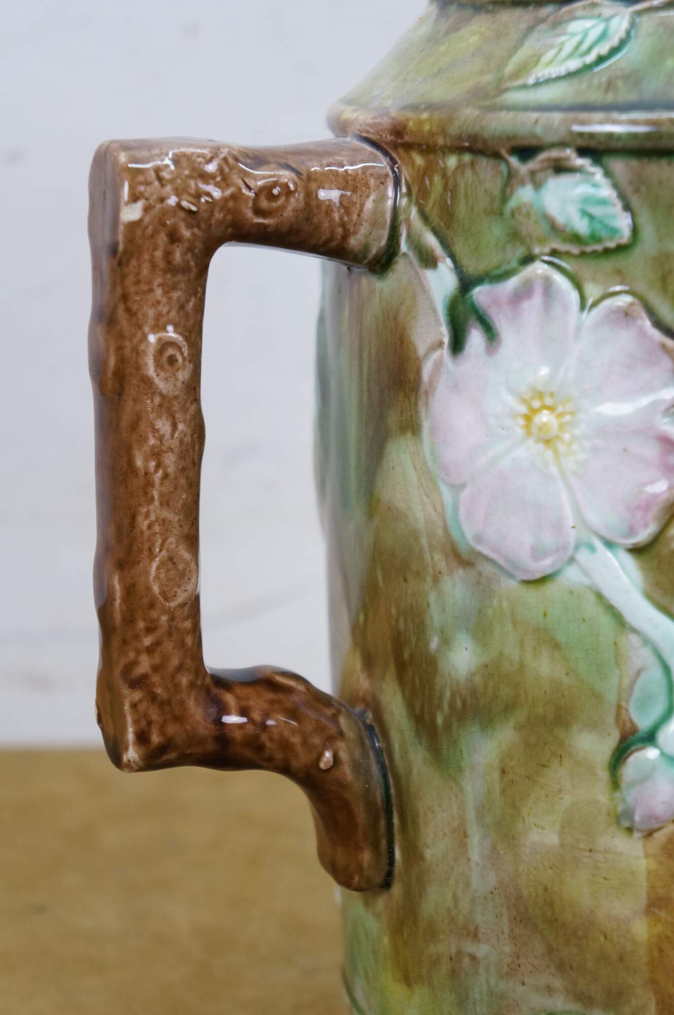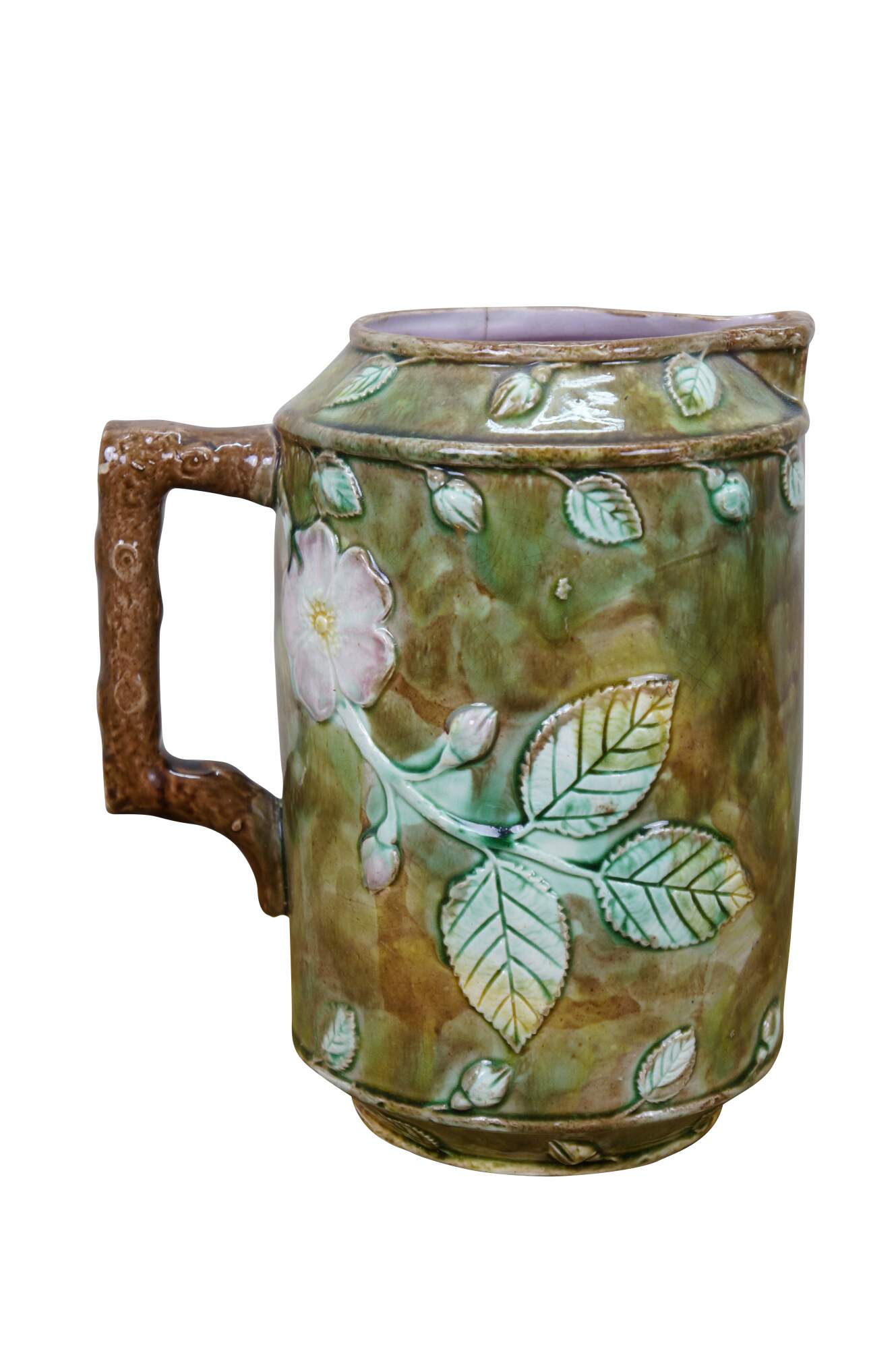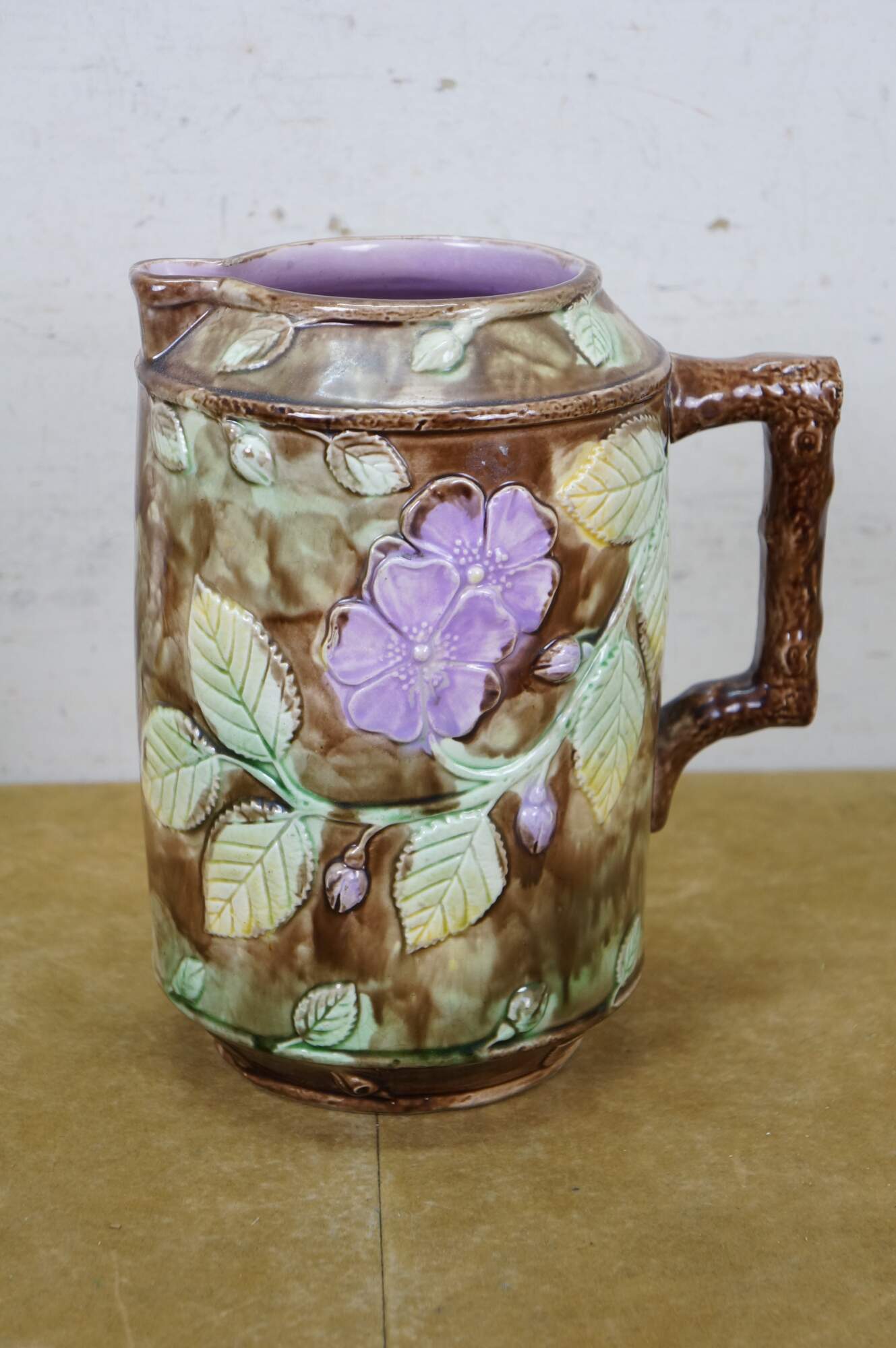 Very large antique Majolica French Barbotine pitcher / jug / carafe featuring a green and brown field with wild dog rose flower blossoms and a twig / branch handle, and purple lavender interior.