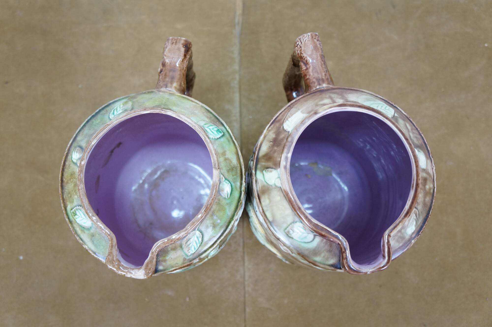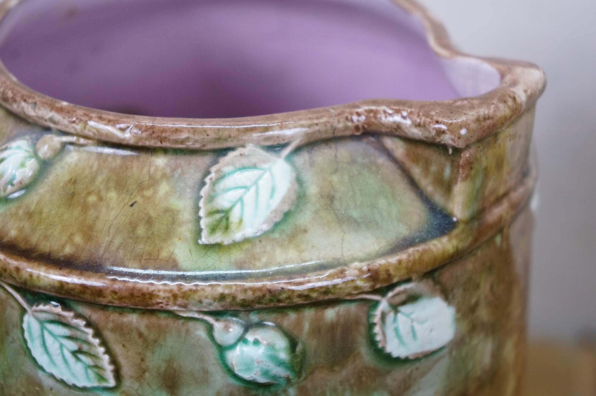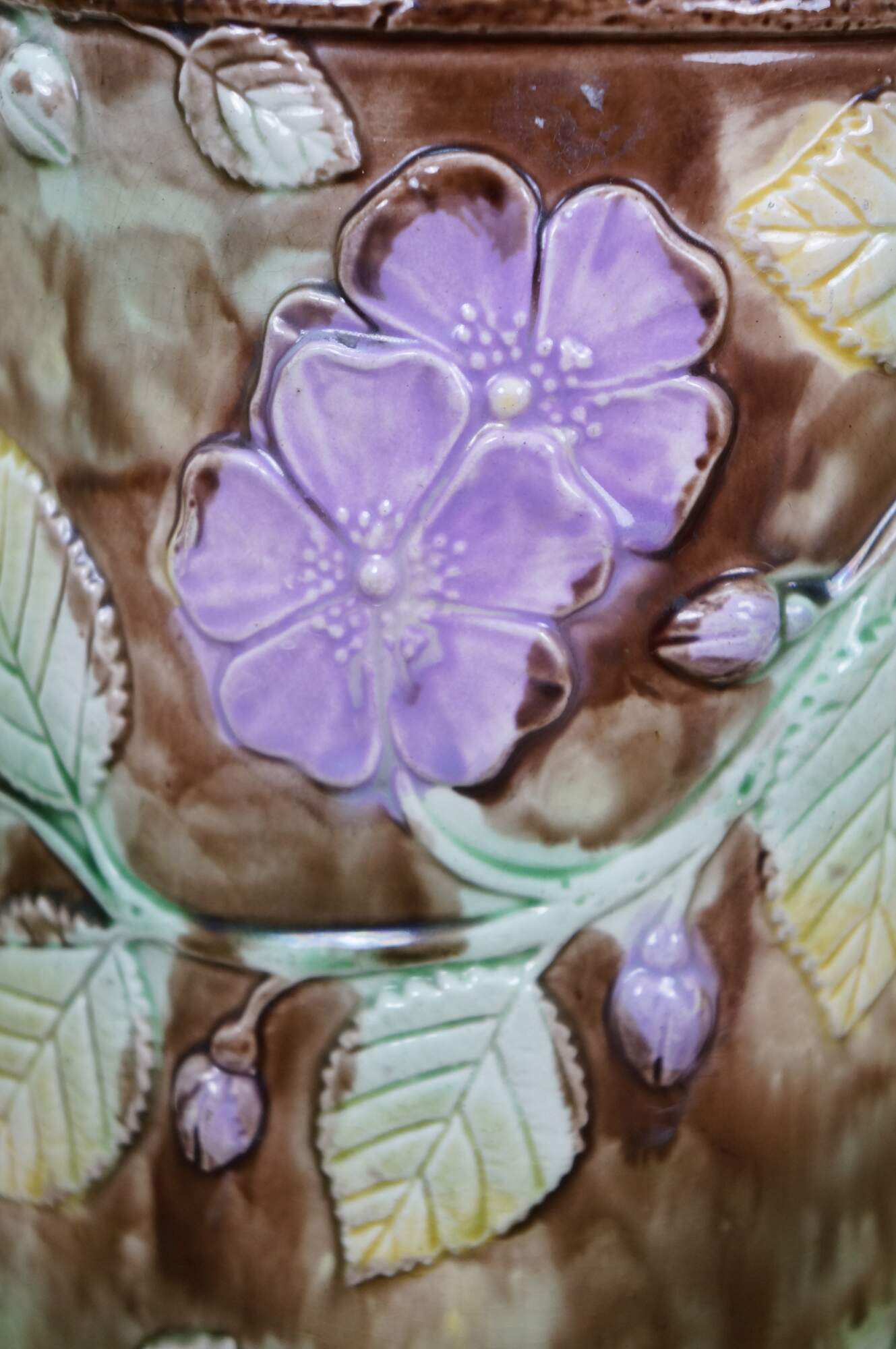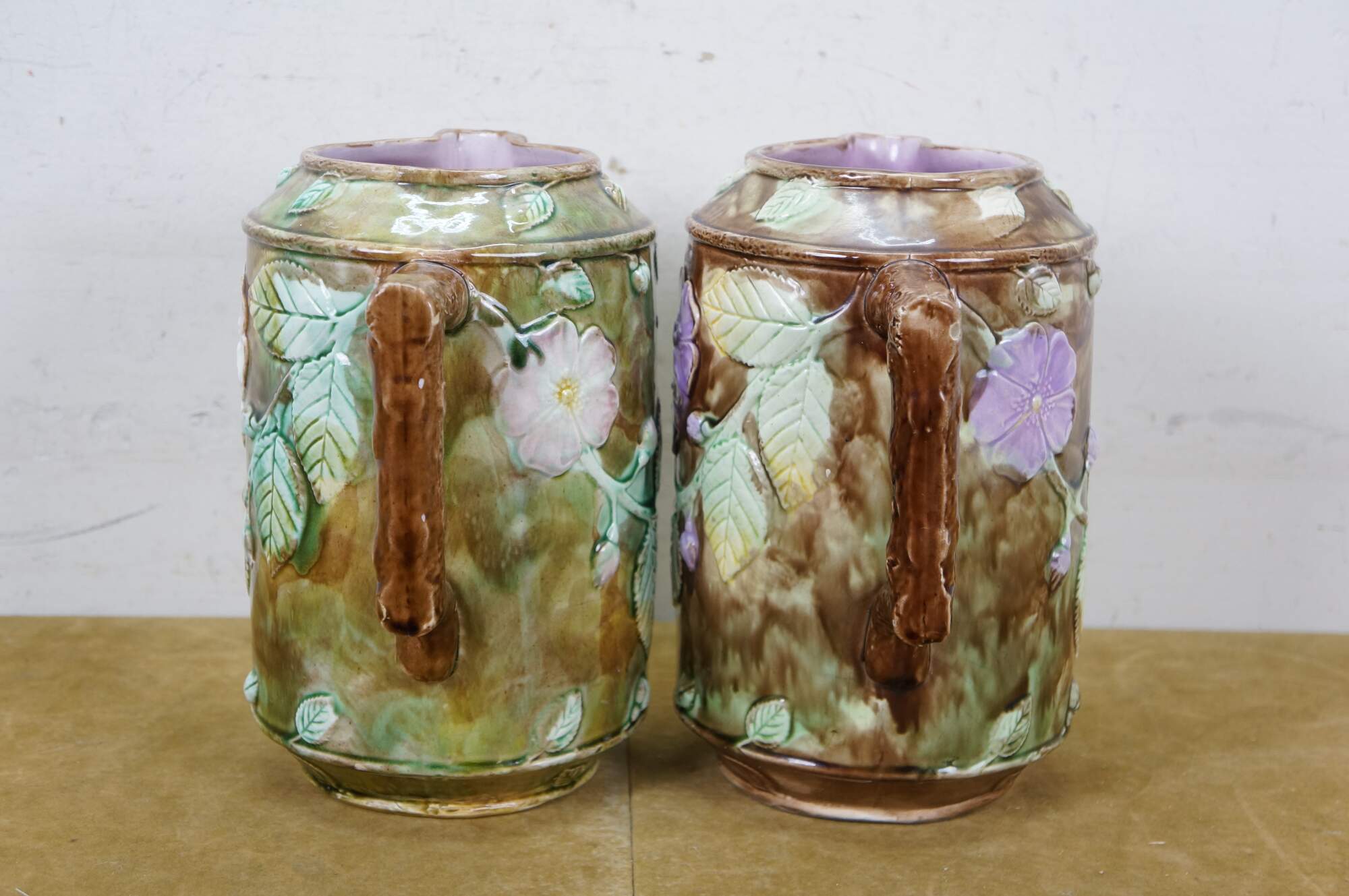 Very large antique Majolica French Barbotine pitcher / jug / carafe featuring a green and brown field with wild dog rose flower blossoms and a twig / branch handle, and purple lavender interior.