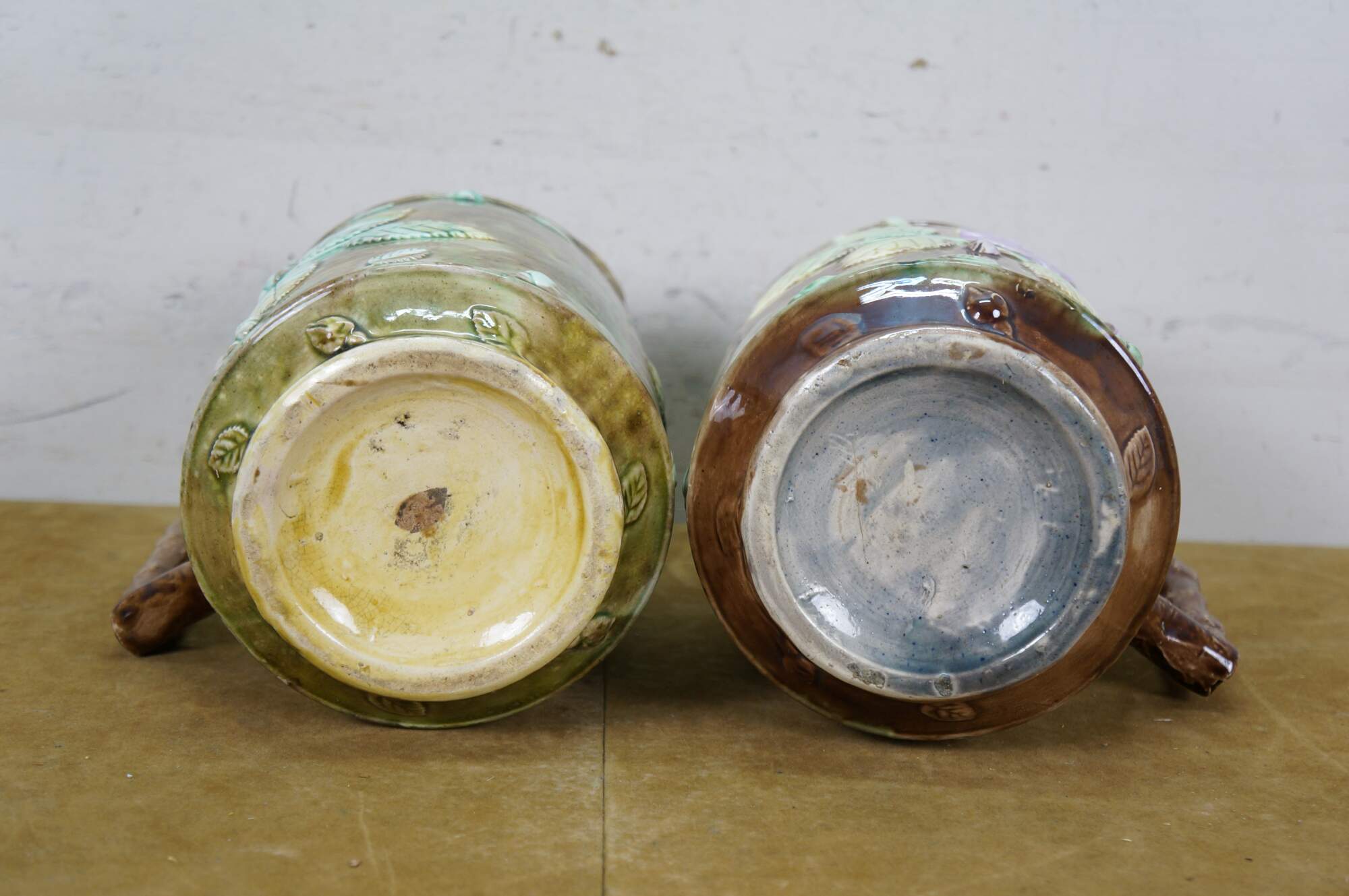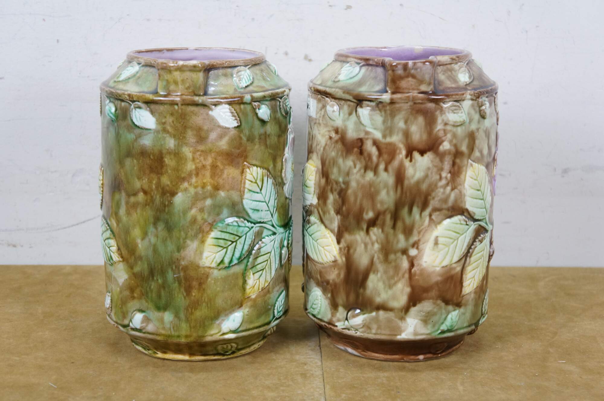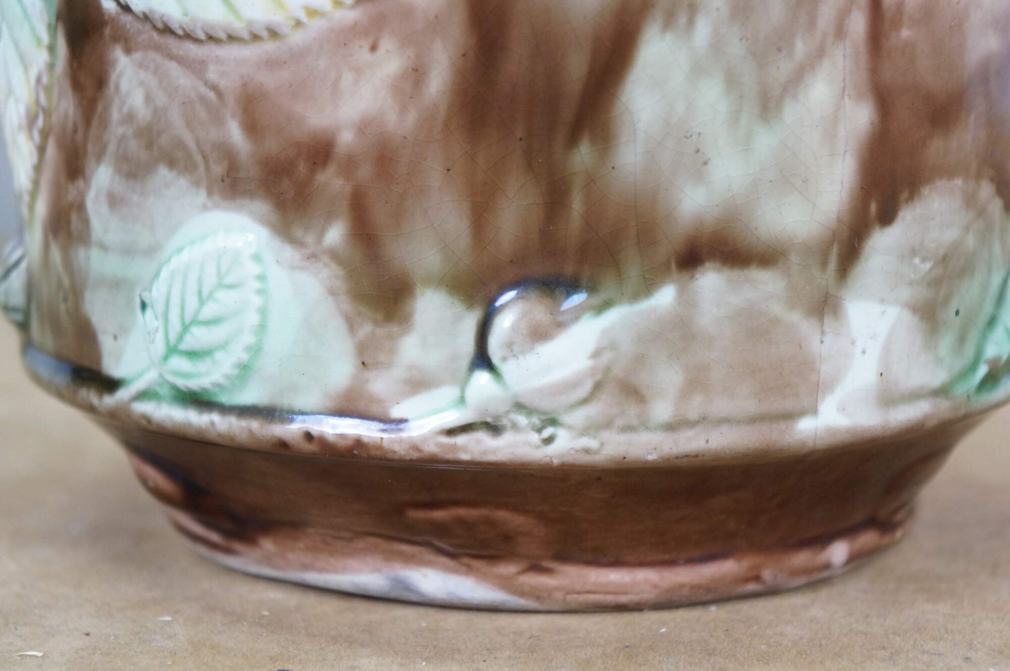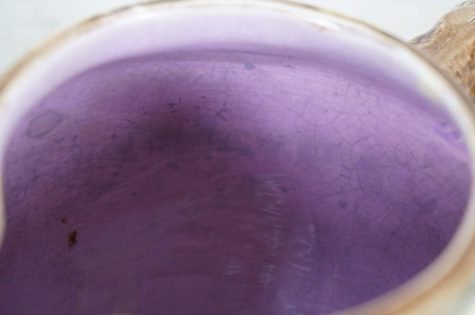Very large antique Majolica French Barbotine pitcher / jug / carafe featuring a green and brown field with wild dog rose flower blossoms and a twig / branch handle, and purple lavender interior.