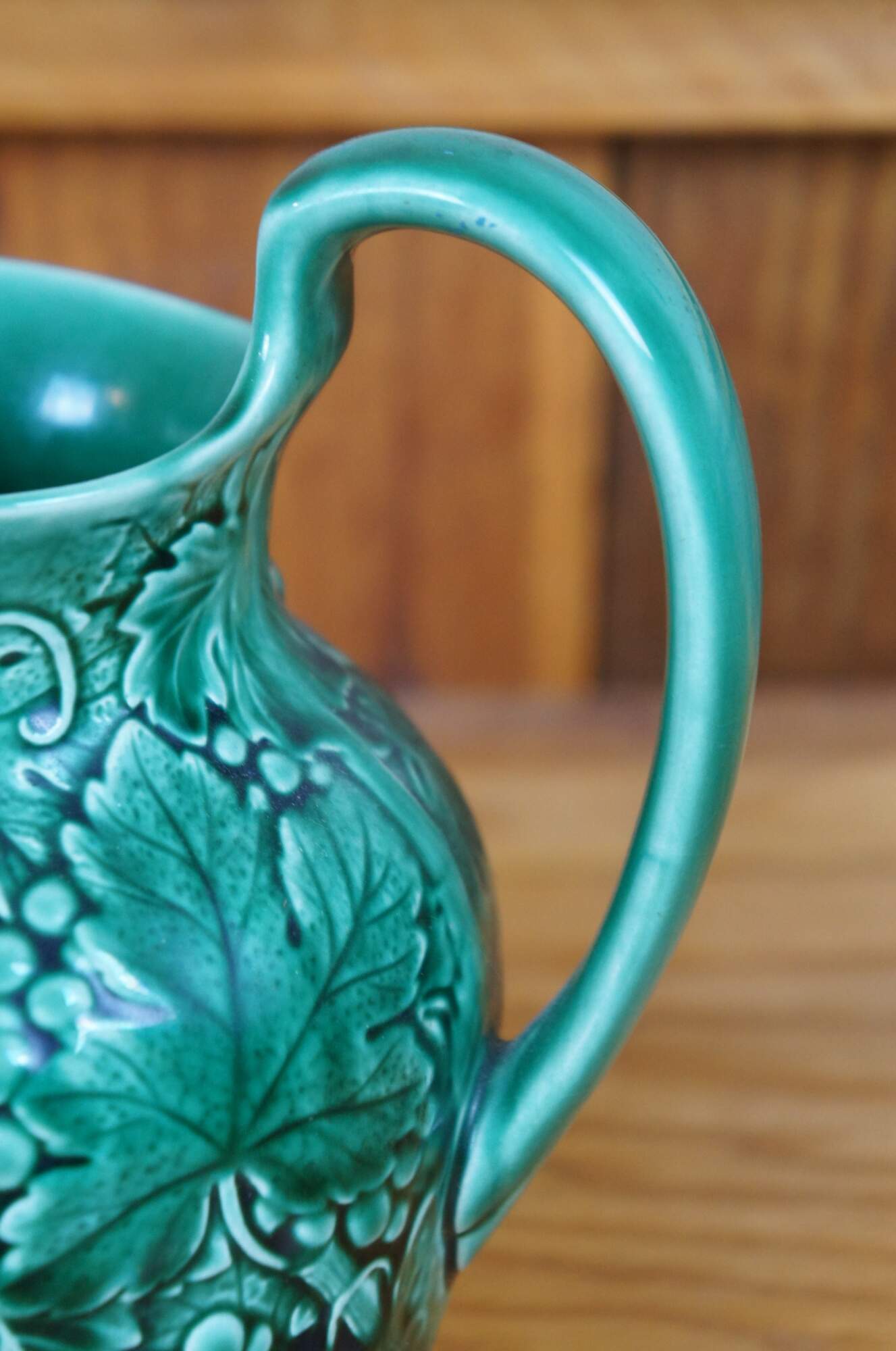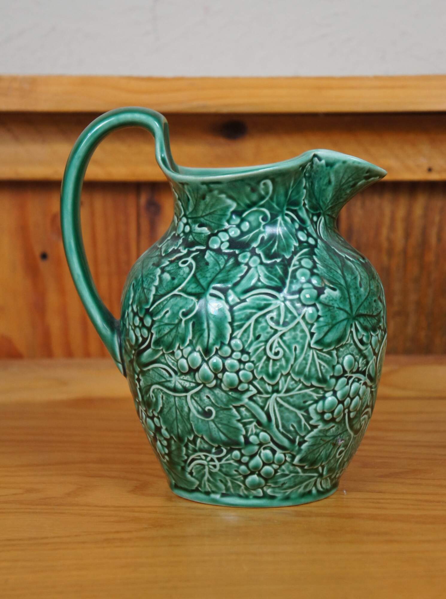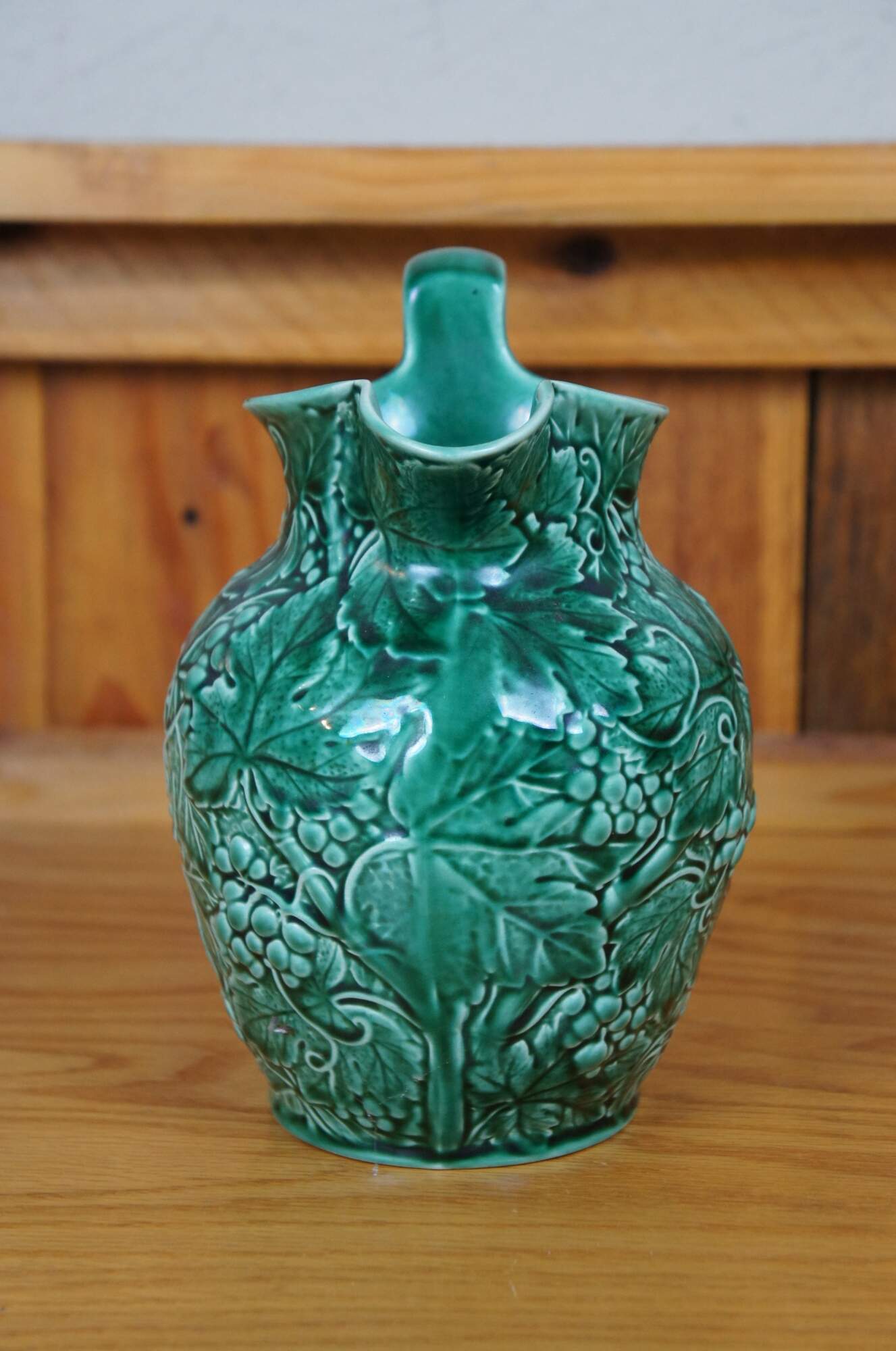 Mid century Wedgwood Etruria & Barlaston Majolica grape leaf / grape vine water pitcher / jug / carafe. Made in England, circa 1950s.