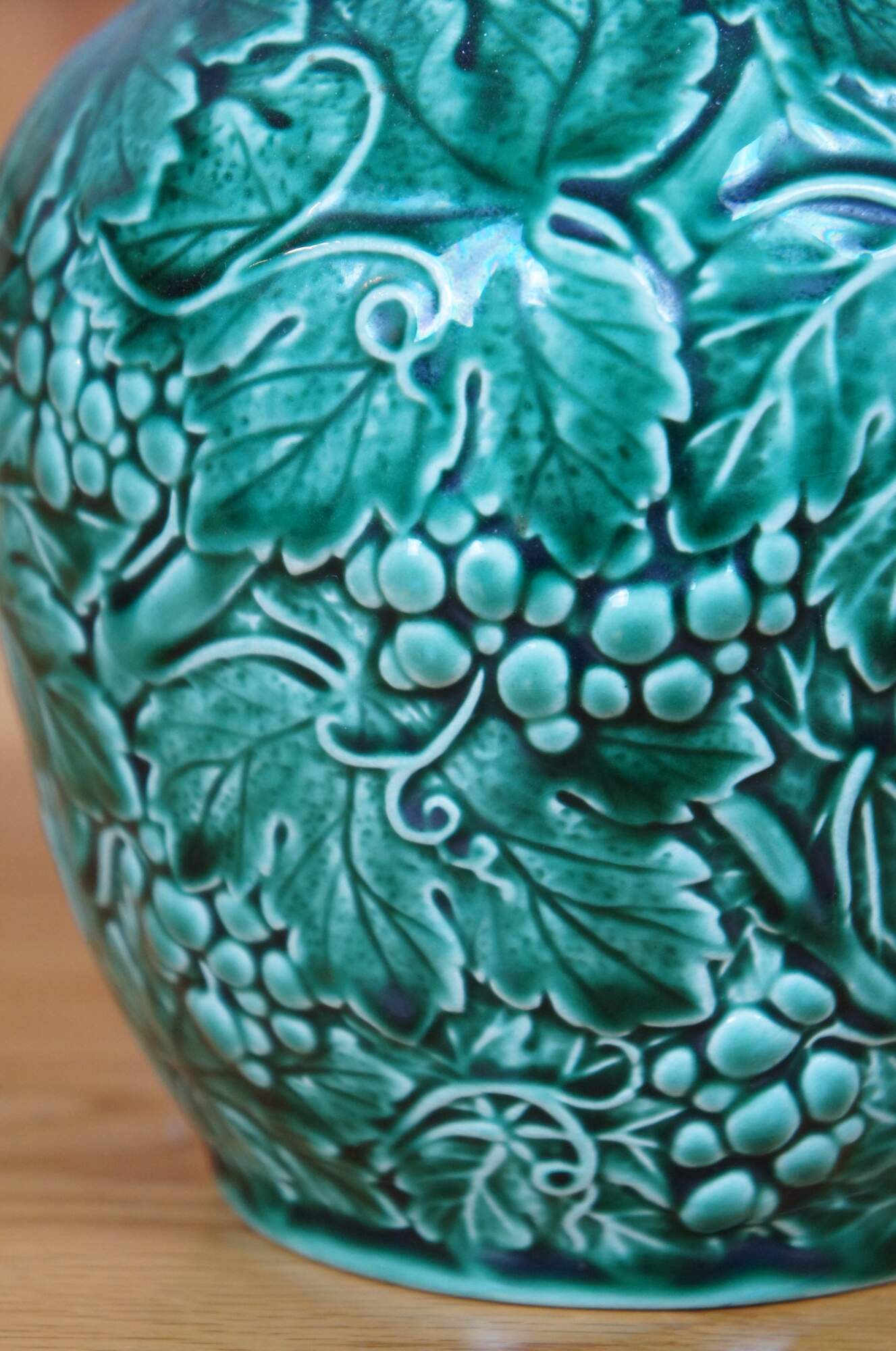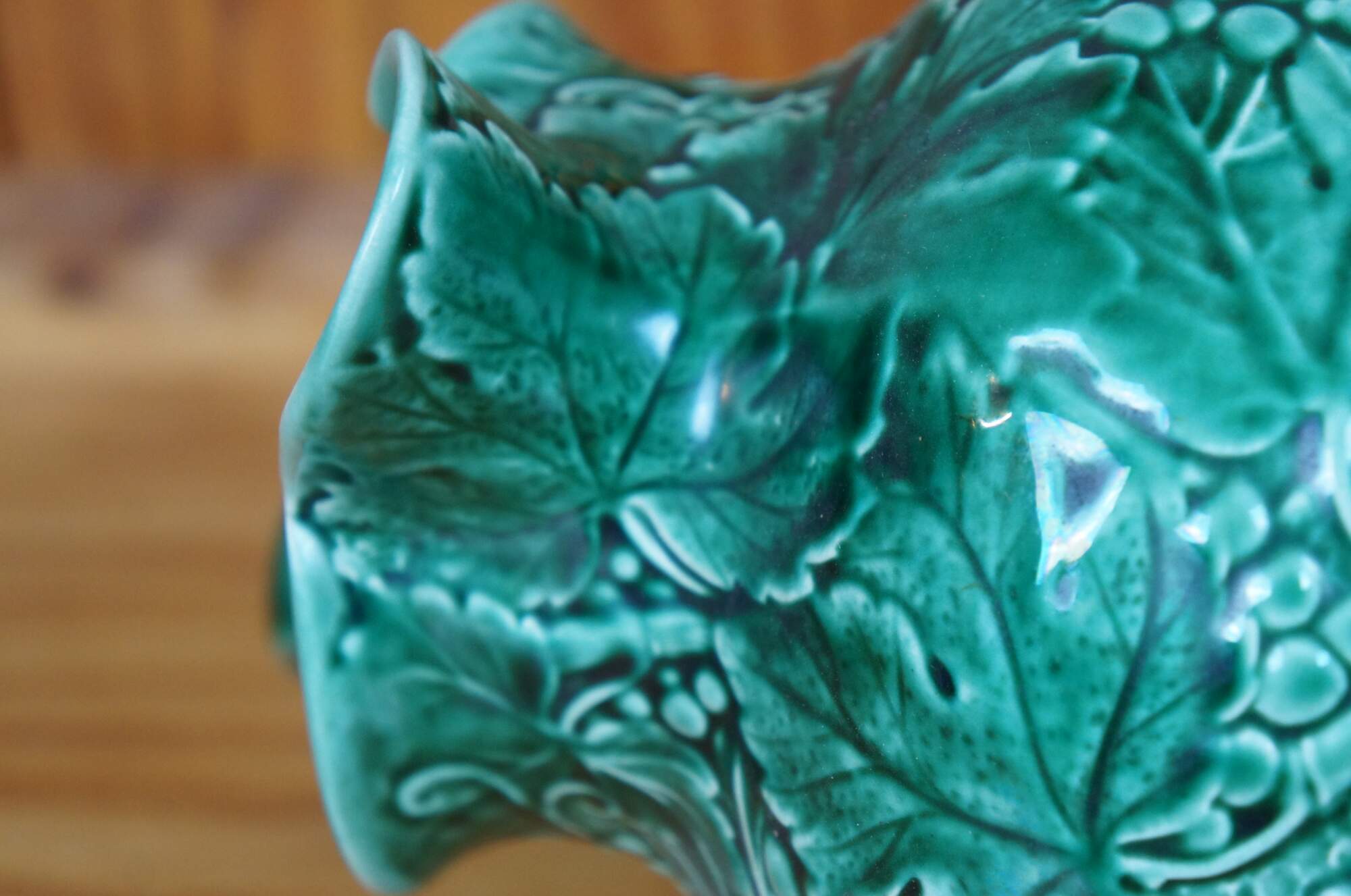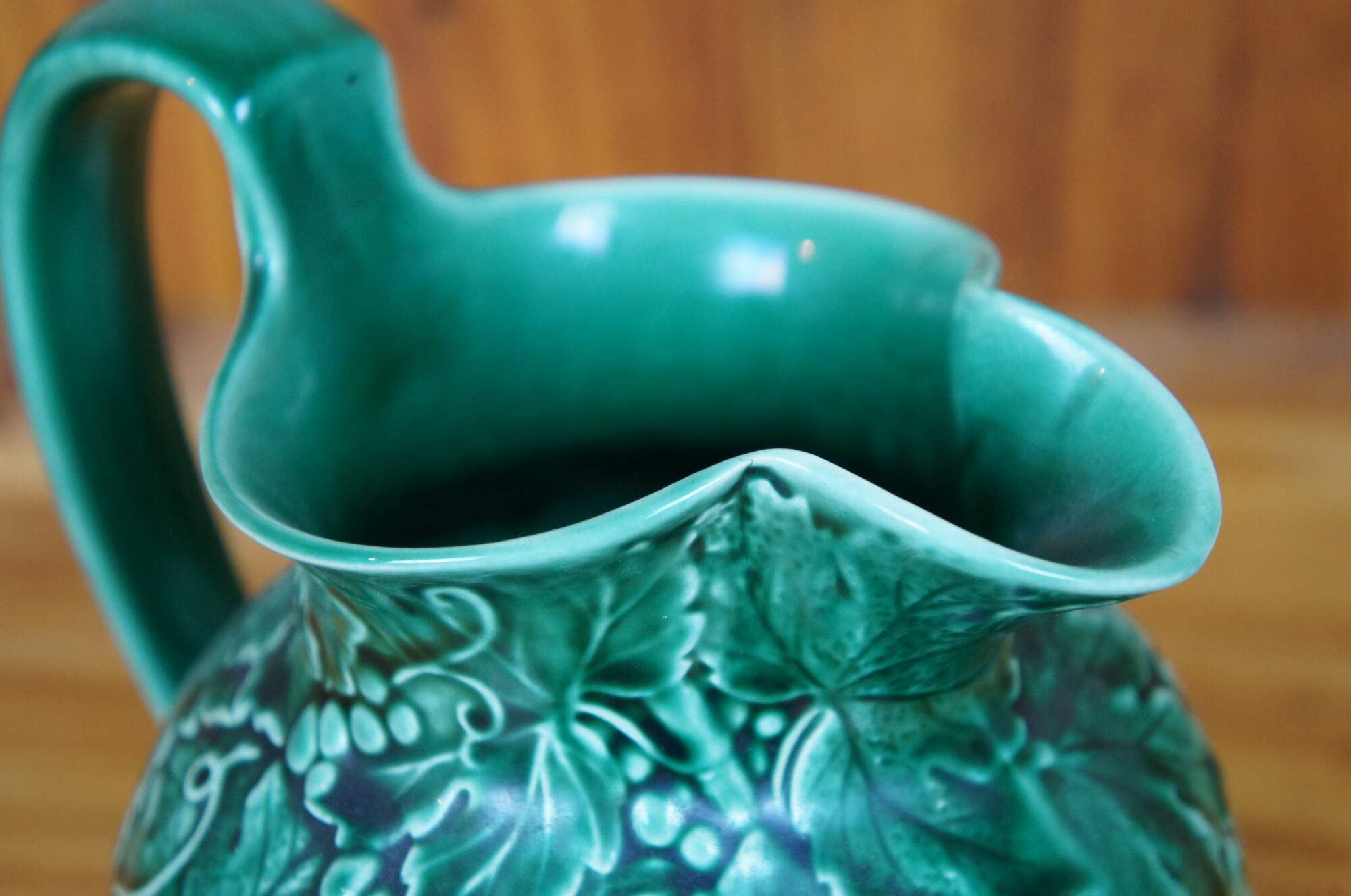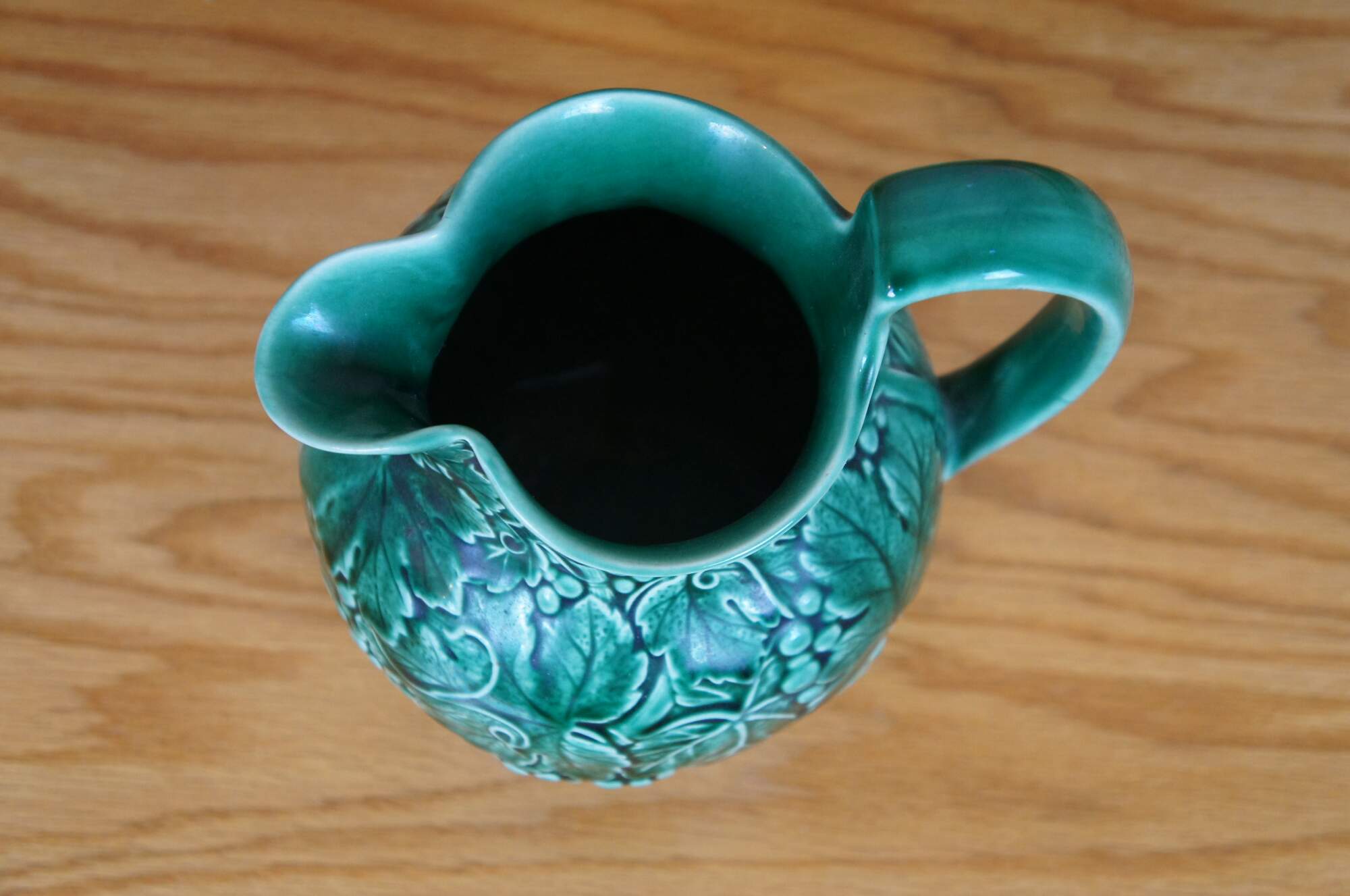 Mid century Wedgwood Etruria & Barlaston Majolica grape leaf / grape vine water pitcher / jug / carafe. Made in England, circa 1950s.