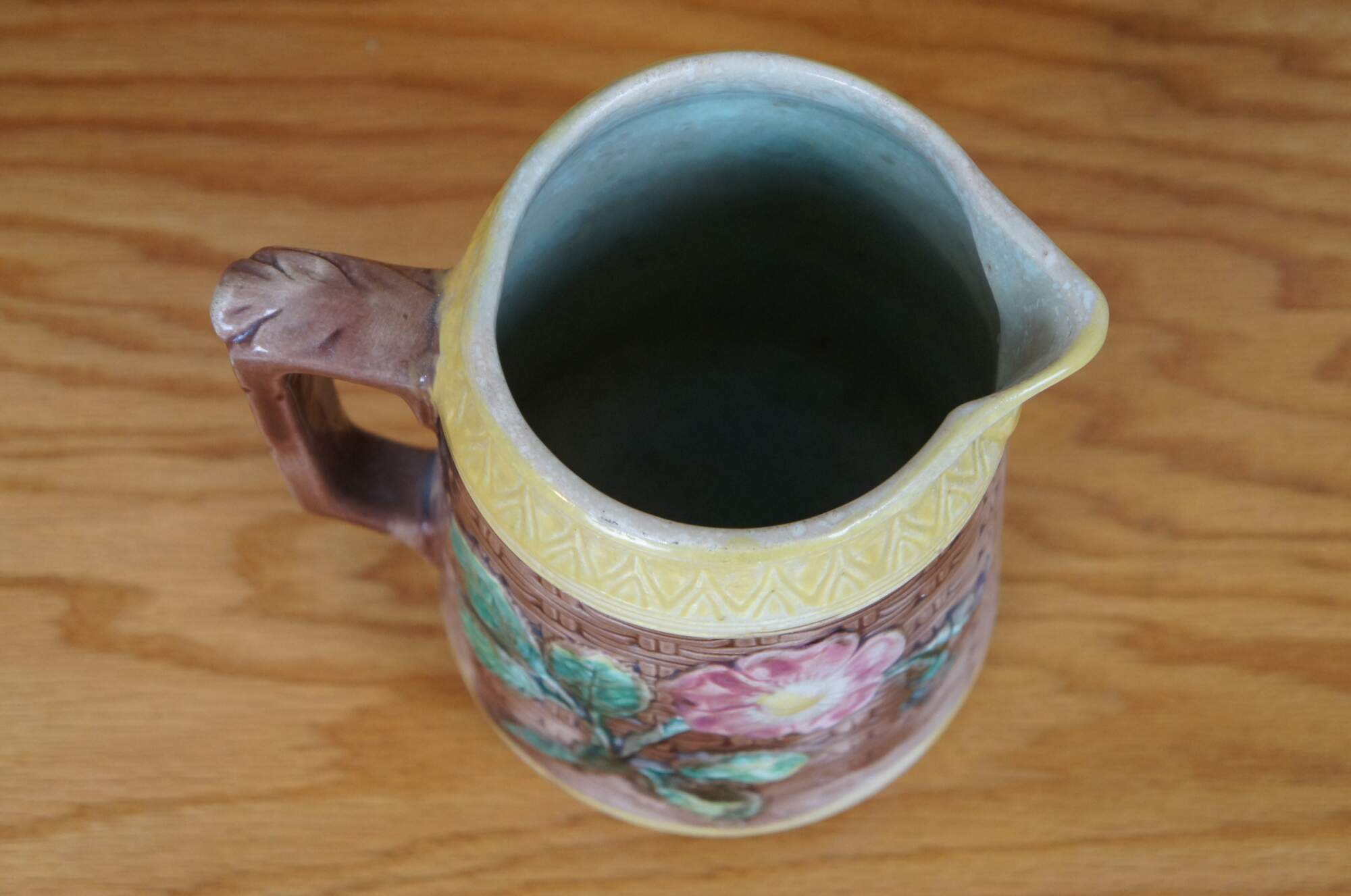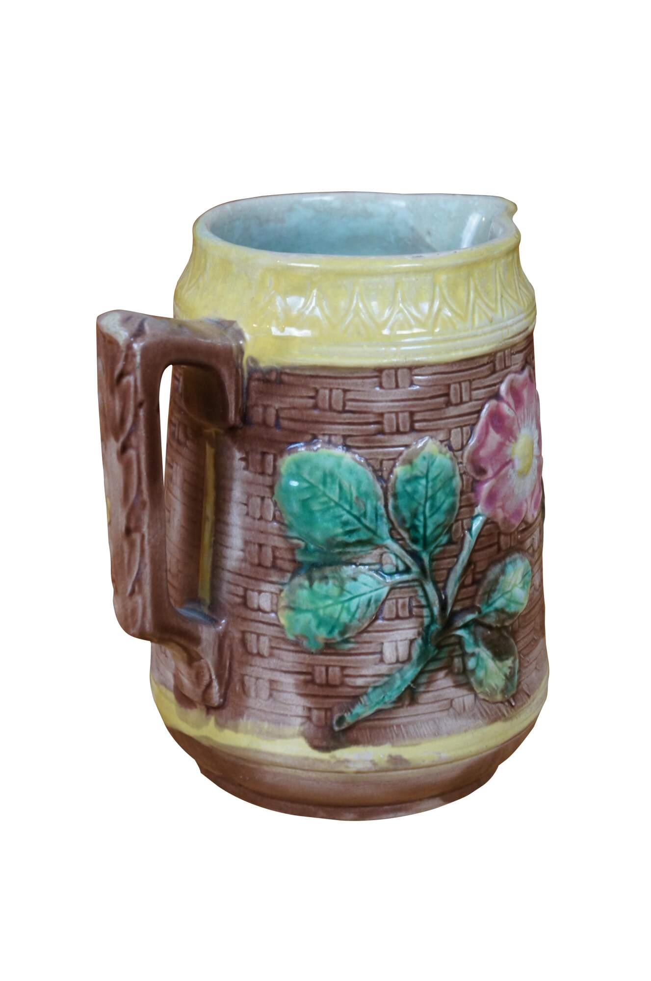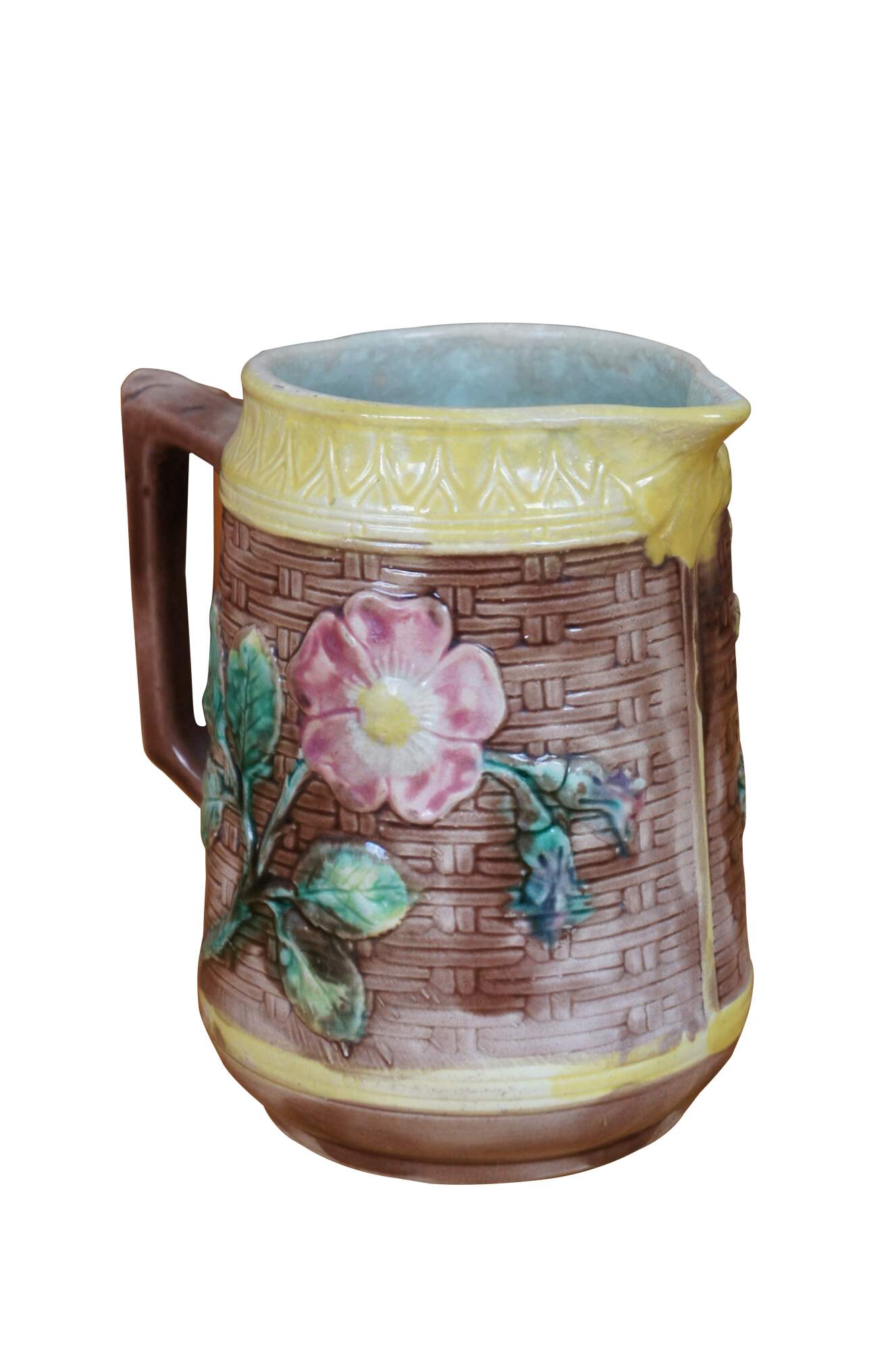 Antique Majolica creamer pitcher / jug featuring a farmhouse motif with wood grain basket weave design, sunflowers, wild dogwood flowers, and acanthus handle.