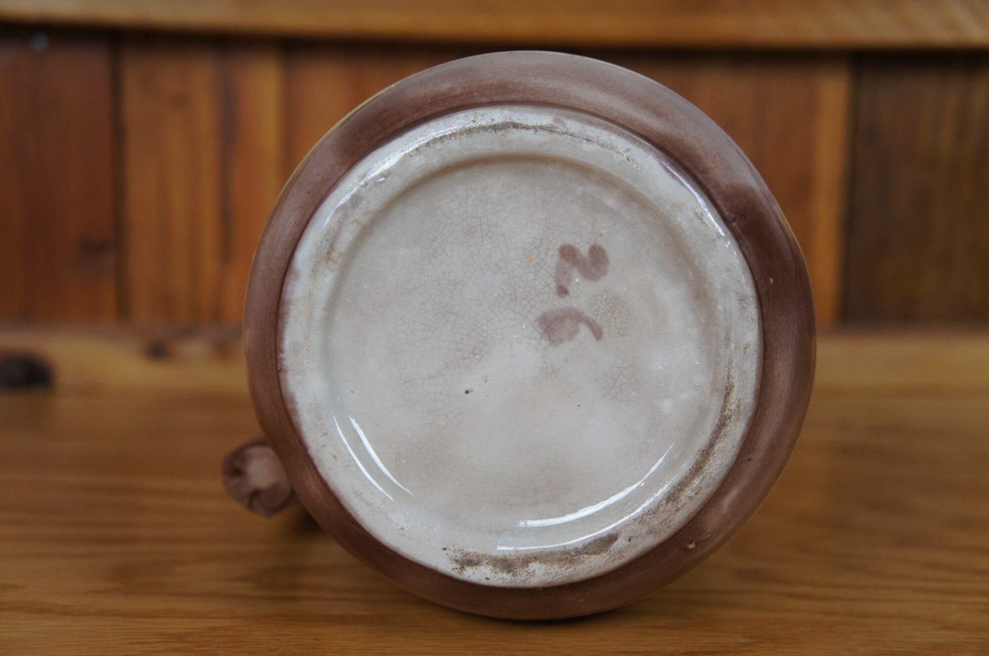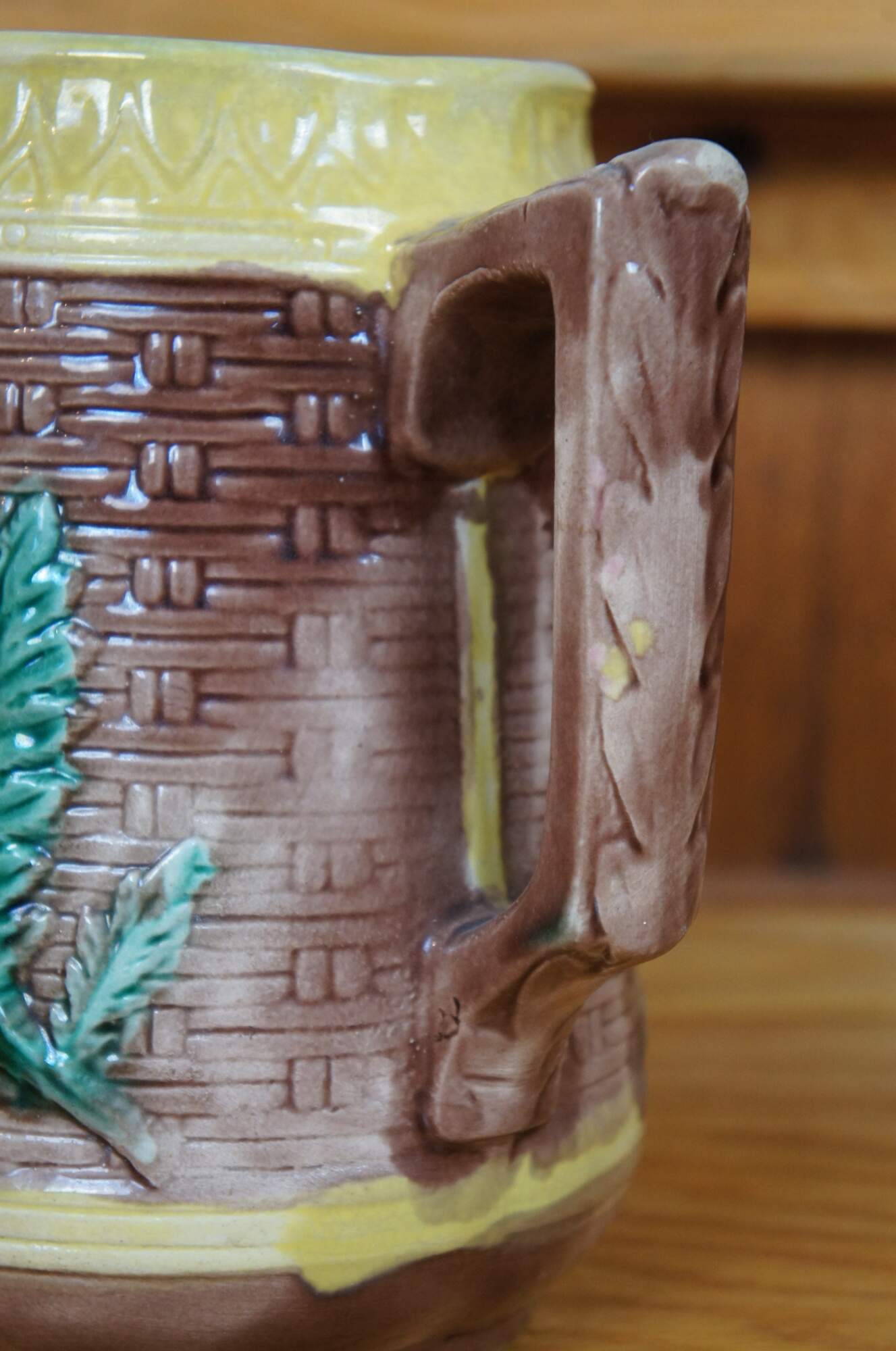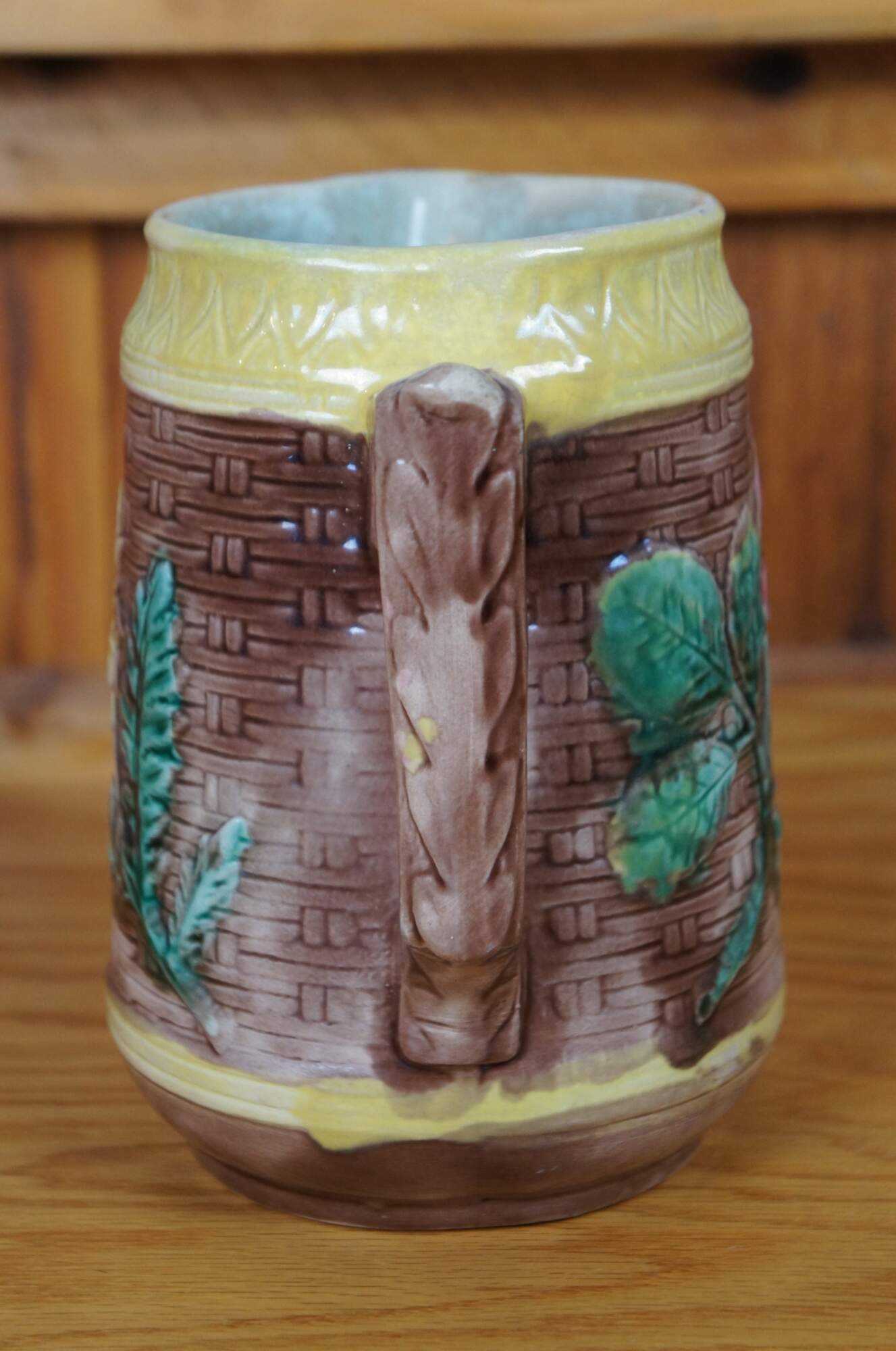 Antique Majolica creamer pitcher / jug featuring a farmhouse motif with wood grain basket weave design, sunflowers, wild dogwood flowers, and acanthus handle.