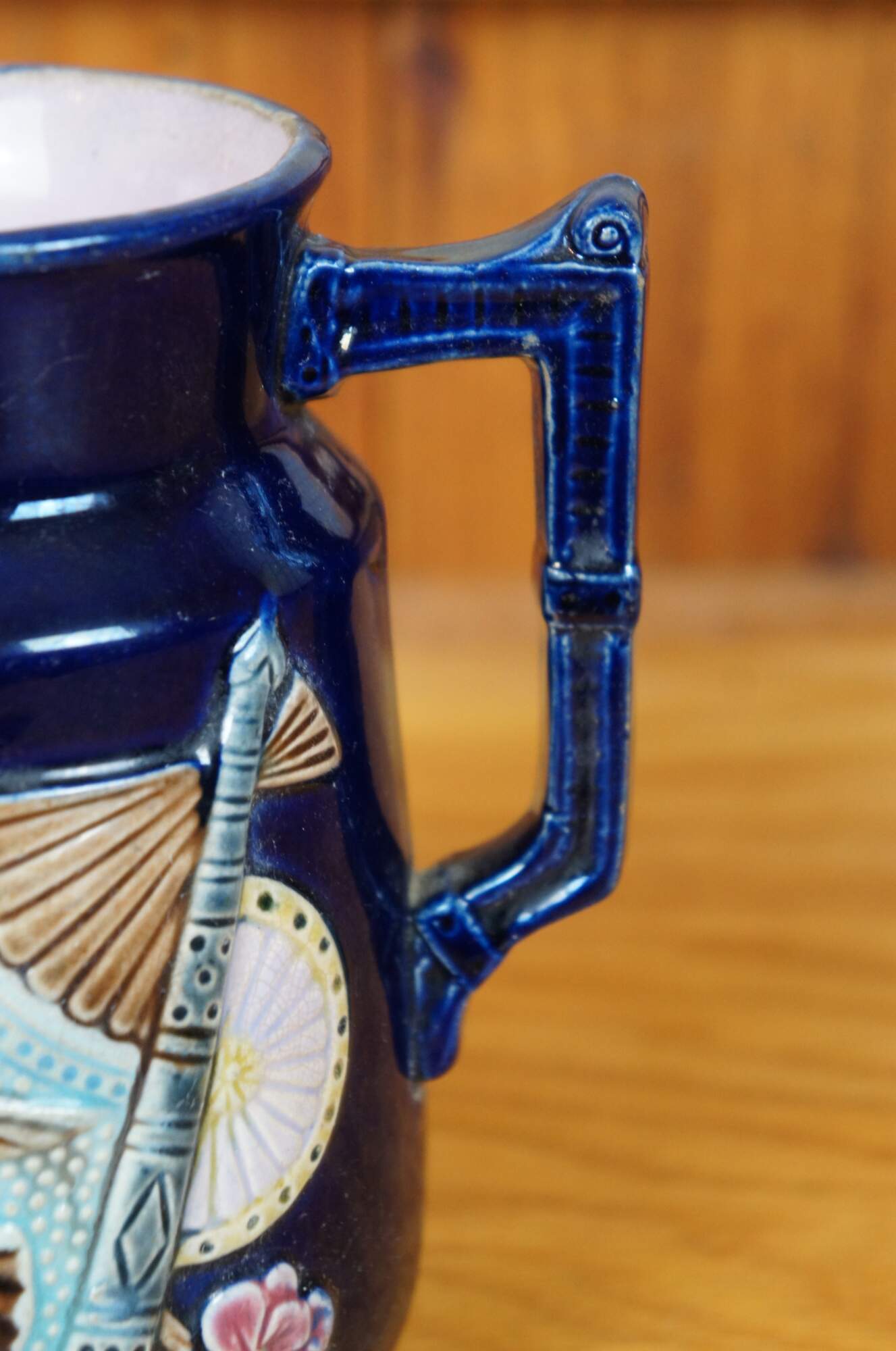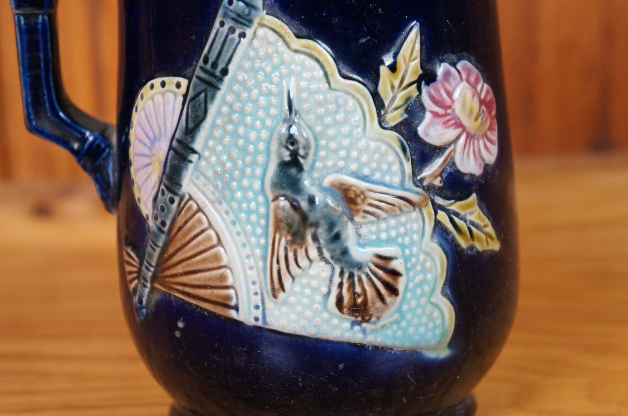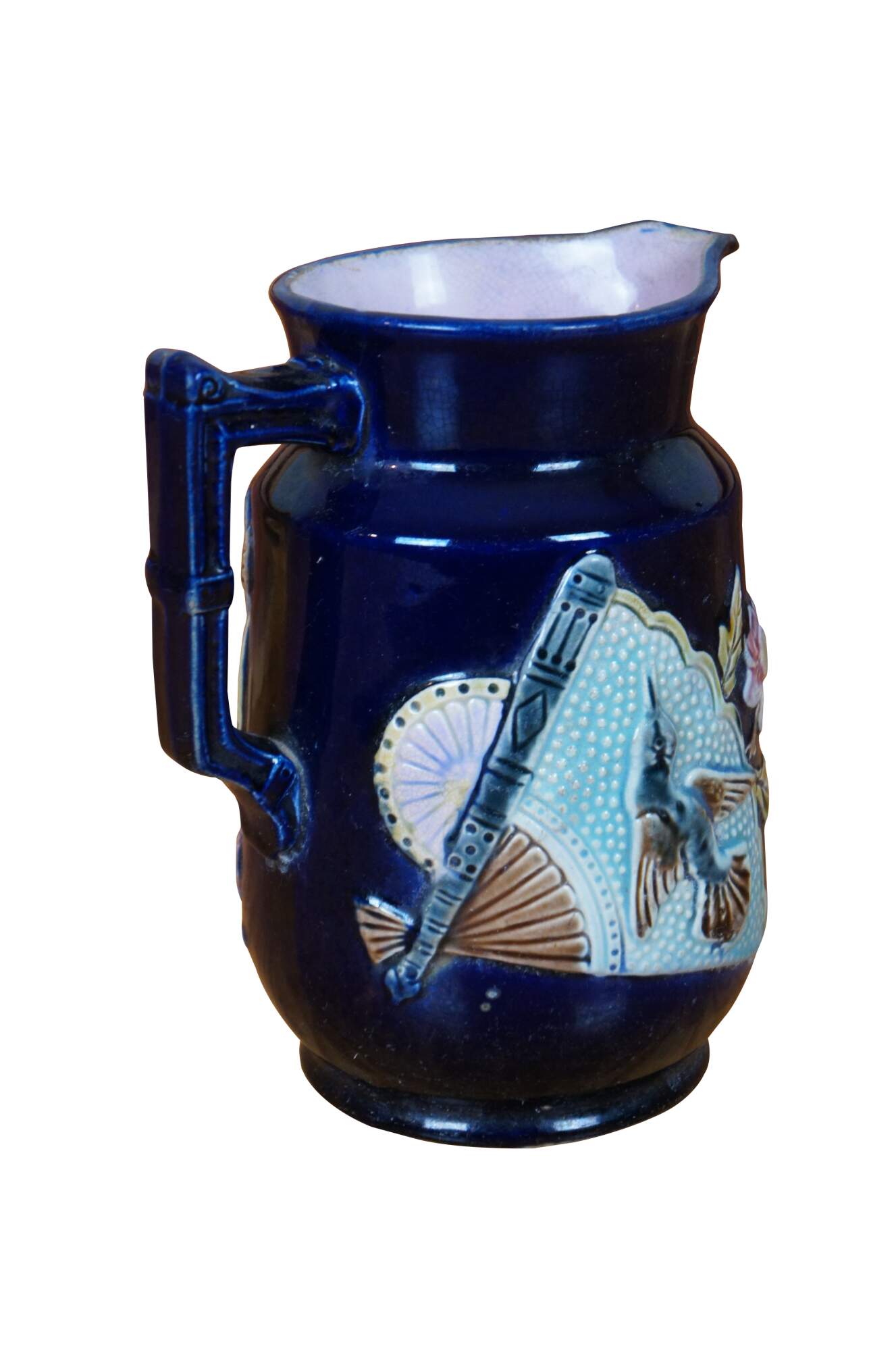 Antique Majolica creamer pitcher / jug featuring a deep cobalt blue glazed ground accented with a Chinese hand fan with hummingbirds and flowers. Attributed to Shorter & Boulton. Most of Shorter & Boulton designs had a strong Asian influence. One of the company’s earliest registered majolica designs was the Fan motif.