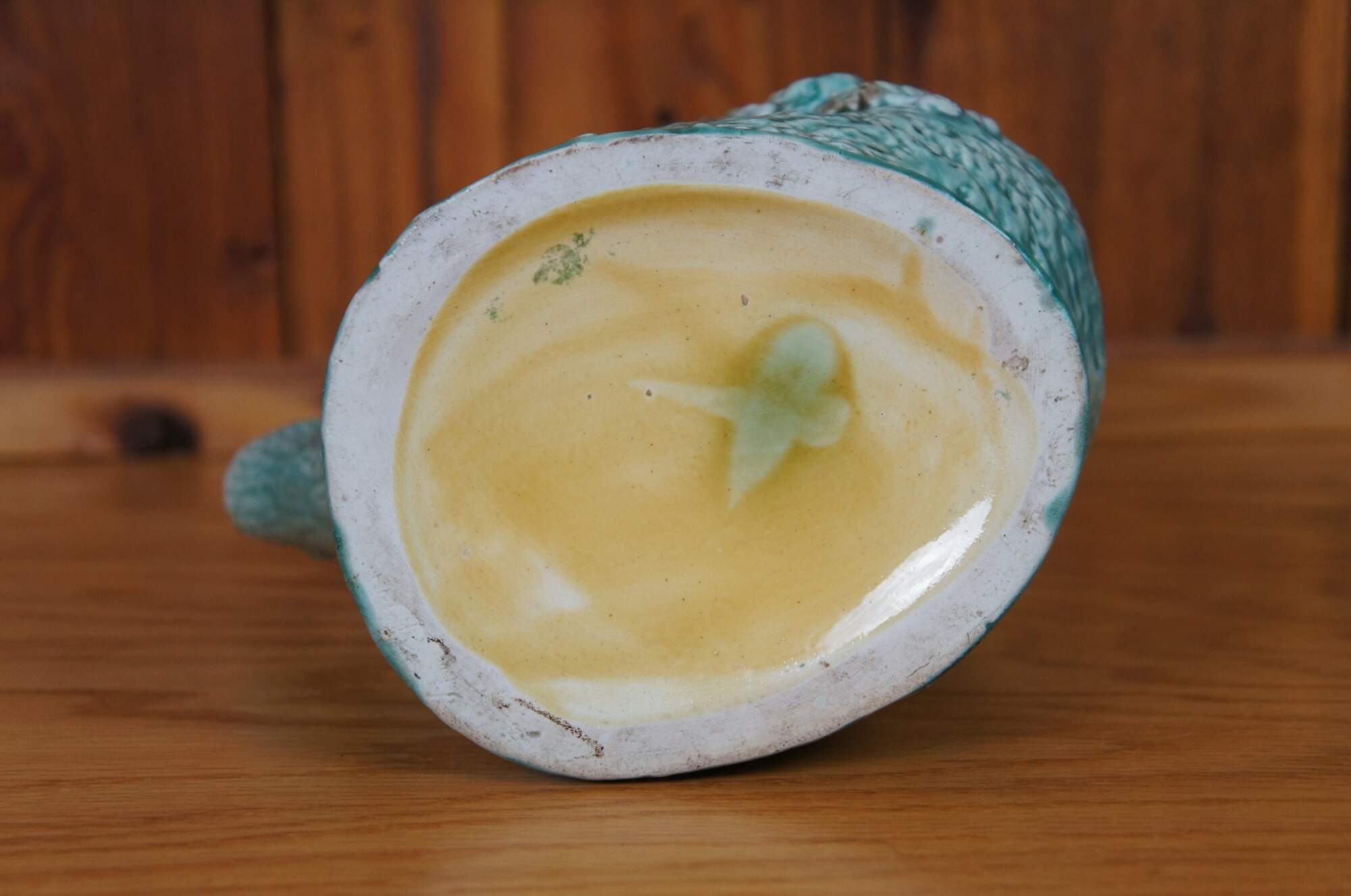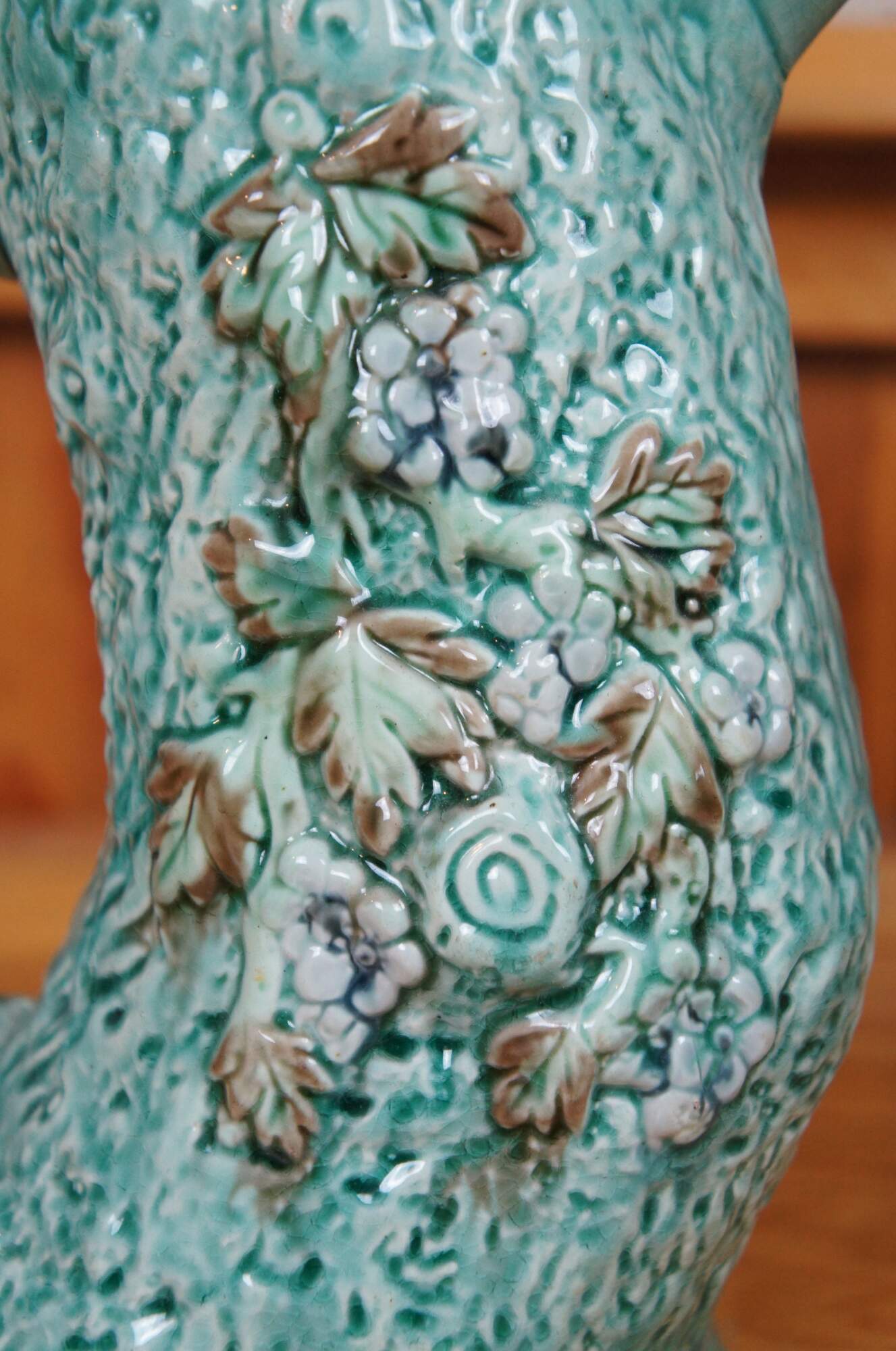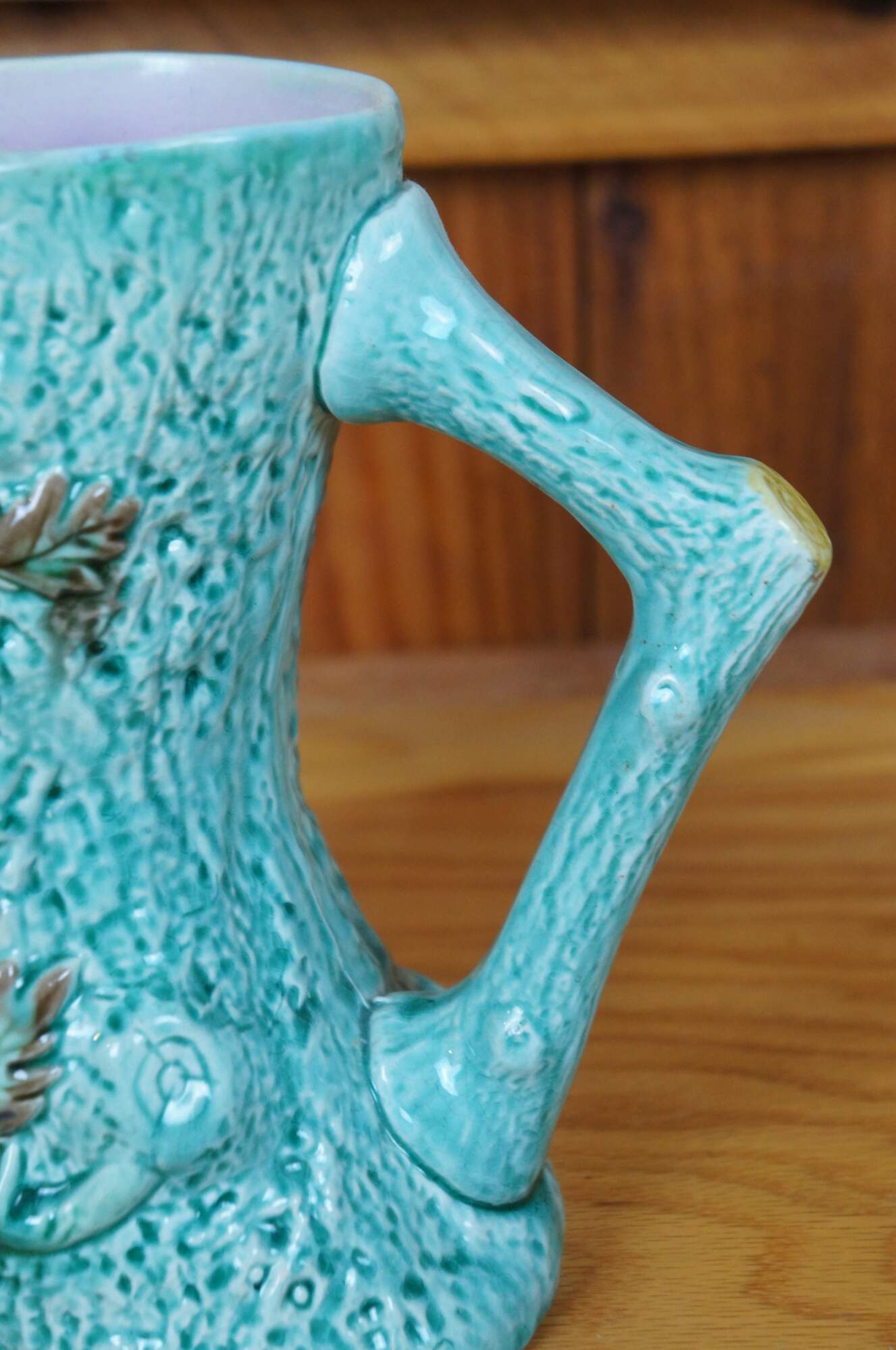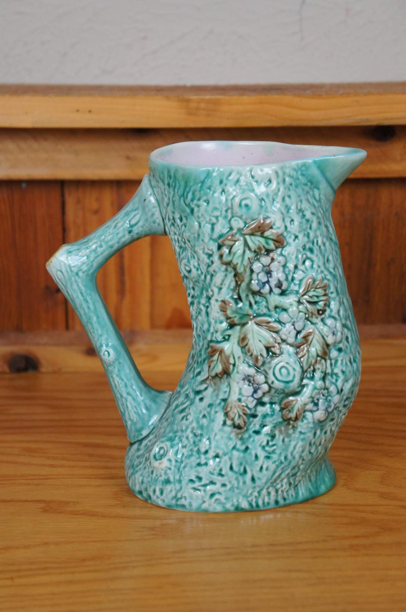 Antique Majolica adirondak style bentwood tree trunk / log / branch creamer pitcher / jug / carafe featuring a turquoise glaze over textured bark motif with flowers / leaves and purple lavender interior.