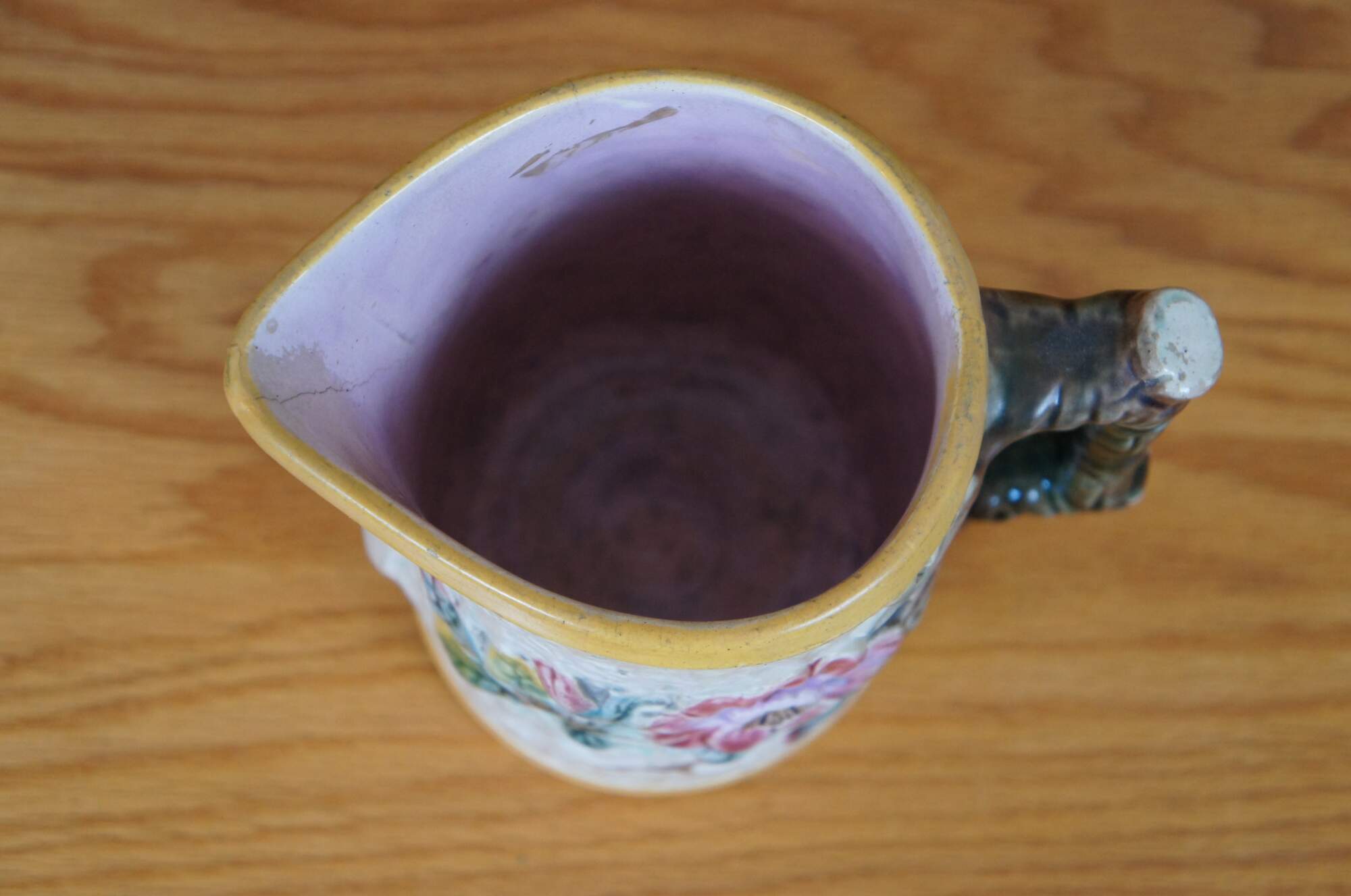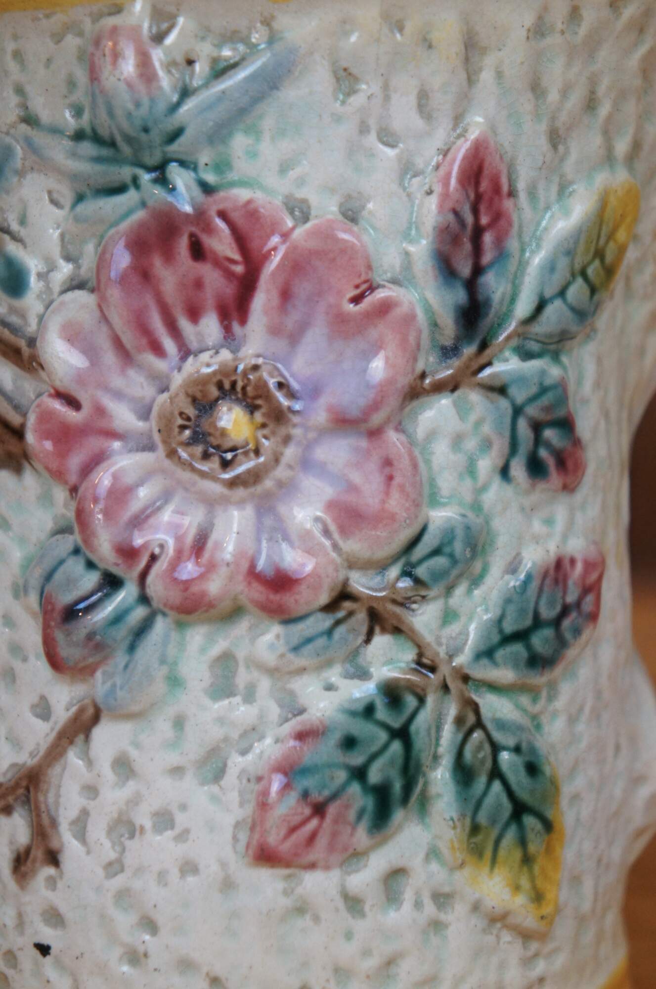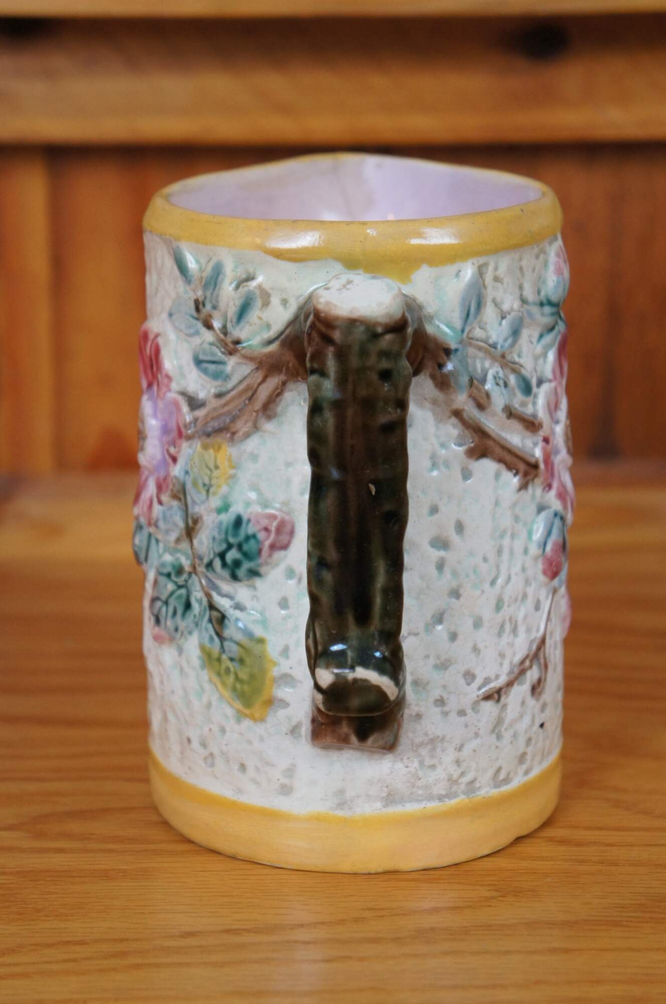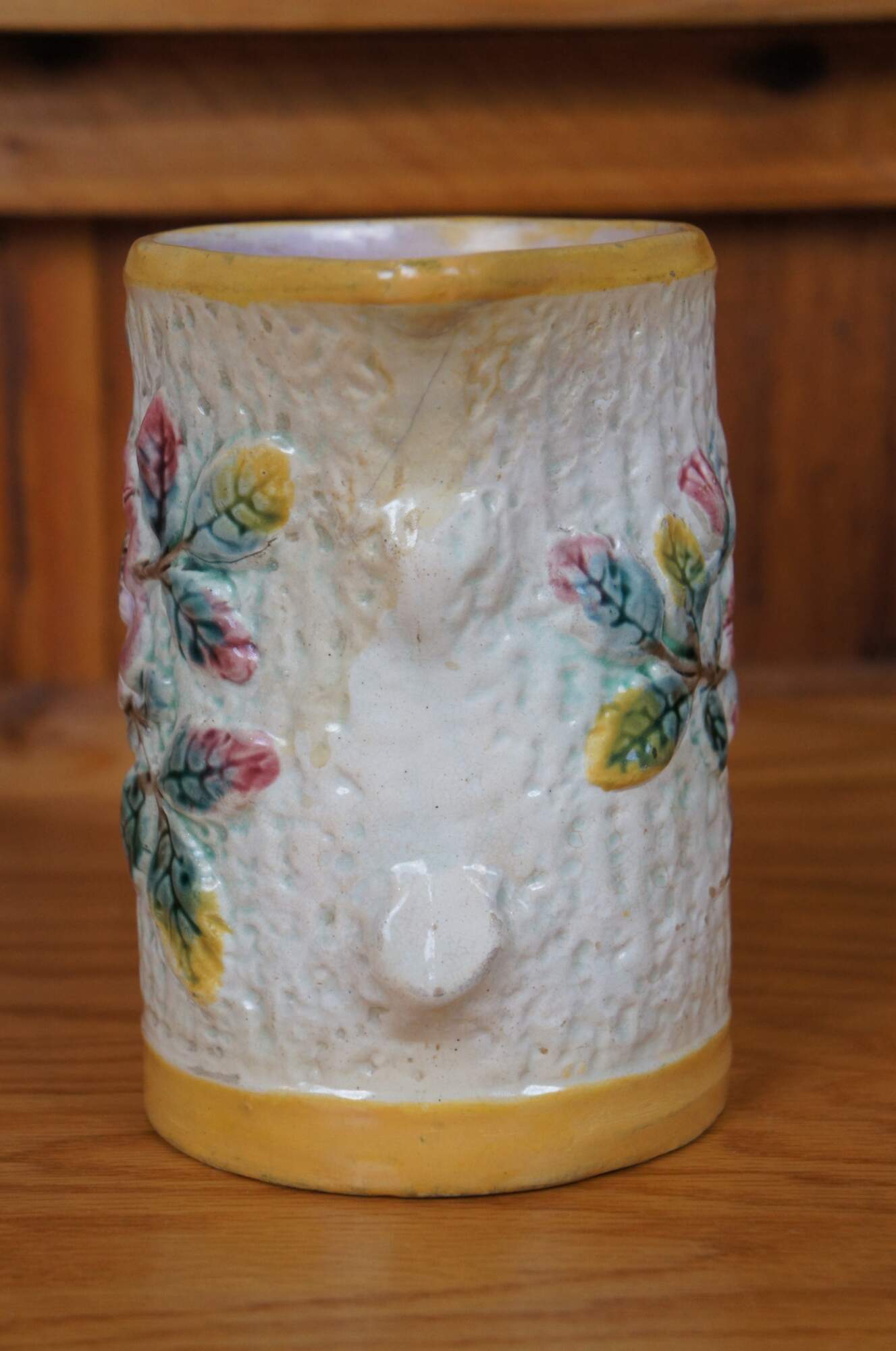 Antique Shorter & Boulton Majolica creamer pitcher / jug featuring a rustic tree bark motif with wild rose flowers and branch handle.