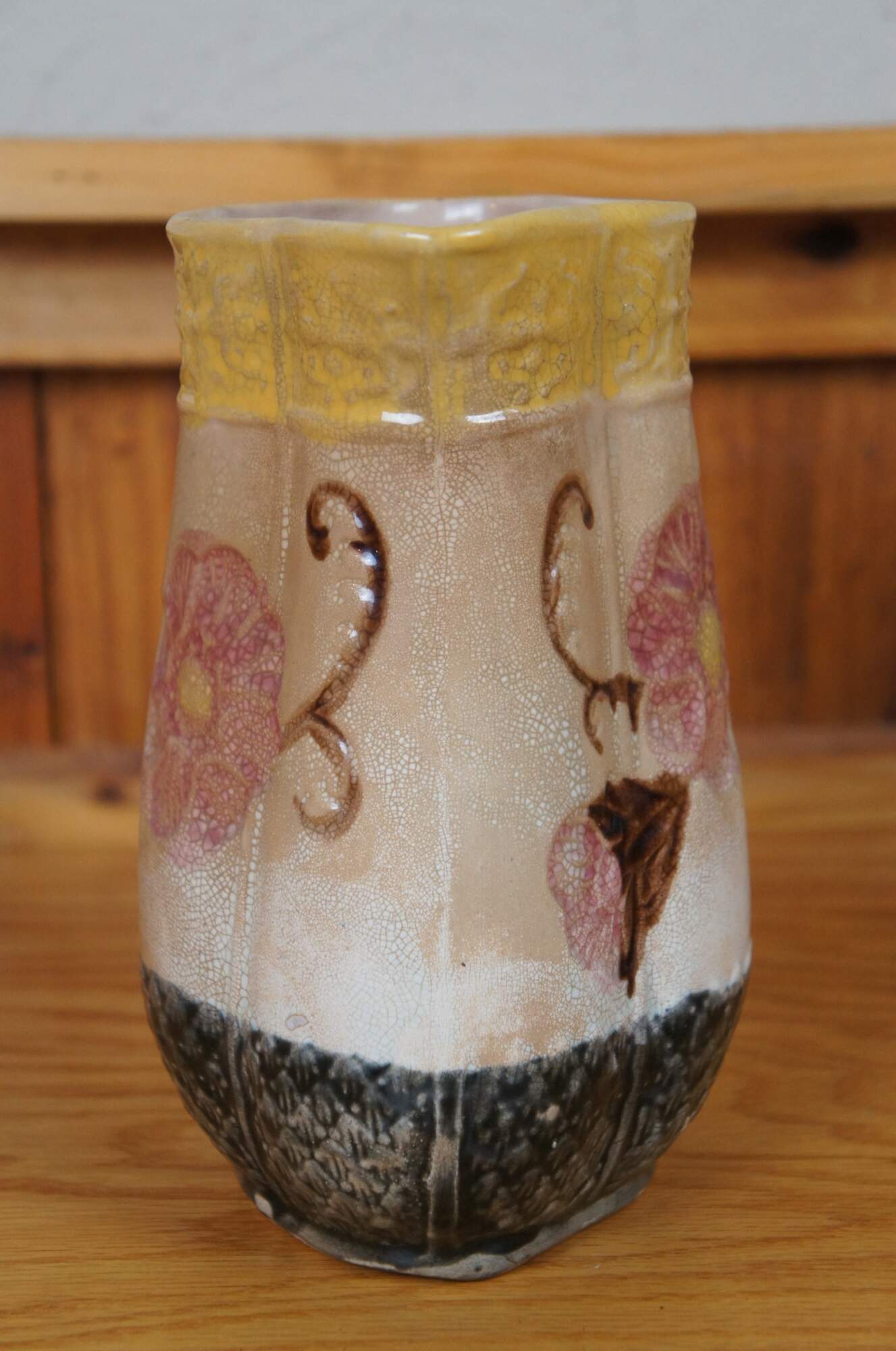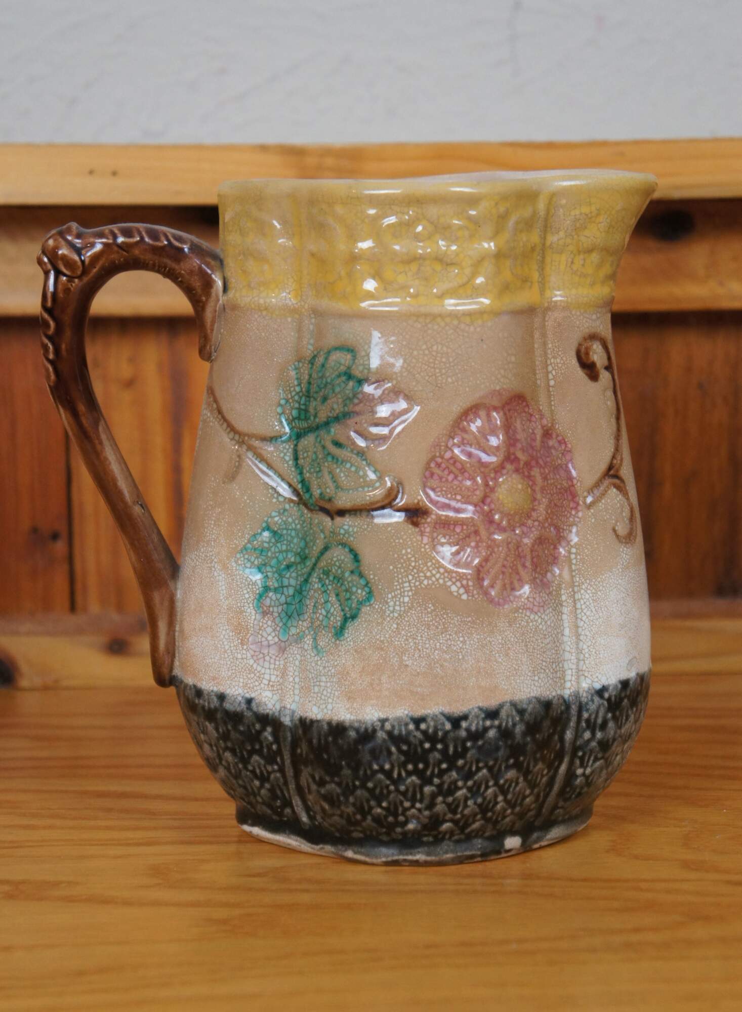 Antique Majolica creamer pitcher / jug featuring quatrefoil form with floral cherry blossom / dogwood theme and acanthus handle.