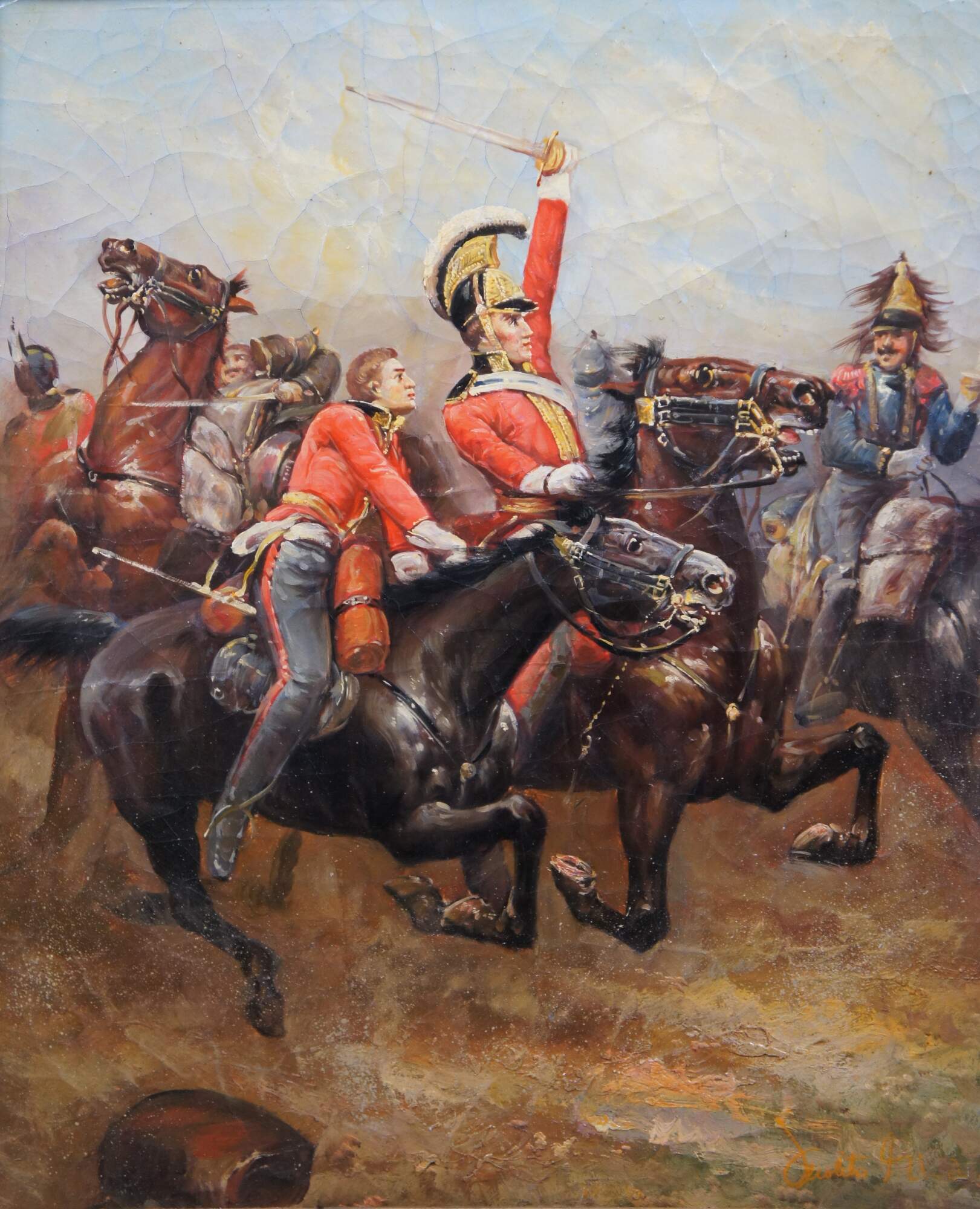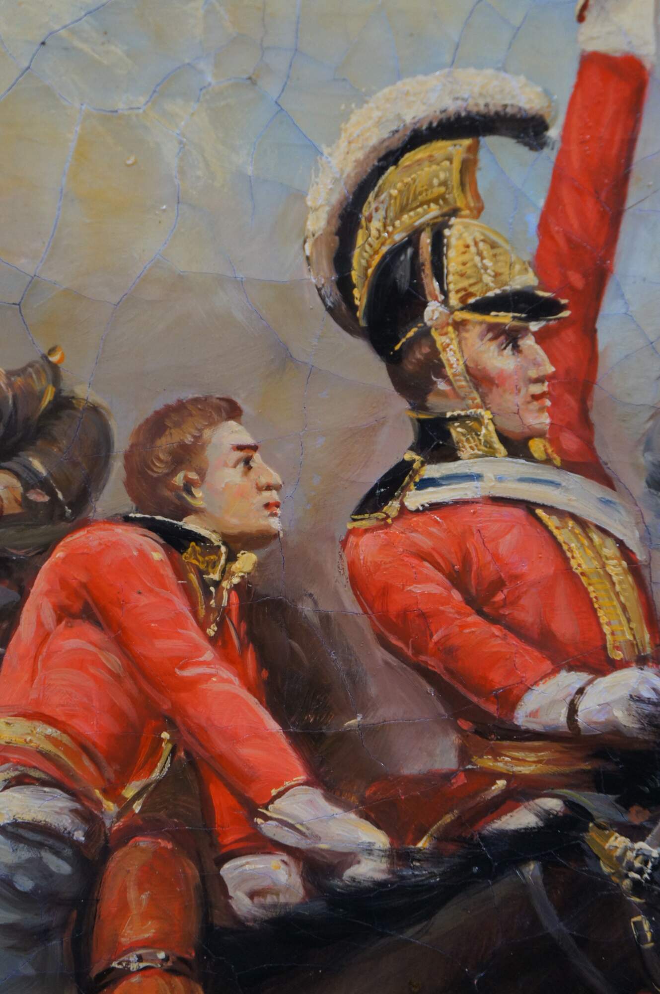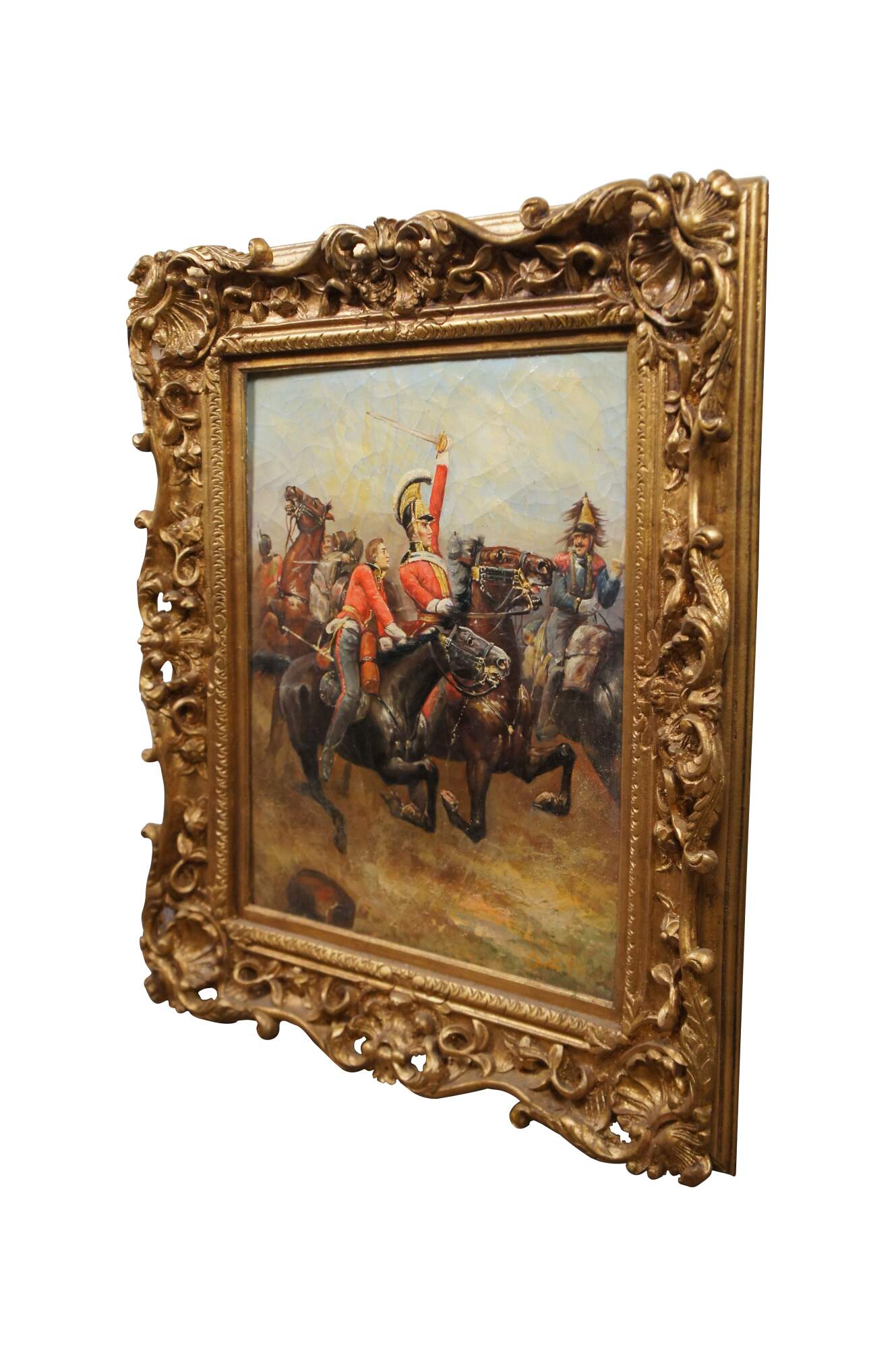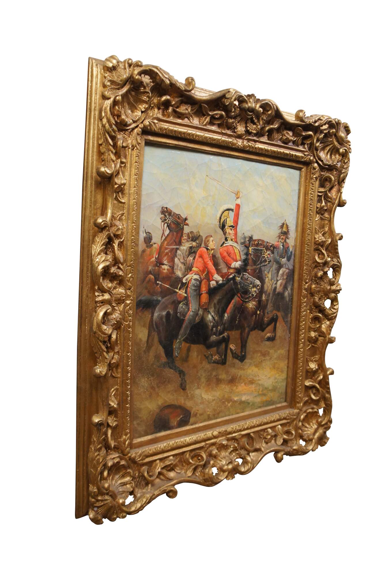 Late 20th century oil on linen painting after "Life Guards Charging at the Battle of Waterloo" by Richard Caton Woodville (first painted in 1899). Depicts a pair of red-coated soldiers from the 1st Regiment of Life Guards - a cavalry regiment in the British Army - in the midst of the 1815 Battle of Waterloo that marked the end of the Napoleonic Wars. Ornate foliate and scalloped cornered gilt resin frame. Signed in lower right corner.