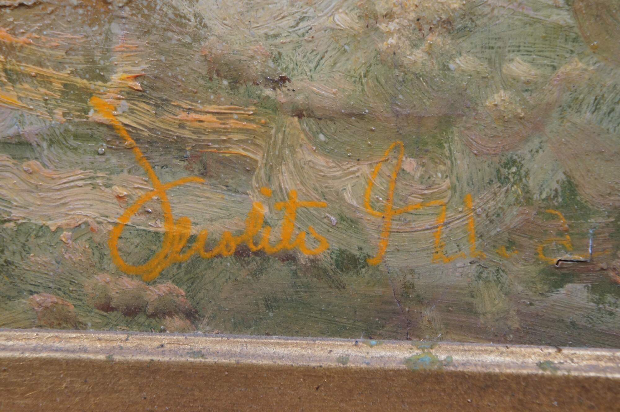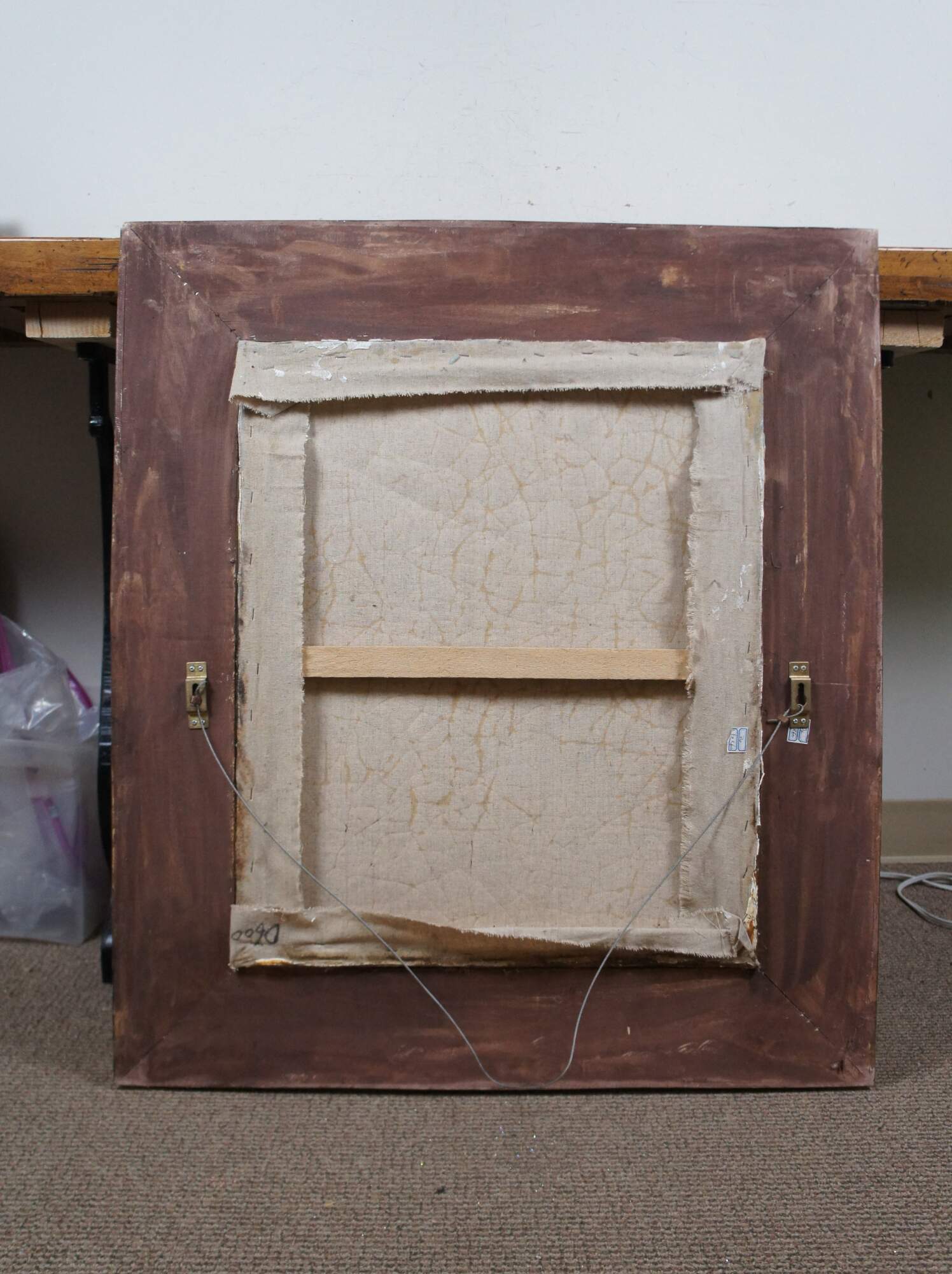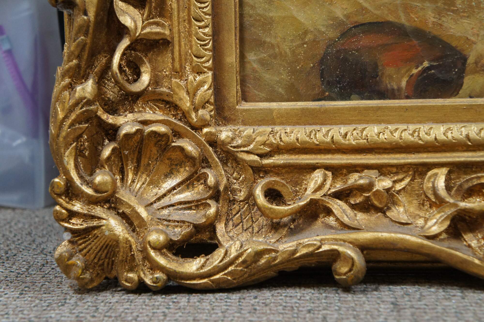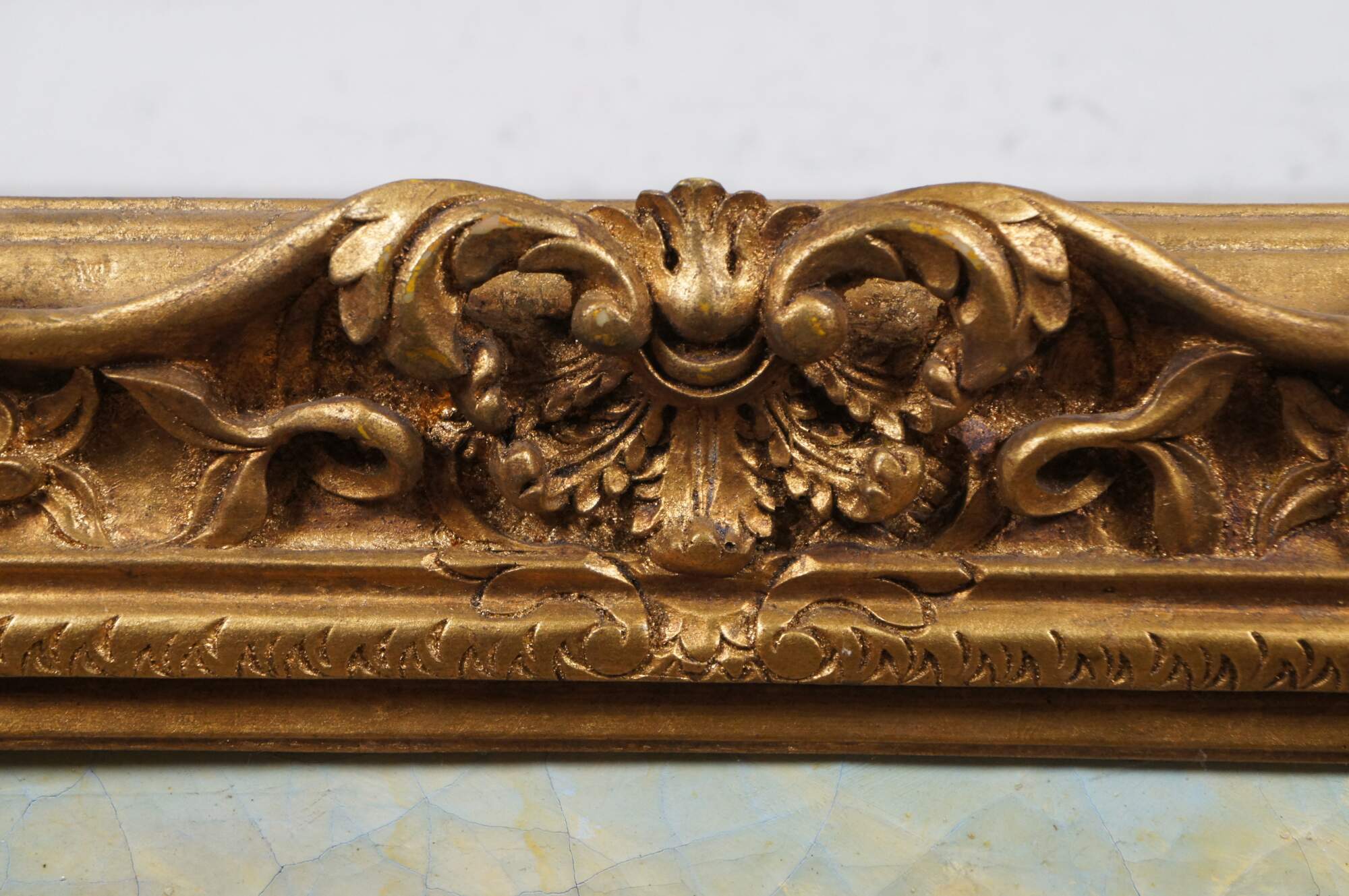 Late 20th century oil on linen painting after "Life Guards Charging at the Battle of Waterloo" by Richard Caton Woodville (first painted in 1899). Depicts a pair of red-coated soldiers from the 1st Regiment of Life Guards - a cavalry regiment in the British Army - in the midst of the 1815 Battle of Waterloo that marked the end of the Napoleonic Wars. Ornate foliate and scalloped cornered gilt resin frame. Signed in lower right corner.