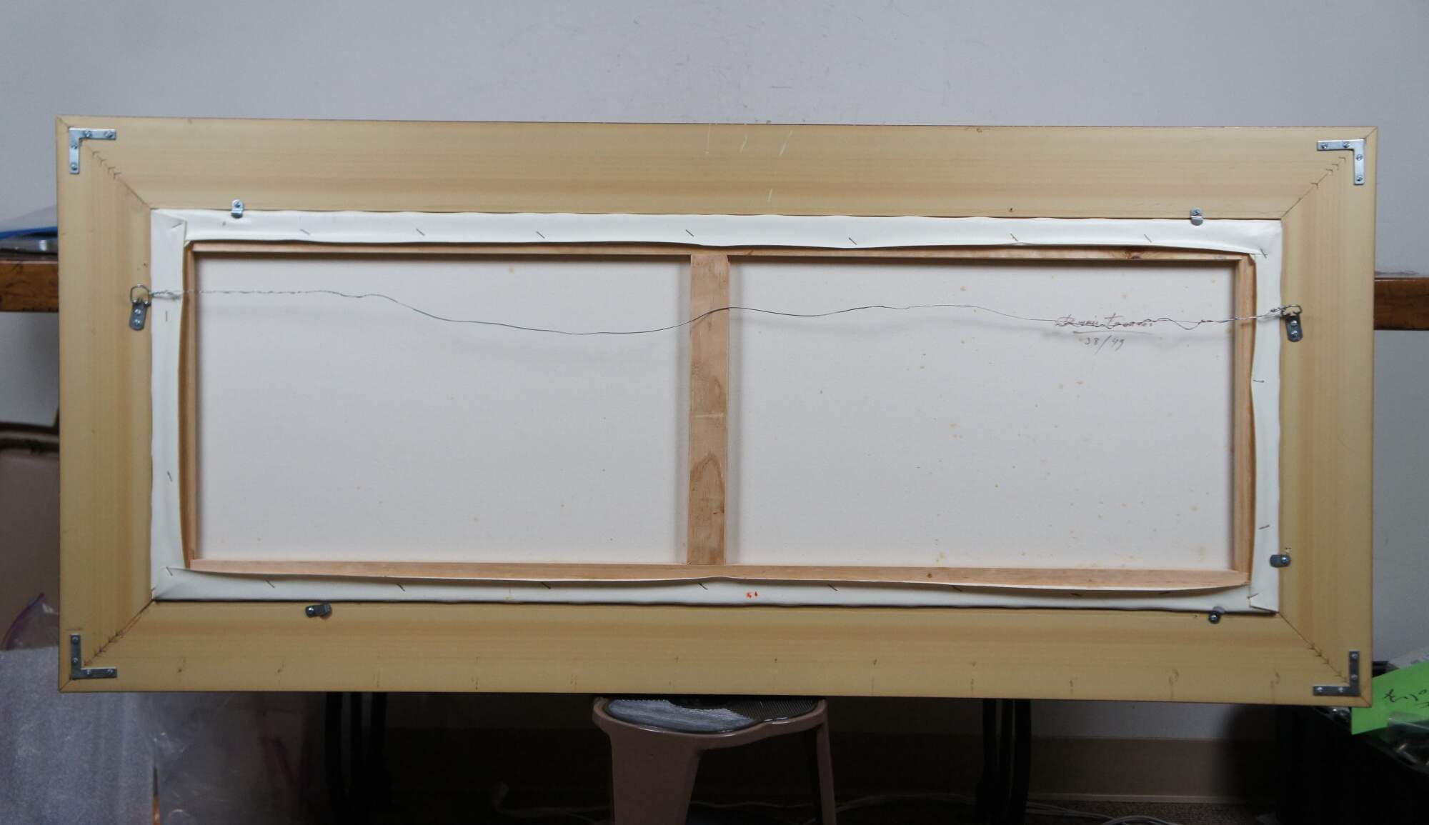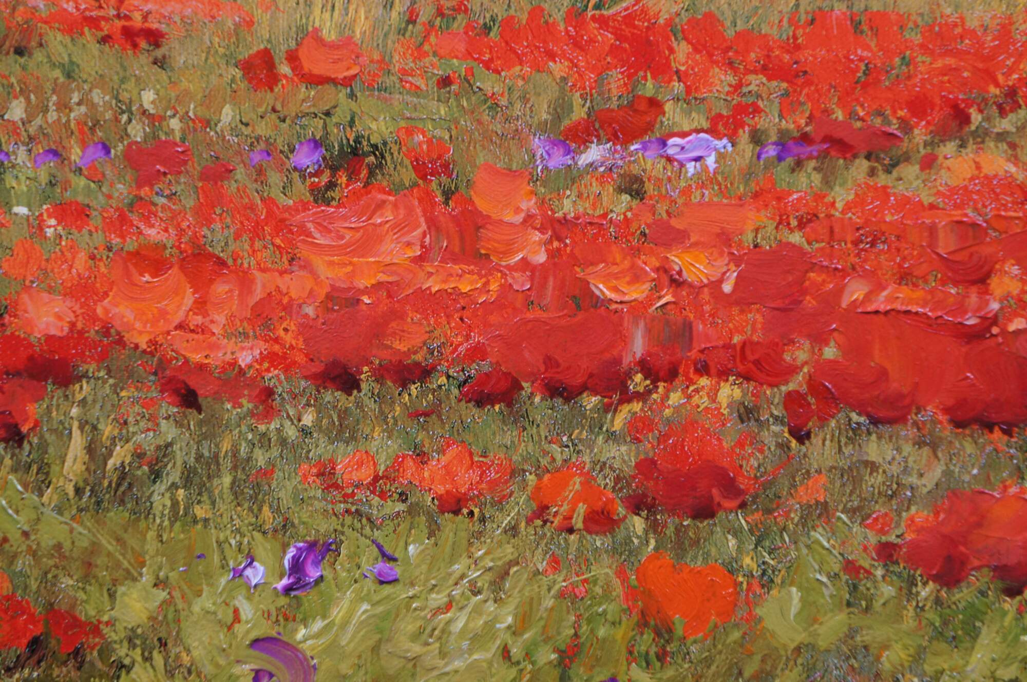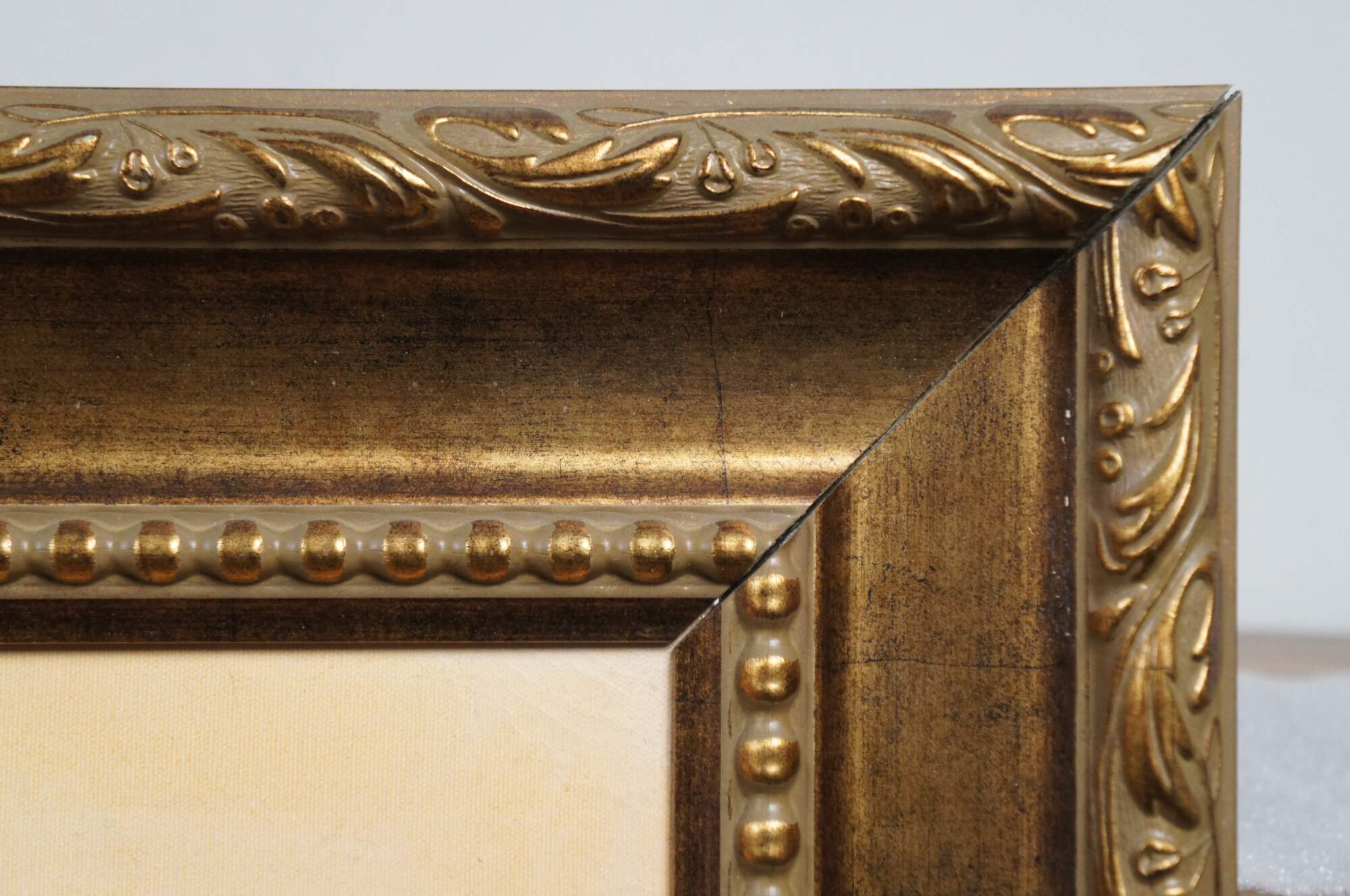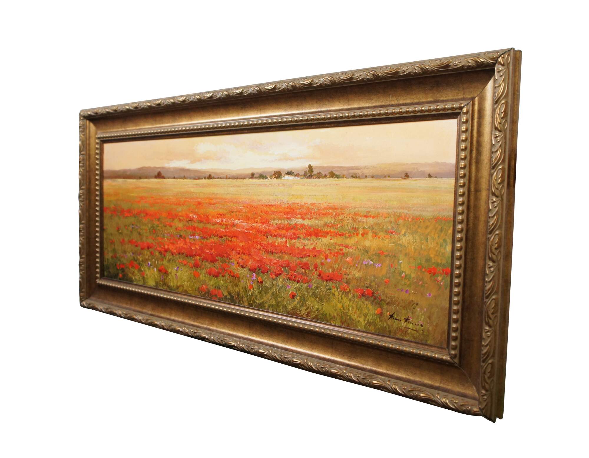 Very large and impressive late 20th century limited edition floral country landscape giclee on canvas, hand embellished with details in oil by artist Roman Frances. Signed in lower right. Numbered 38/49. Beveled gilt resin fame with foliate and beaded details.
